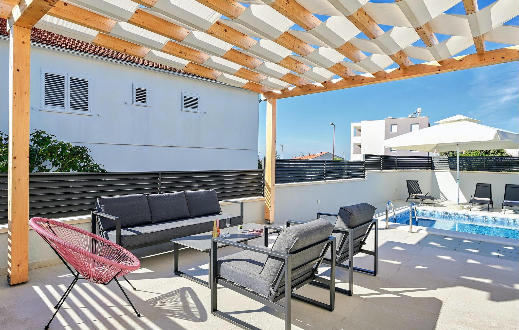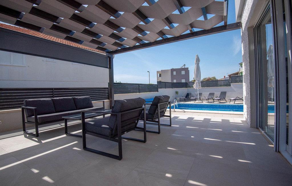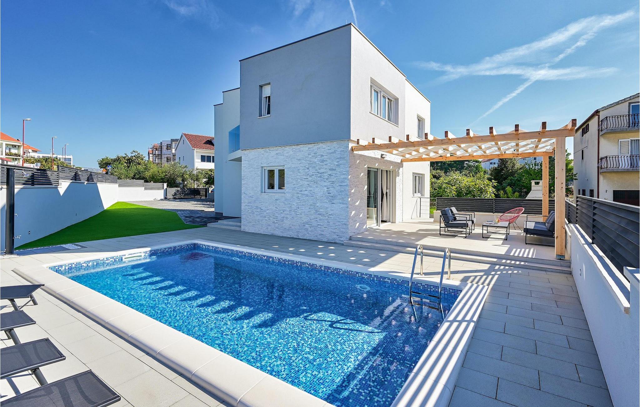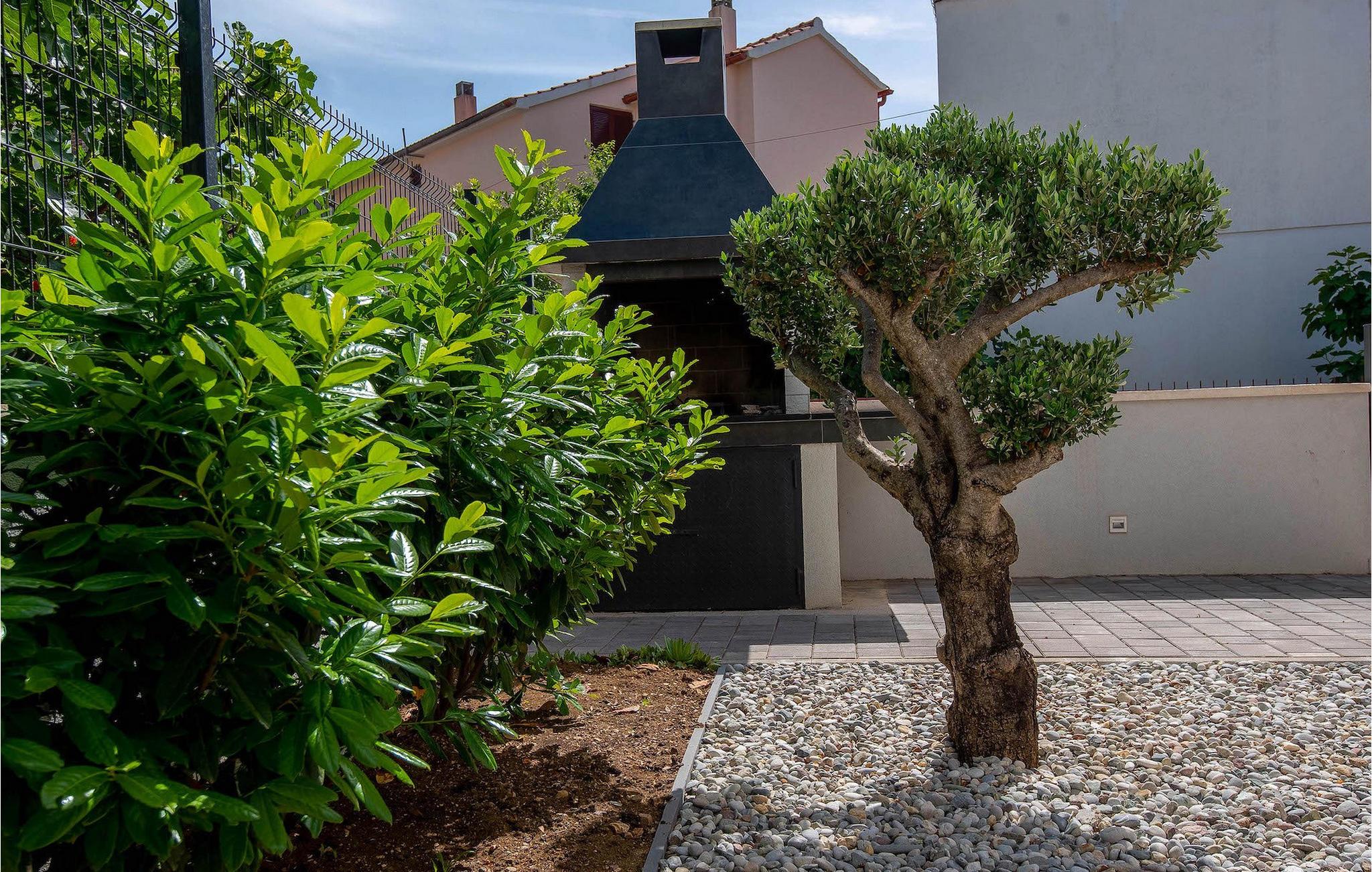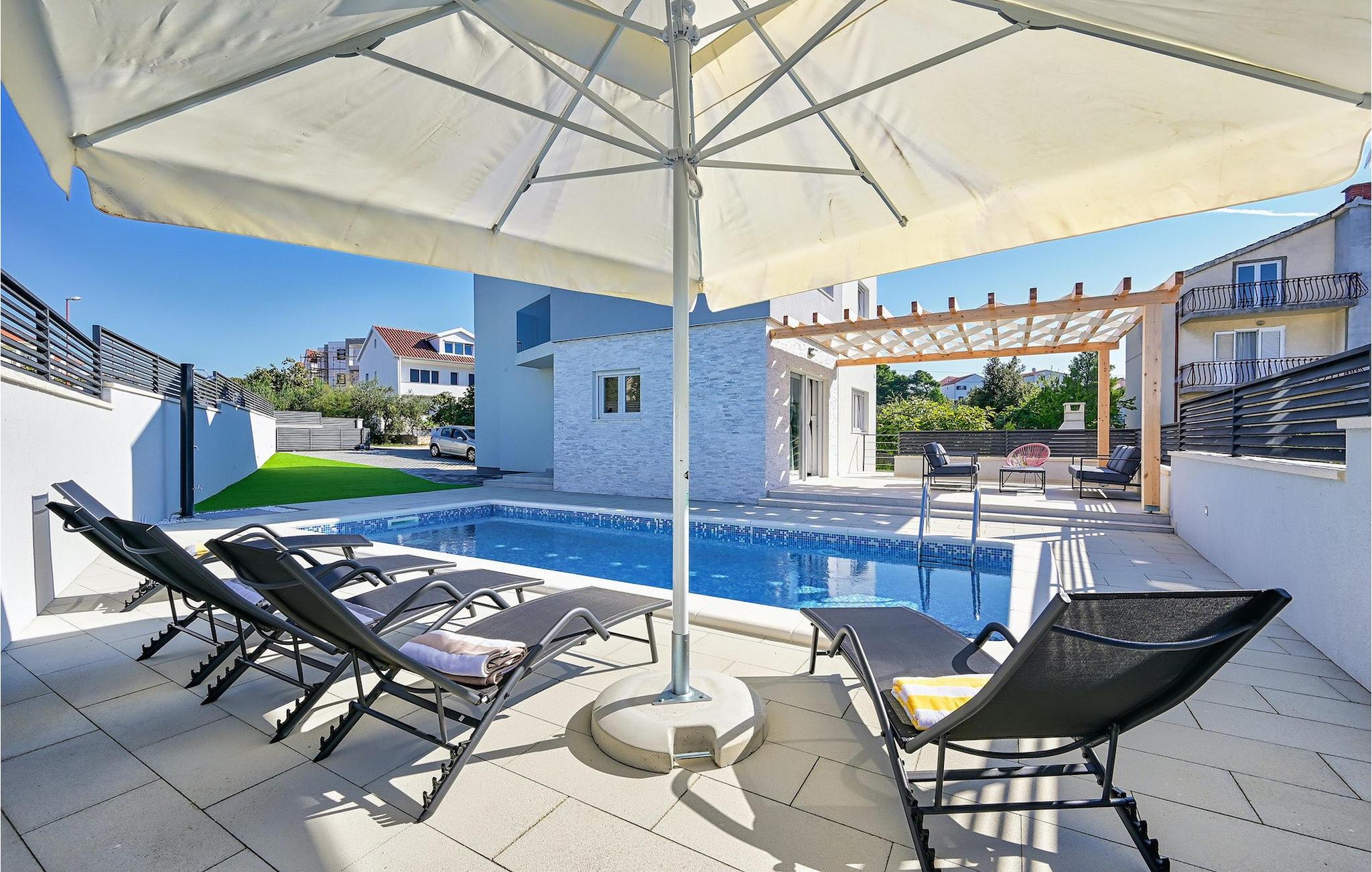 Fra første etasje har du direkte utgang til den inngjerdede hagen med privat basseng, grill og et herlig loungeområde. Det private bassenget er ideelt for forfriskninger på solfylte dager, omgitt av mange solsenger hvor du kan slappe av og sole deg mens barna leker. Ved siden av bassenget kan du også tilberede deilige måltider på grillen og nyte dem sammen med venner og familie.Brodarica er en ekte ferieoase på Sibenik-rivieraen. Den lille byen har en 4 km lang kystlinje med rullesteinstrender, butikker, restauranter og kafeer. Brodarica-stranden er en moderne, velutstyrt familiestrand med alle nødvendige fasiliteter. Stranden har blant annet sandvolleyballbane, lekeplass, utendørs treningsutstyr, basketballbane og strandpromenade.