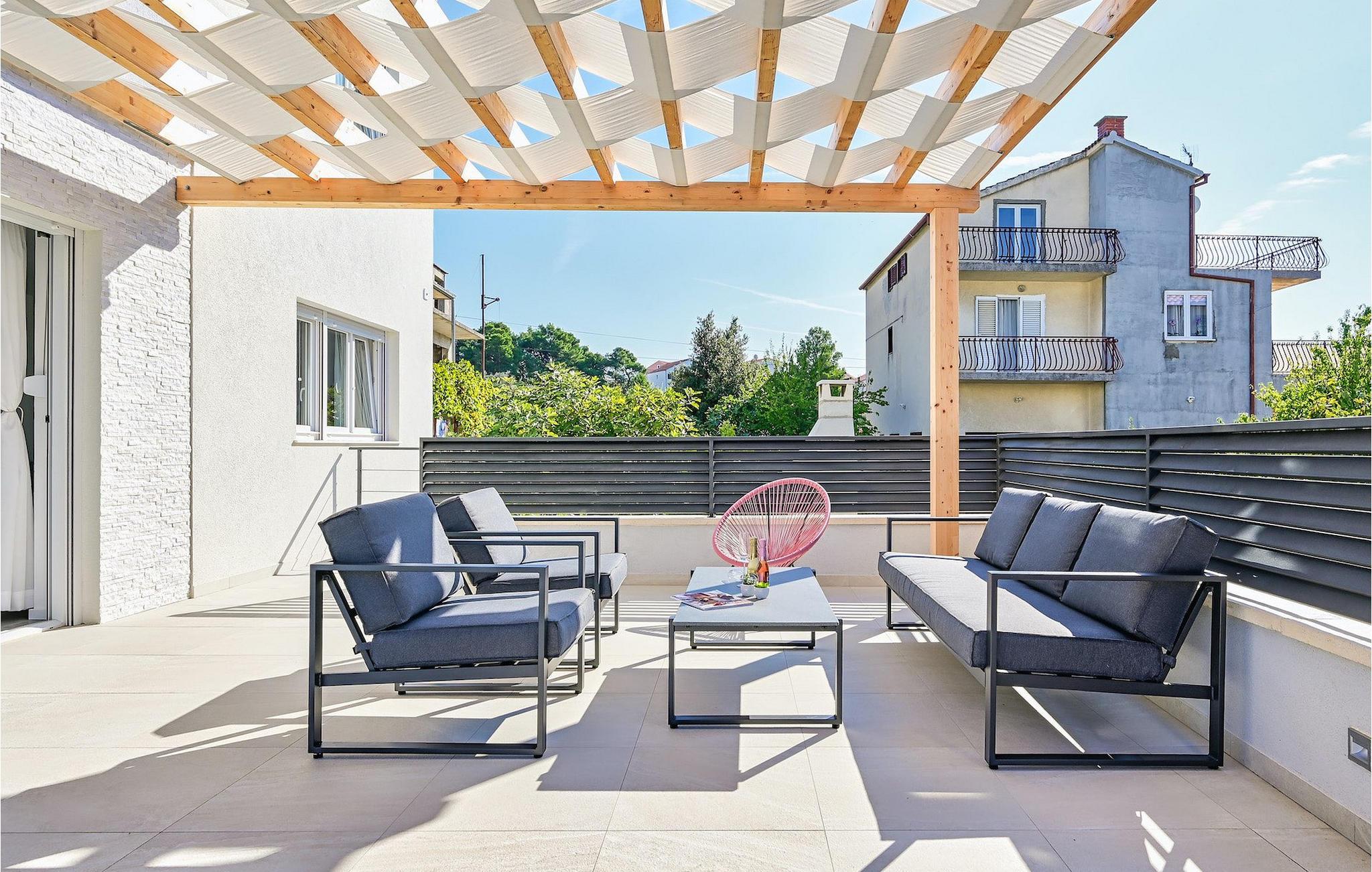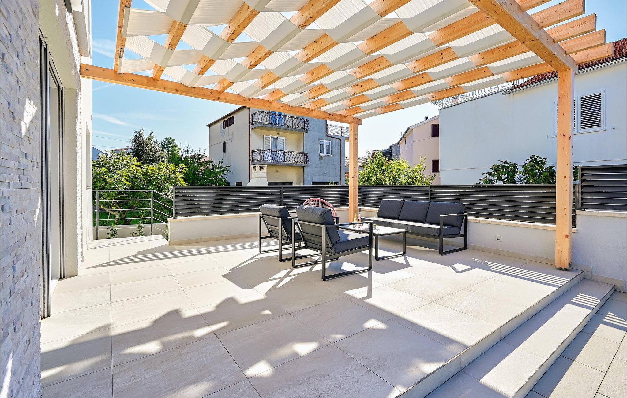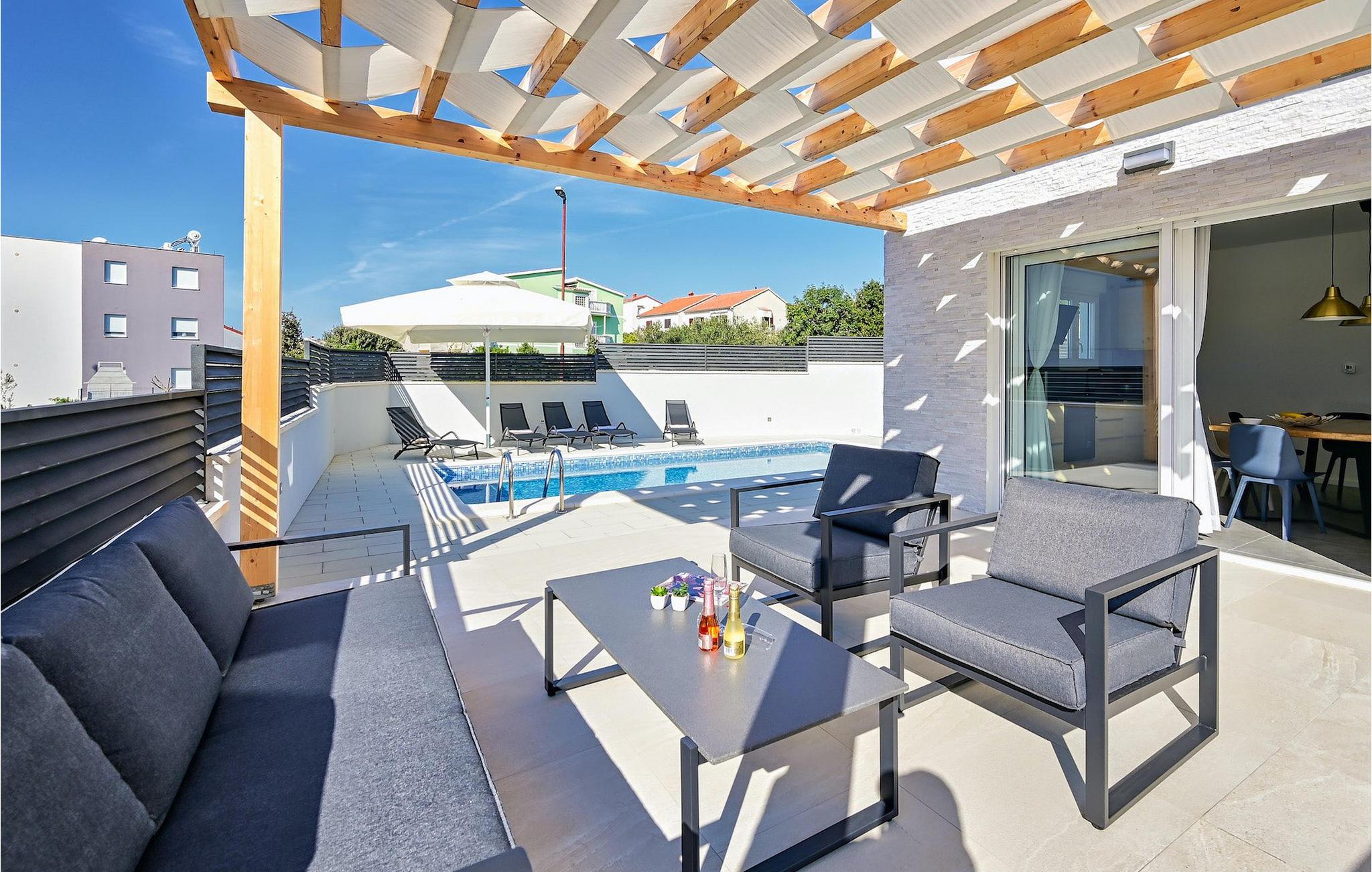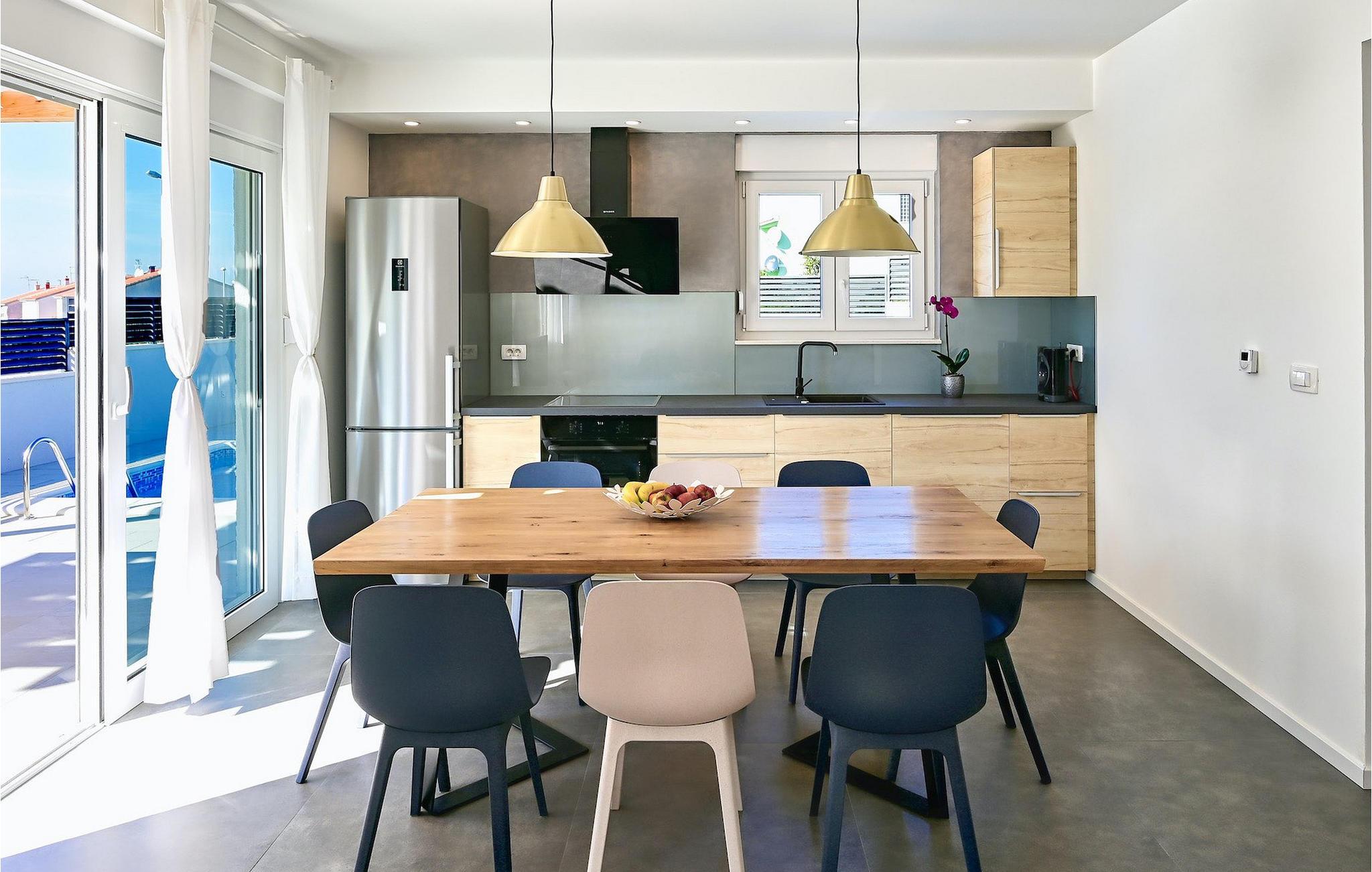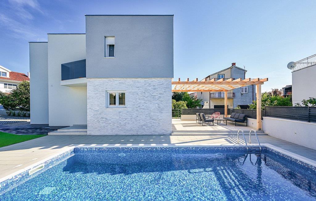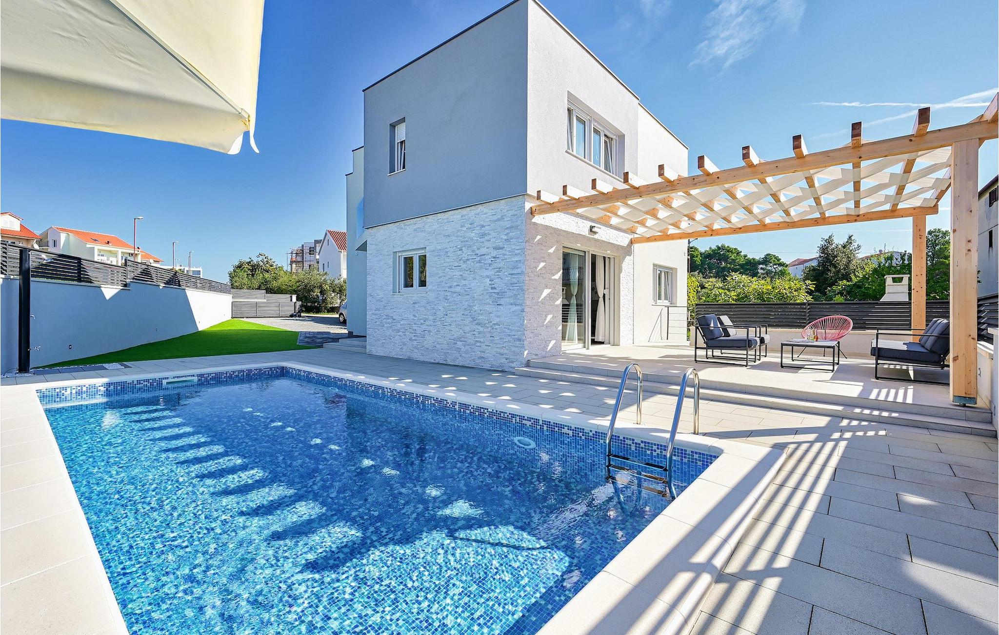 Fra første etasje har du direkte utgang til den inngjerdede hagen med privat basseng, grill og et herlig loungeområde. Det private bassenget er ideelt for forfriskninger på solfylte dager, omgitt av mange solsenger hvor du kan slappe av og sole deg mens barna leker. Ved siden av bassenget kan du også tilberede deilige måltider på grillen og nyte dem sammen med venner og familie.Brodarica er en ekte ferieoase på Sibenik-rivieraen. Den lille byen har en 4 km lang kystlinje med rullesteinstrender, butikker, restauranter og kafeer. Brodarica-stranden er en moderne, velutstyrt familiestrand med alle nødvendige fasiliteter. Stranden har blant annet sandvolleyballbane, lekeplass, utendørs treningsutstyr, basketballbane og strandpromenade.