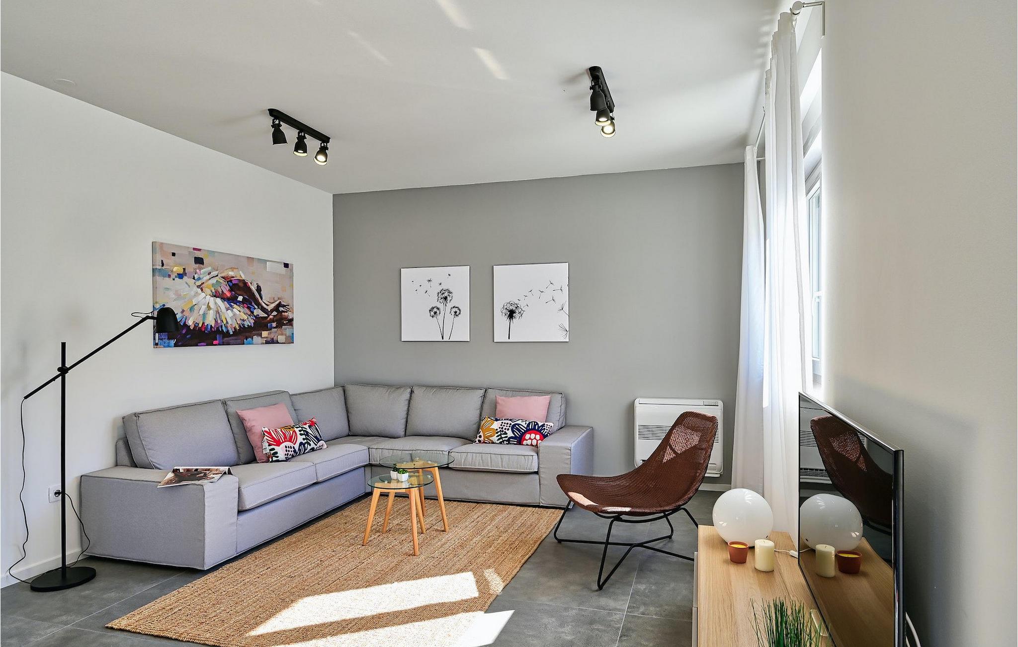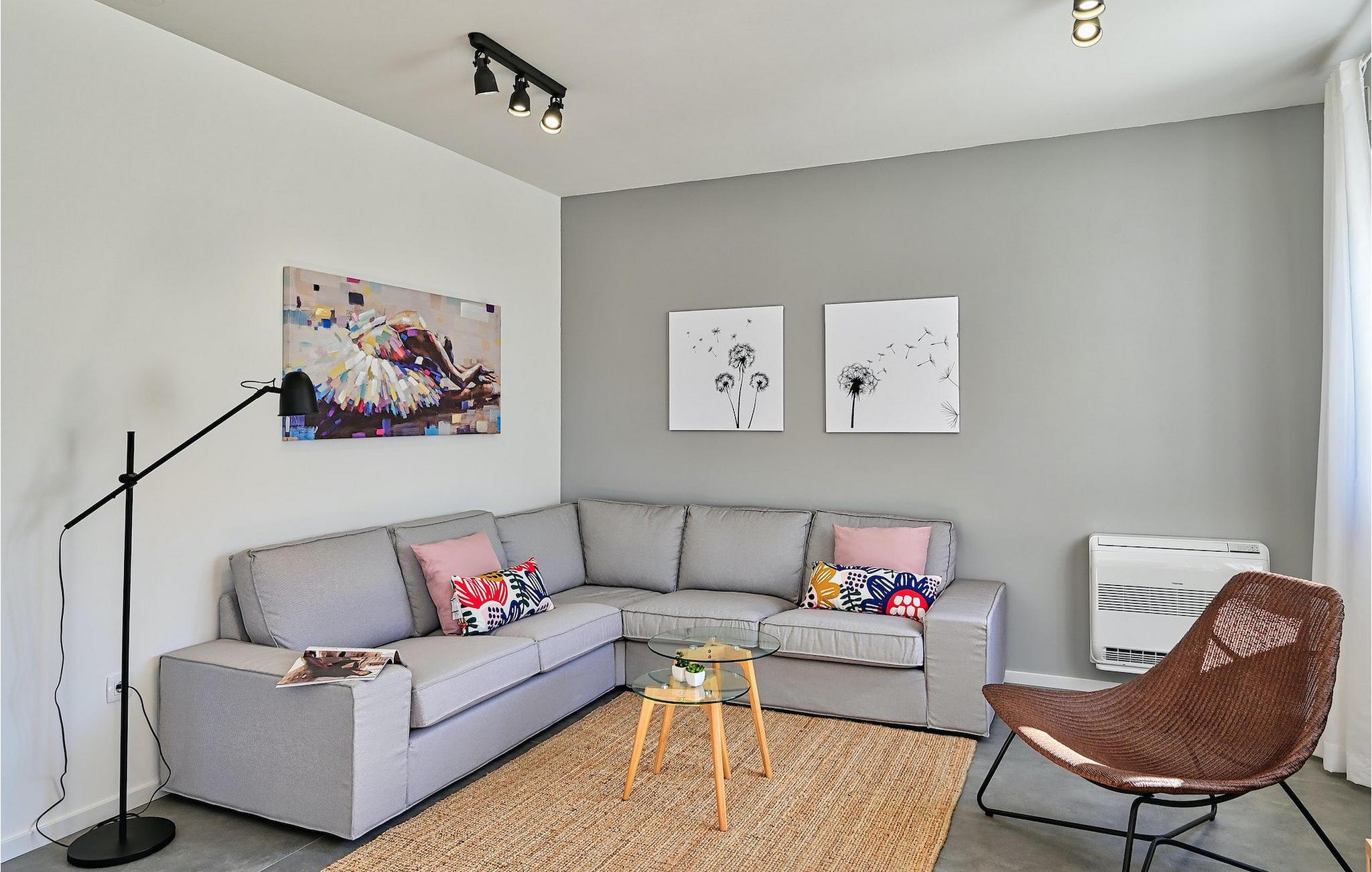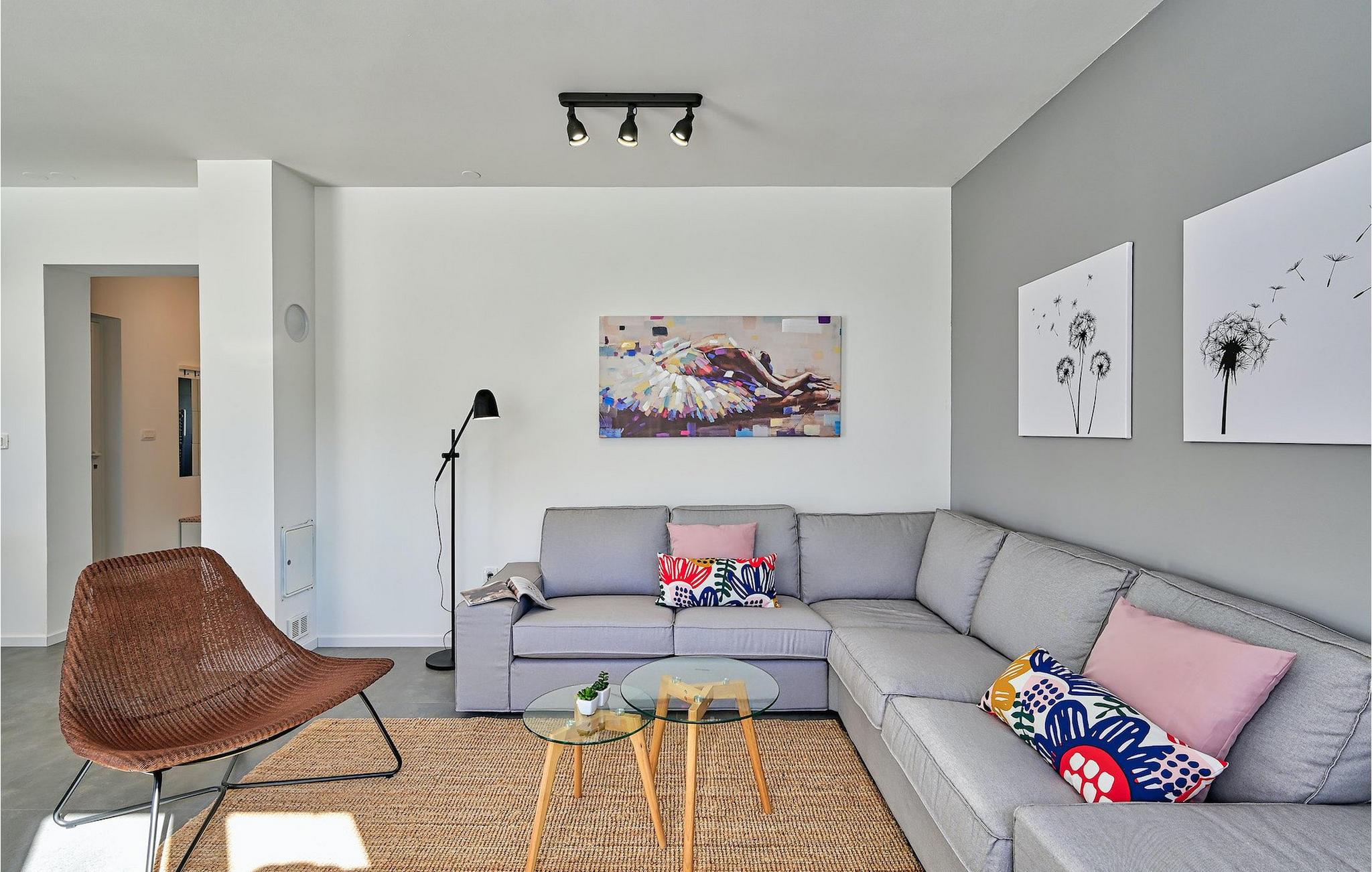 I første etasje finner du en koselig åpen stue- og spisestue samt et fullt utstyrt kjøkken med utsikt over hagen. I første etasje er det også et soverom med dobbeltseng og et bad. I andre etasje er det tre soverom, hvorav ett har eget bad. To av rommene har dobbeltseng, og ett har to enkeltsenger. I første etasje finner du også et annet separat bad. Alle soverommene har TV og klimaanlegg for total komfort.