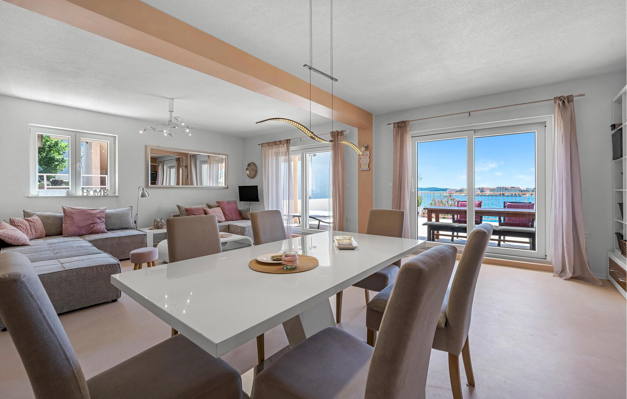 Denne smakfullt innredede ferieleiligheten ligger så nær stranden at du nesten kan se det turkise havvannet rett utenfor døren som badekaret ditt. Lag middelhavsretter på det åpne kjøkkenet, planlegg aktivitetene dine i det hyggelige oppholdsrommet og se favorittserien din i den koselige sofaen om kvelden etter en solrik dag.