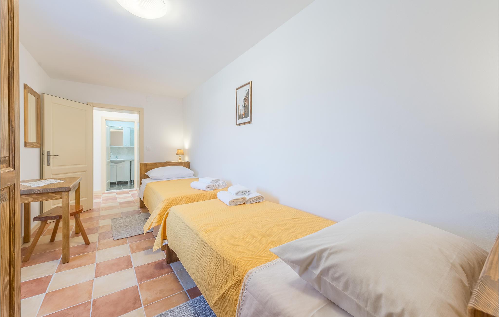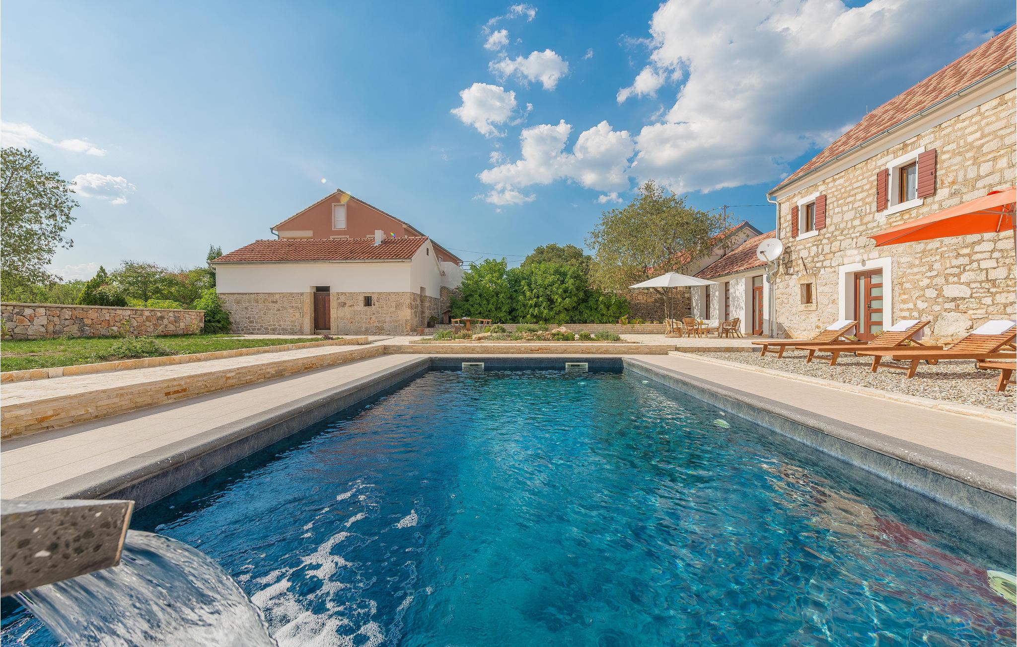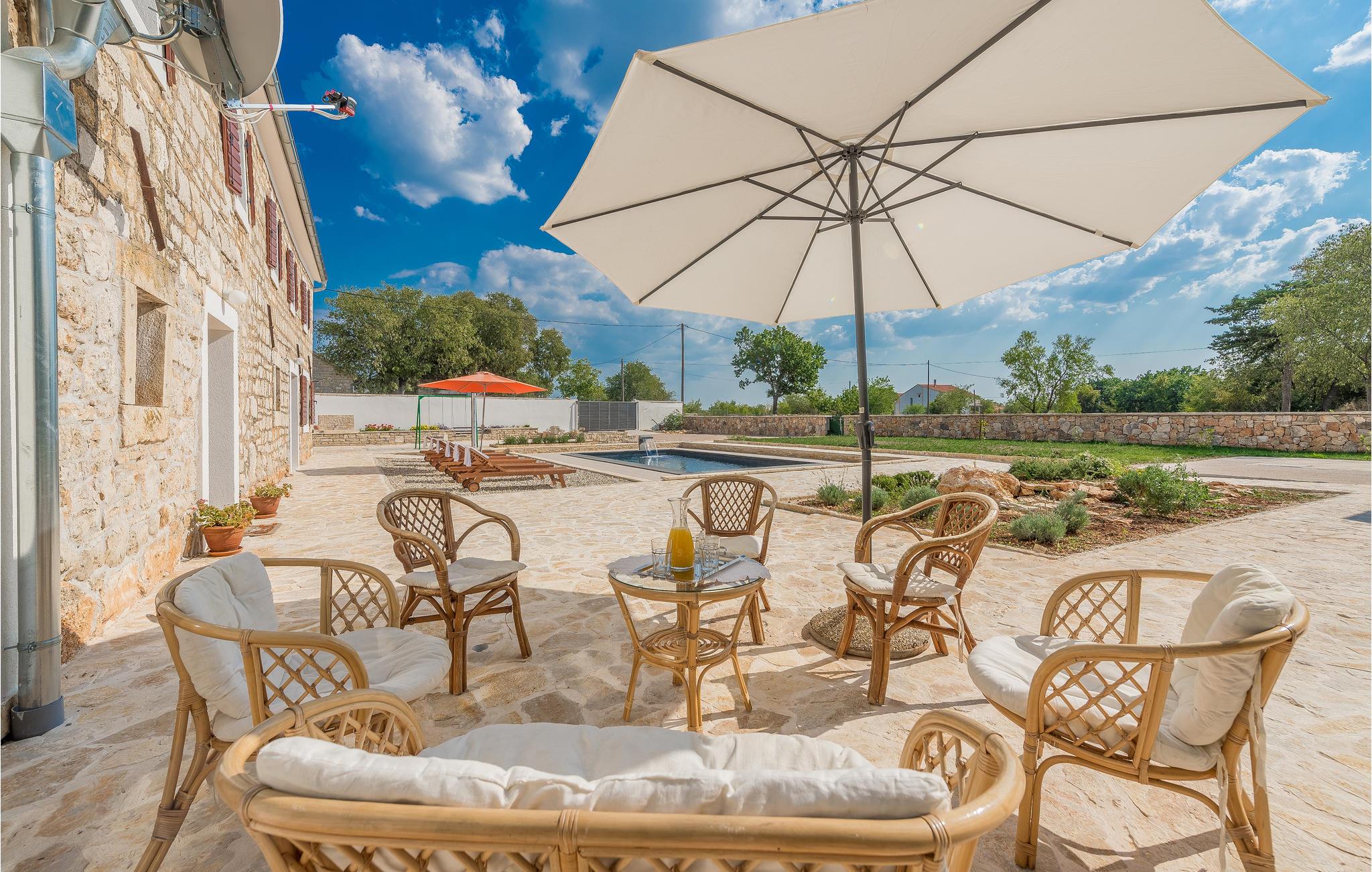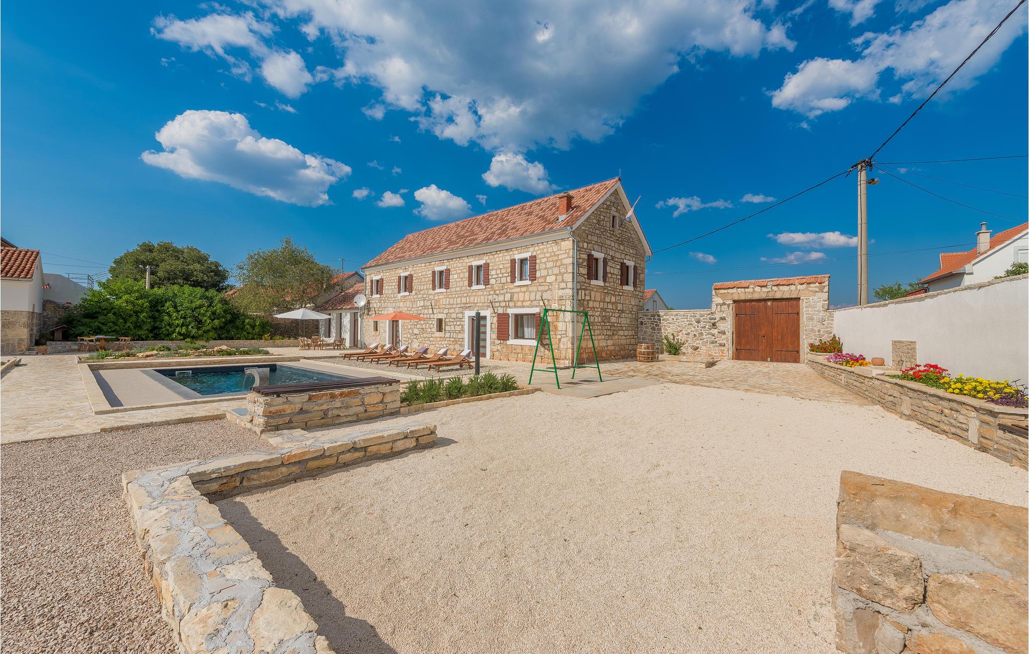 Dette autentiske steinhuset ligger i nærheten av elven Krka, i den lille og fredelige landsbyen Itluk. Det består av to etasjer som er forbundet med innvendige trapper, og er det ideelle valget for en familieferie. Du kan kjøle deg ned i det store bassenget eller slappe av i den vakre hagen. Hvis du er ute etter sommerfornøyelser, kan du besøke byen Sibenik og de nylig rekonstruerte festningene, som byr på spektakulær utsikt. Besøk det berømte Solaris Resort, som er kjent for sin vakre sandstrand, som har fått nasjonal anerkjennelse som den beste stranden i Adriaterhavet.