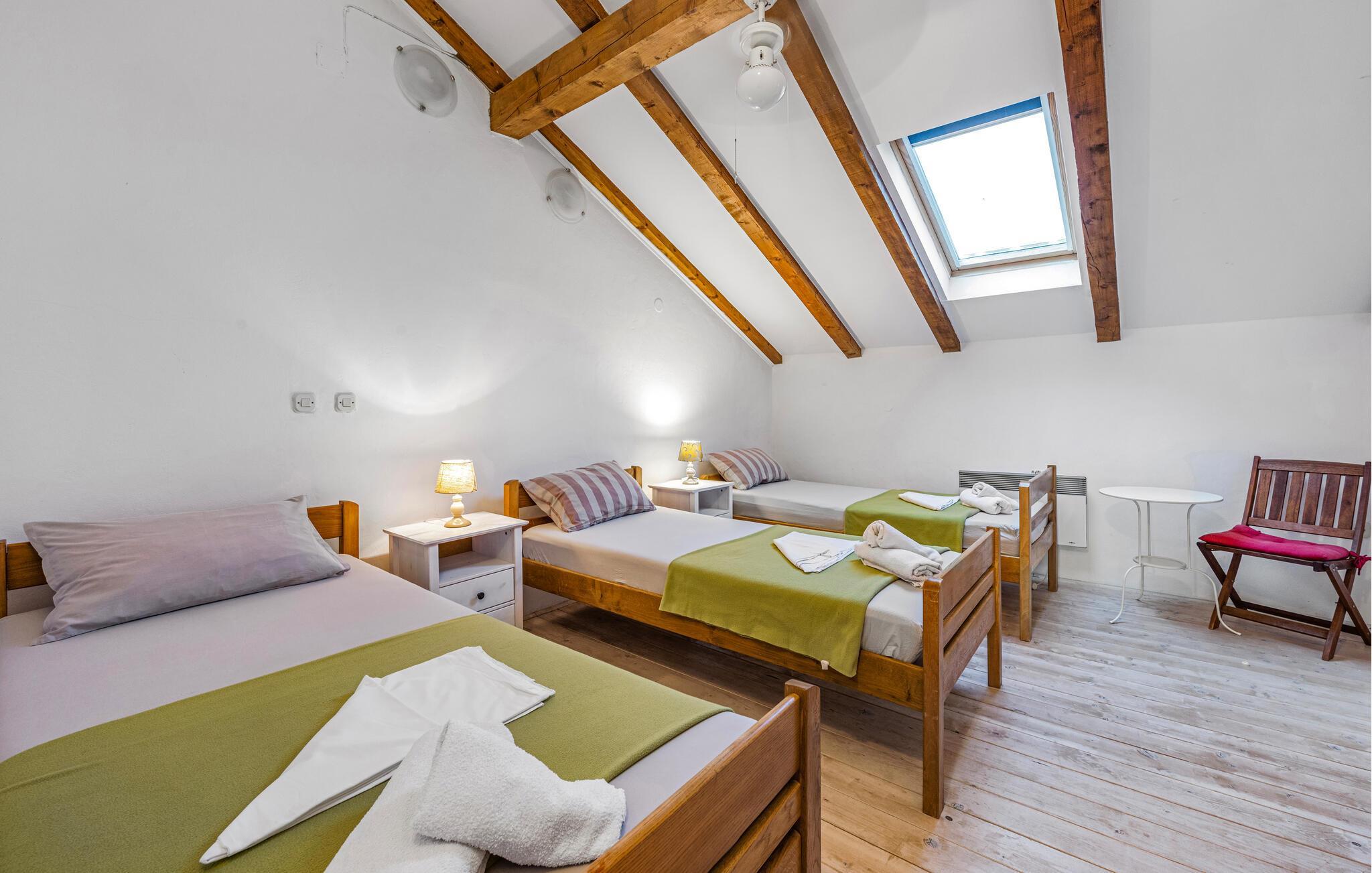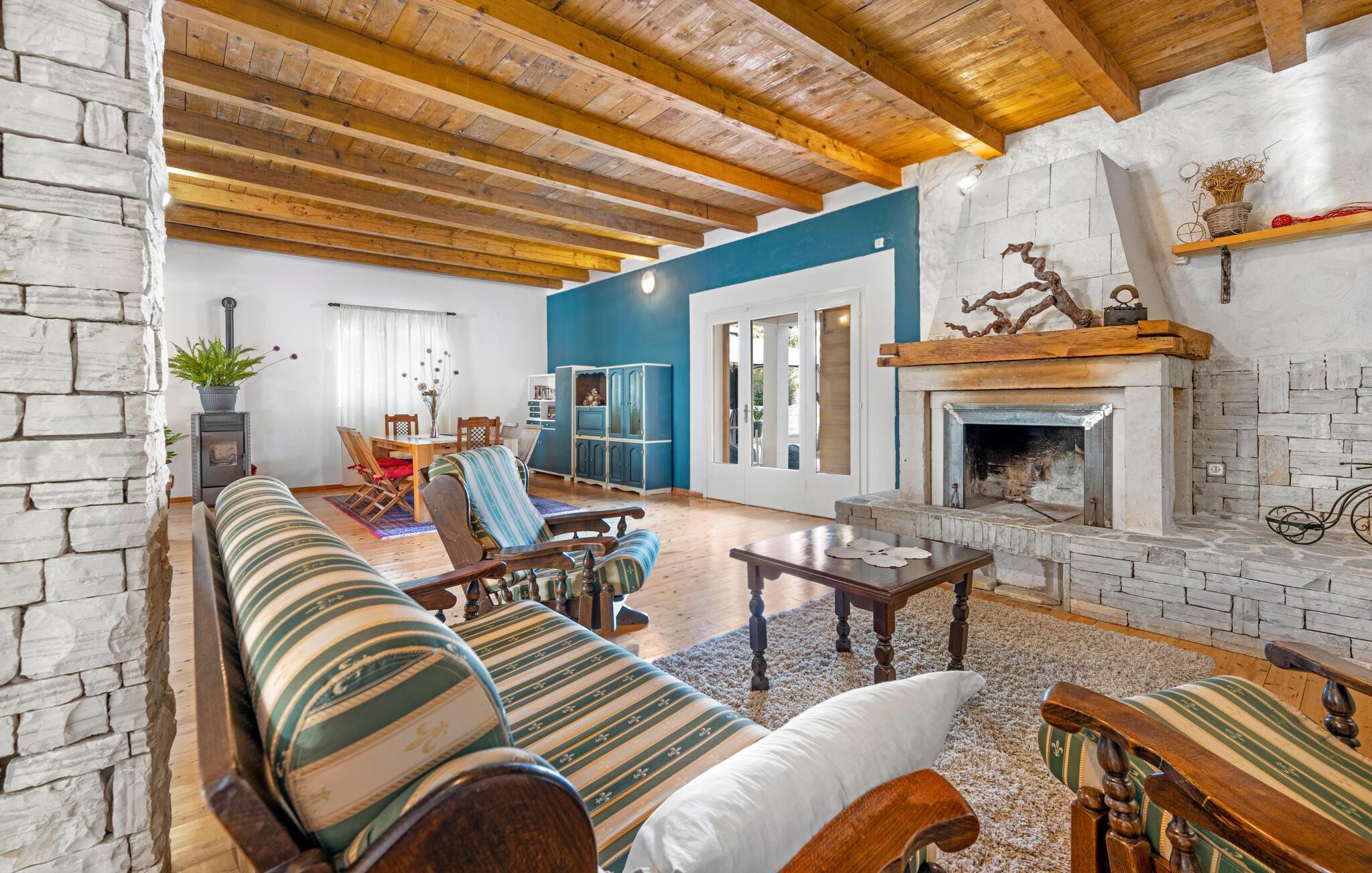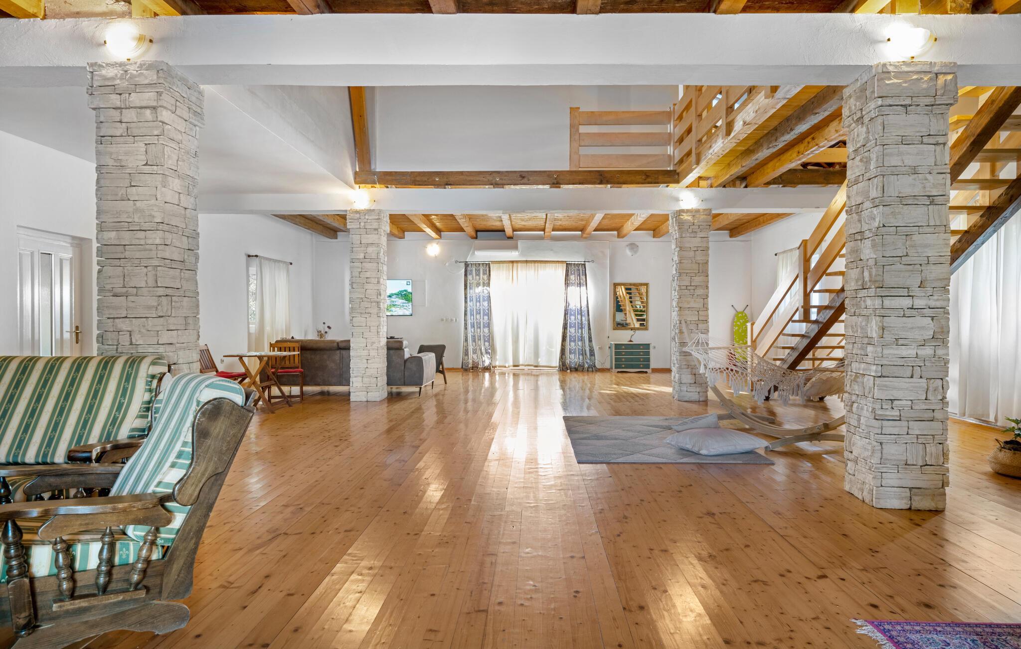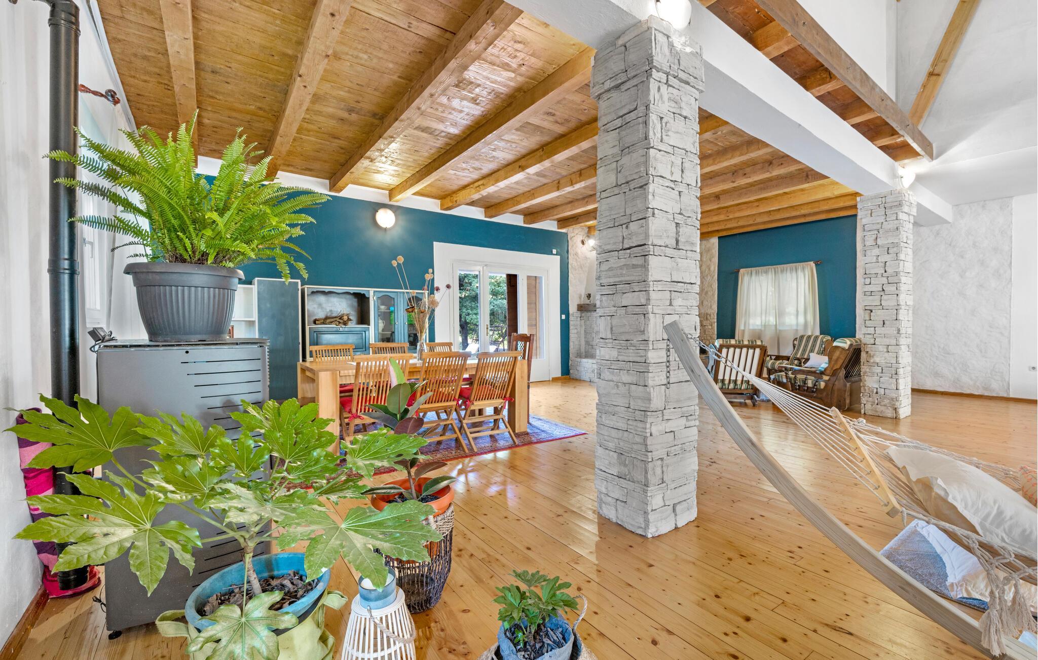 Dette komfortable, rustikt møblerte feriehuset med sin store eiendom er ideelt for store familier som ønsker å nyte ferien langt borte fra hverdagen og fremfor alt uforstyrret. I første etasje gleder huset seg med sin store spisestue hvor hele familien kan sitte og nyte måltidene til fulle. En vakker tretrapp fører deg til loftet, hvor du finner totalt fire soveområder. I tillegg er det en liten kjøkkenkrok hvor du kan tilberede en liten frokost. Det er separate hus på eiendommen, hver med en konoba, en steingrill og et kjøkken. På den overbygde terrassen kan du nyte den vakre utsikten. Men hvis du vil oppleve naturen, kan du ta en tur til Krka nasjonalpark, som ligger bare 2 km fra feriehuset ditt. Utsiktstårnet på feriestedet ditt er også spesielt attraktivt, hvorfra du har utsikt over Kornati nasjonalpark og Sibenik-skjærgården.