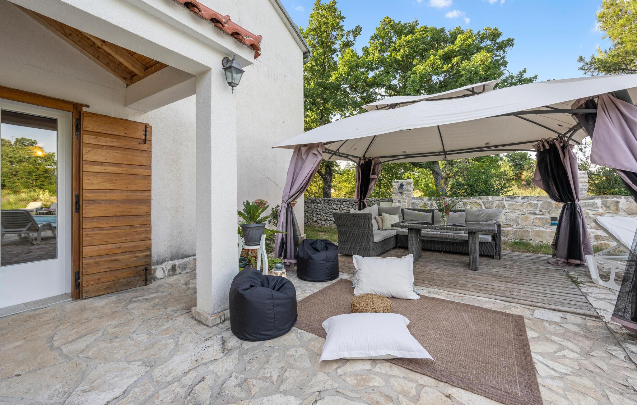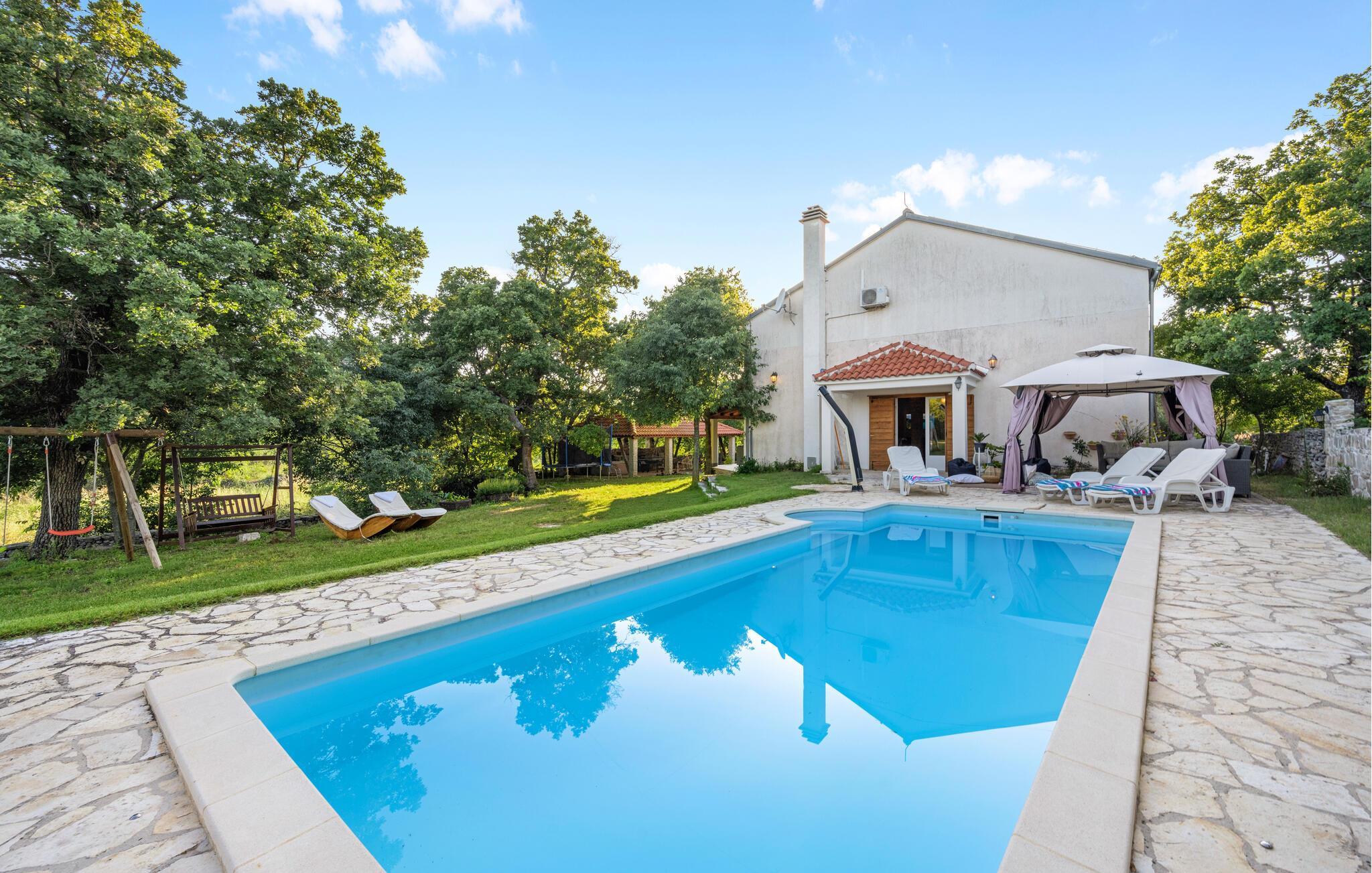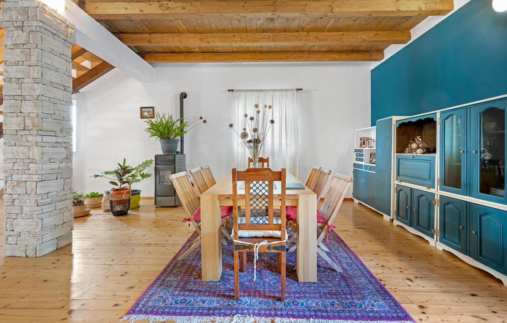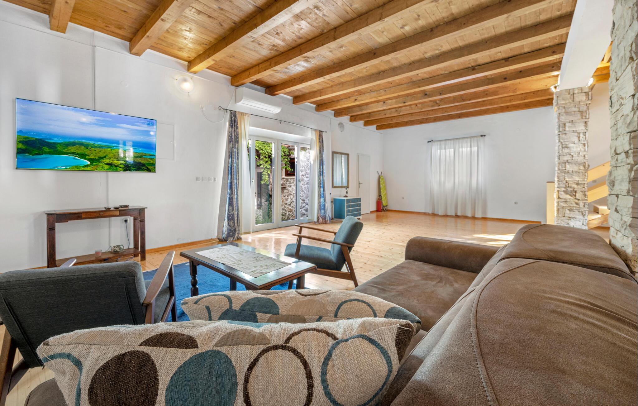Dette komfortable, rustikt møblerte feriehuset med sin store eiendom er ideelt for store familier som ønsker å nyte ferien langt borte fra hverdagen og fremfor alt uforstyrret. I første etasje gleder huset seg med sin store spisestue hvor hele familien kan sitte og nyte måltidene til fulle. En vakker tretrapp fører deg til loftet, hvor du finner totalt fire soveområder. I tillegg er det en liten kjøkkenkrok hvor du kan tilberede en liten frokost. Det er separate hus på eiendommen, hver med en konoba, en steingrill og et kjøkken. På den overbygde terrassen kan du nyte den vakre utsikten. Men hvis du vil oppleve naturen, kan du ta en tur til Krka nasjonalpark, som ligger bare 2 km fra feriehuset ditt. Utsiktstårnet på feriestedet ditt er også spesielt attraktivt, hvorfra du har utsikt over Kornati nasjonalpark og Sibenik-skjærgården.