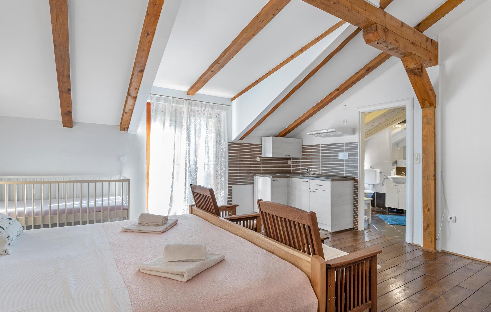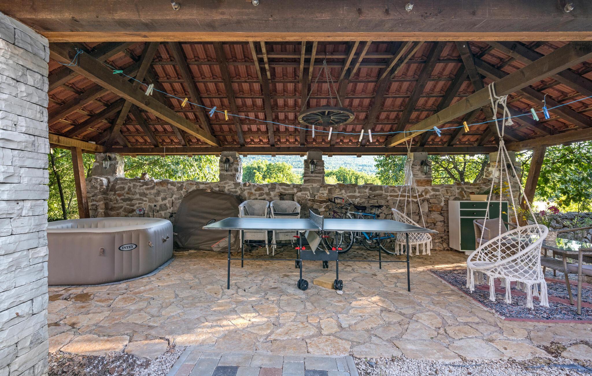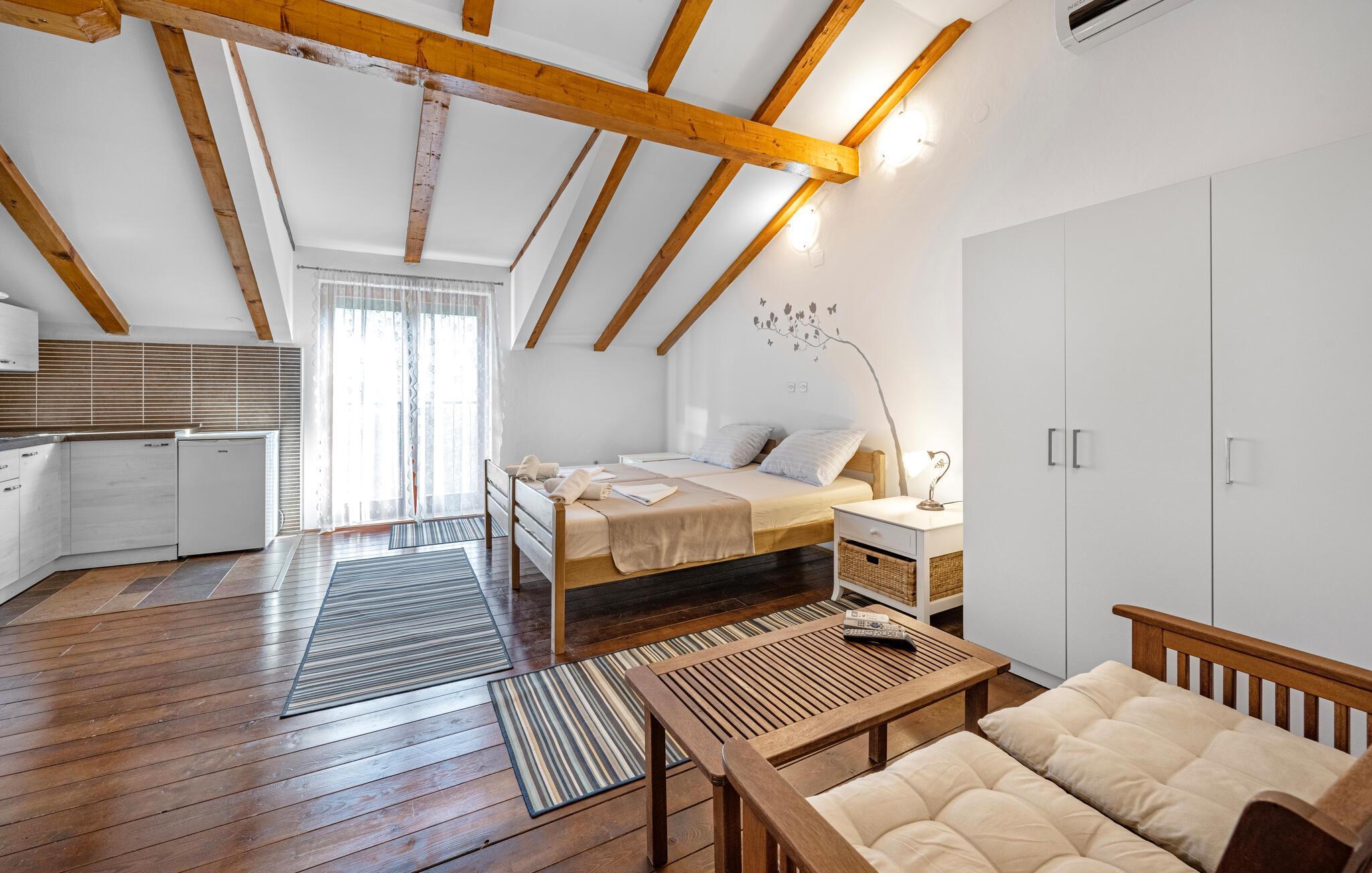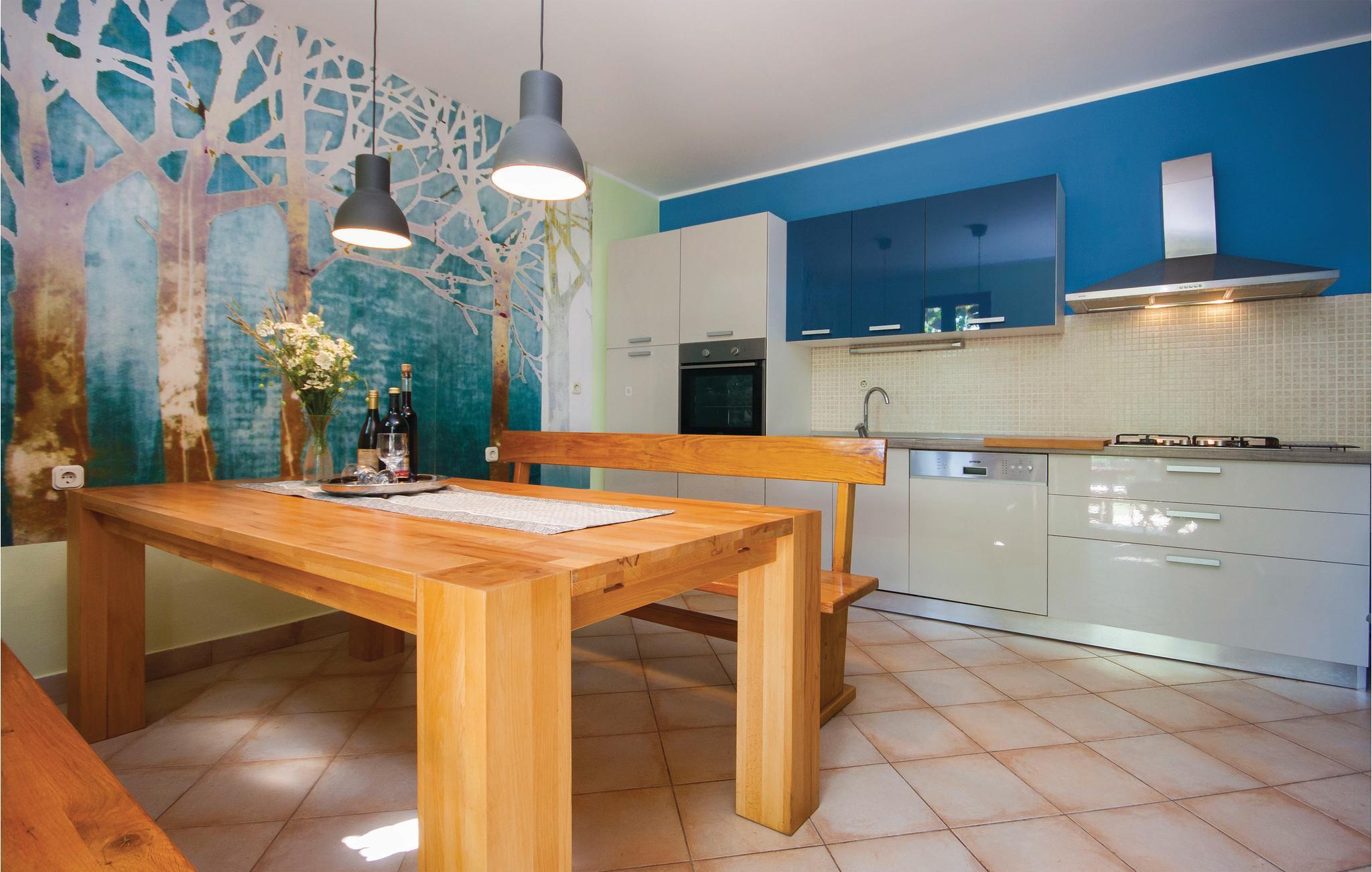 Dette komfortable, rustikt møblerte feriehuset med sin store eiendom er ideelt for store familier som ønsker å nyte ferien langt borte fra hverdagen og fremfor alt uforstyrret. I første etasje gleder huset seg med sin store spisestue hvor hele familien kan sitte og nyte måltidene til fulle. En vakker tretrapp fører deg til loftet, hvor du finner totalt fire soveområder. I tillegg er det en liten kjøkkenkrok hvor du kan tilberede en liten frokost. Det er separate hus på eiendommen, hver med en konoba, en steingrill og et kjøkken. På den overbygde terrassen kan du nyte den vakre utsikten. Men hvis du vil oppleve naturen, kan du ta en tur til Krka nasjonalpark, som ligger bare 2 km fra feriehuset ditt. Utsiktstårnet på feriestedet ditt er også spesielt attraktivt, hvorfra du har utsikt over Kornati nasjonalpark og Sibenik-skjærgården.