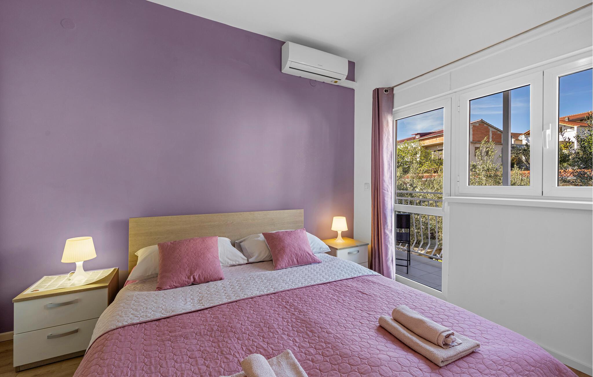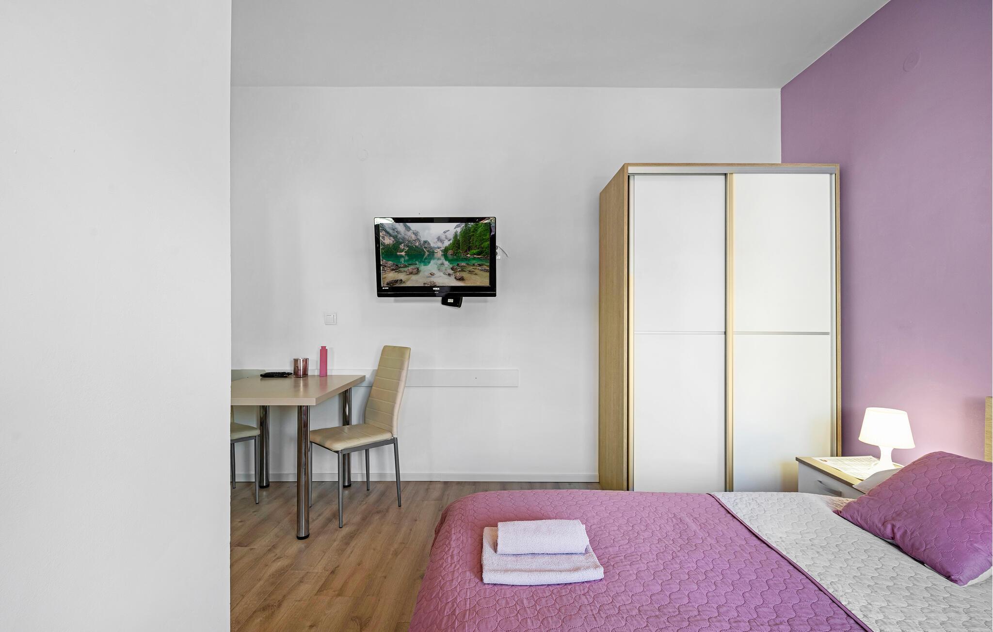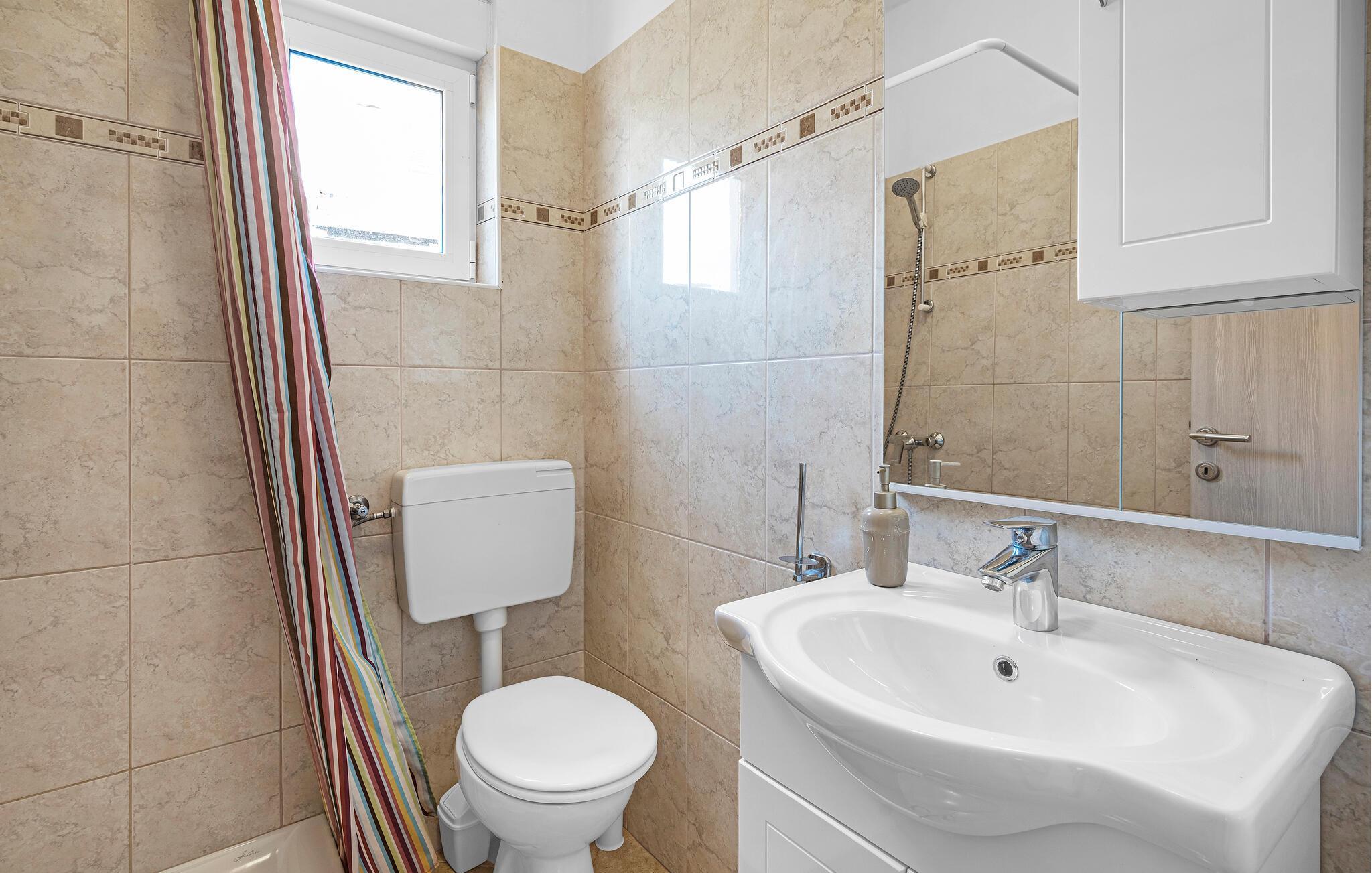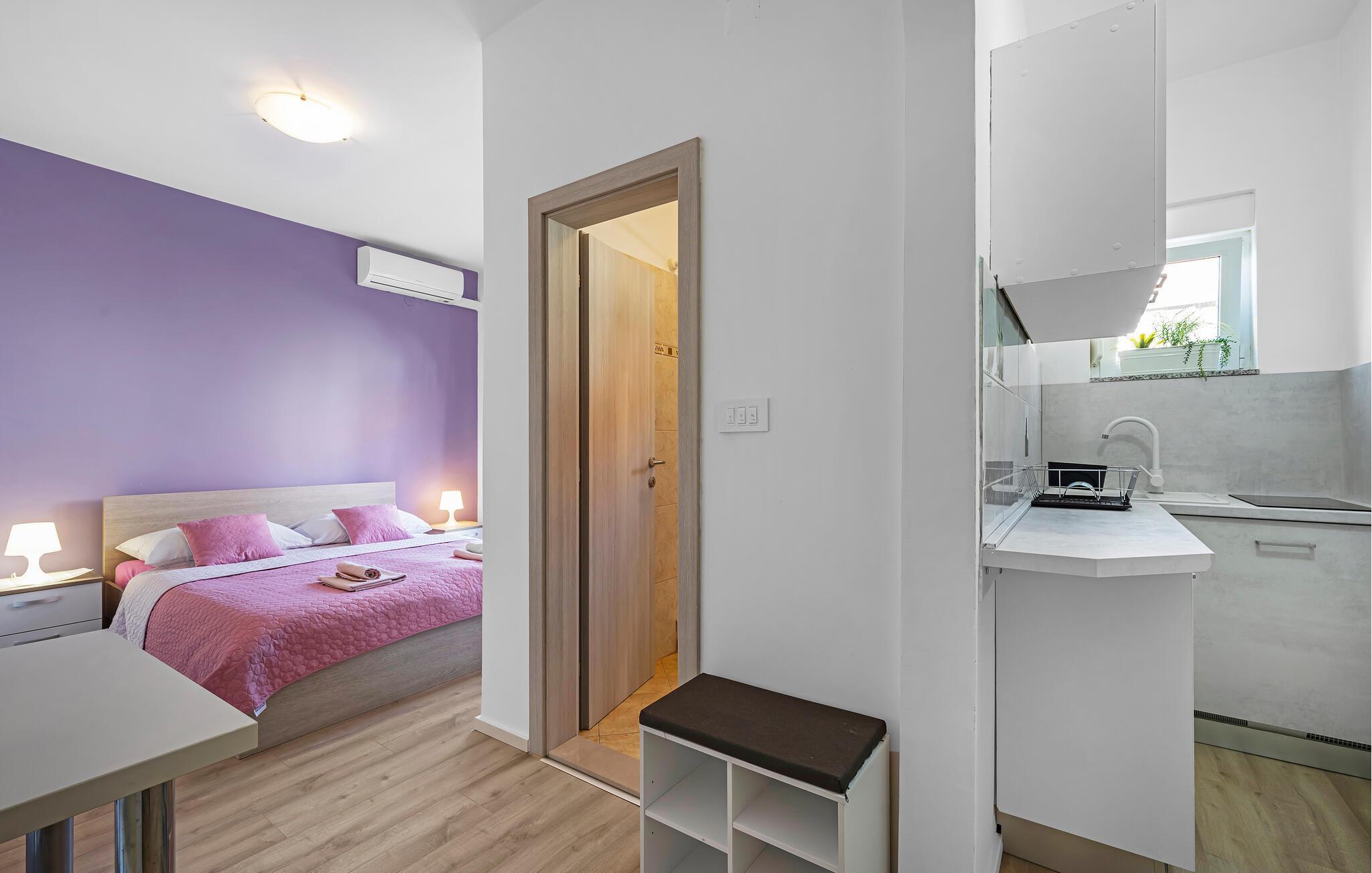 Ferieleiligheten er ideell for en ferie for to og et godt utgangspunkt for utflukter i regionen. Se frem til en rolig beliggenhet, moderne innredning og nærhet til stranden. Bare noen få meter skiller deg fra nærmeste sjøbad. Leiligheten har et funksjonelt kjøkken. Her kan du lage mat av hjertens lyst og forsyne deg selv på ferien. Nyt frokosten på balkongen med utsikt over vannet. Omgitt av oliventrær og middelhavsplanter finner du fred og privatliv her. Den asfalterte gårdsplassen er også velholdt og romslig.