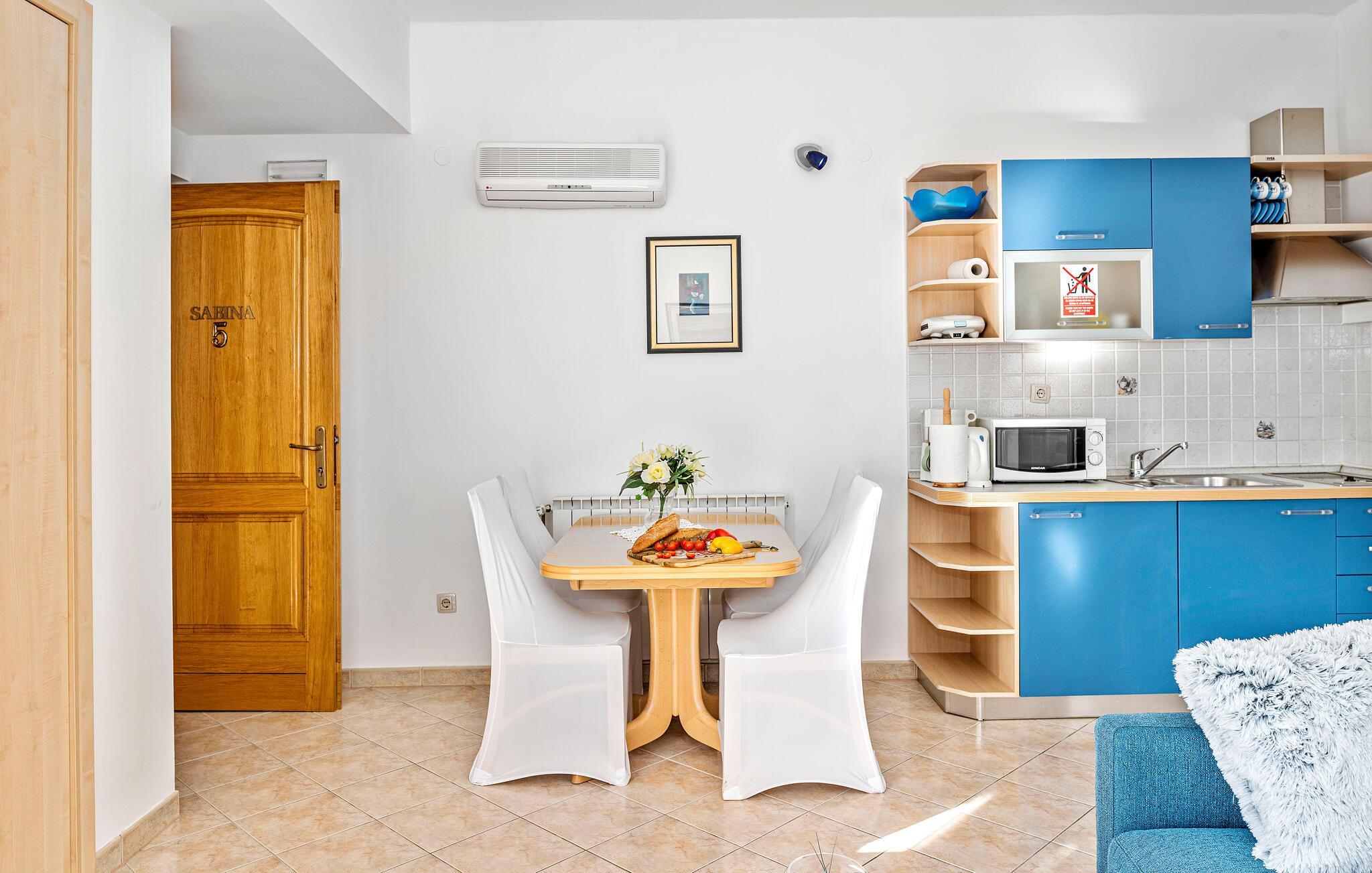 Nyt den nærliggende naturen og det krystallblå havet. Her er du garantert velvære. Den innbydende stuen i middelhavsstil er det perfekte stedet å tilbringe kvalitetstid sammen. Se film i sofaen, spill morsomme spill ved spisebordet eller nyt de lokale spesialitetene.