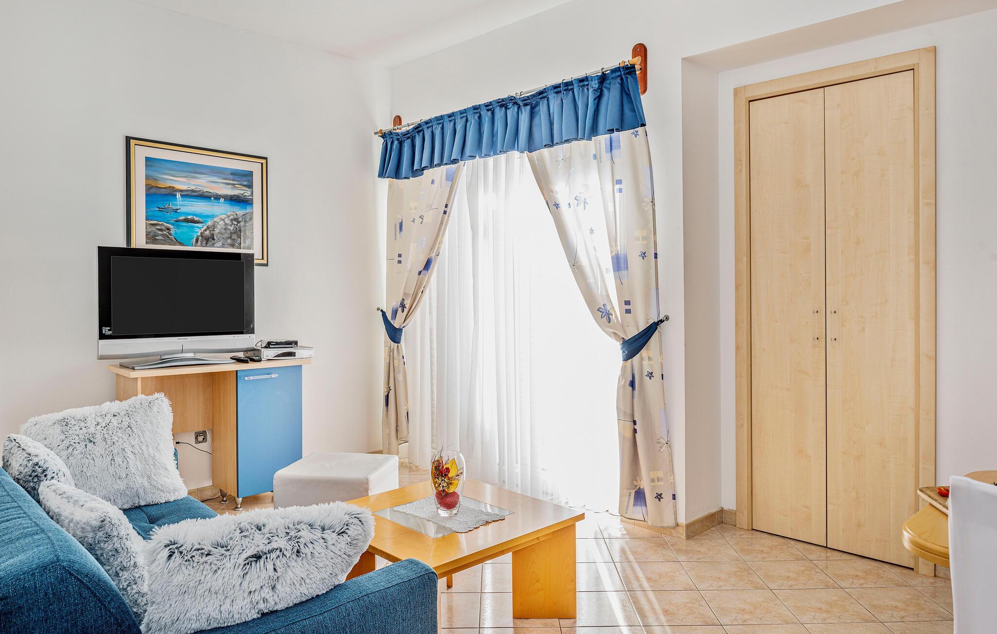 Nyt den nærliggende naturen og det krystallblå havet. Her er du garantert velvære. Den innbydende stuen i middelhavsstil er det perfekte stedet å tilbringe kvalitetstid sammen. Se film i sofaen, spill morsomme spill ved spisebordet eller nyt de lokale spesialitetene.
