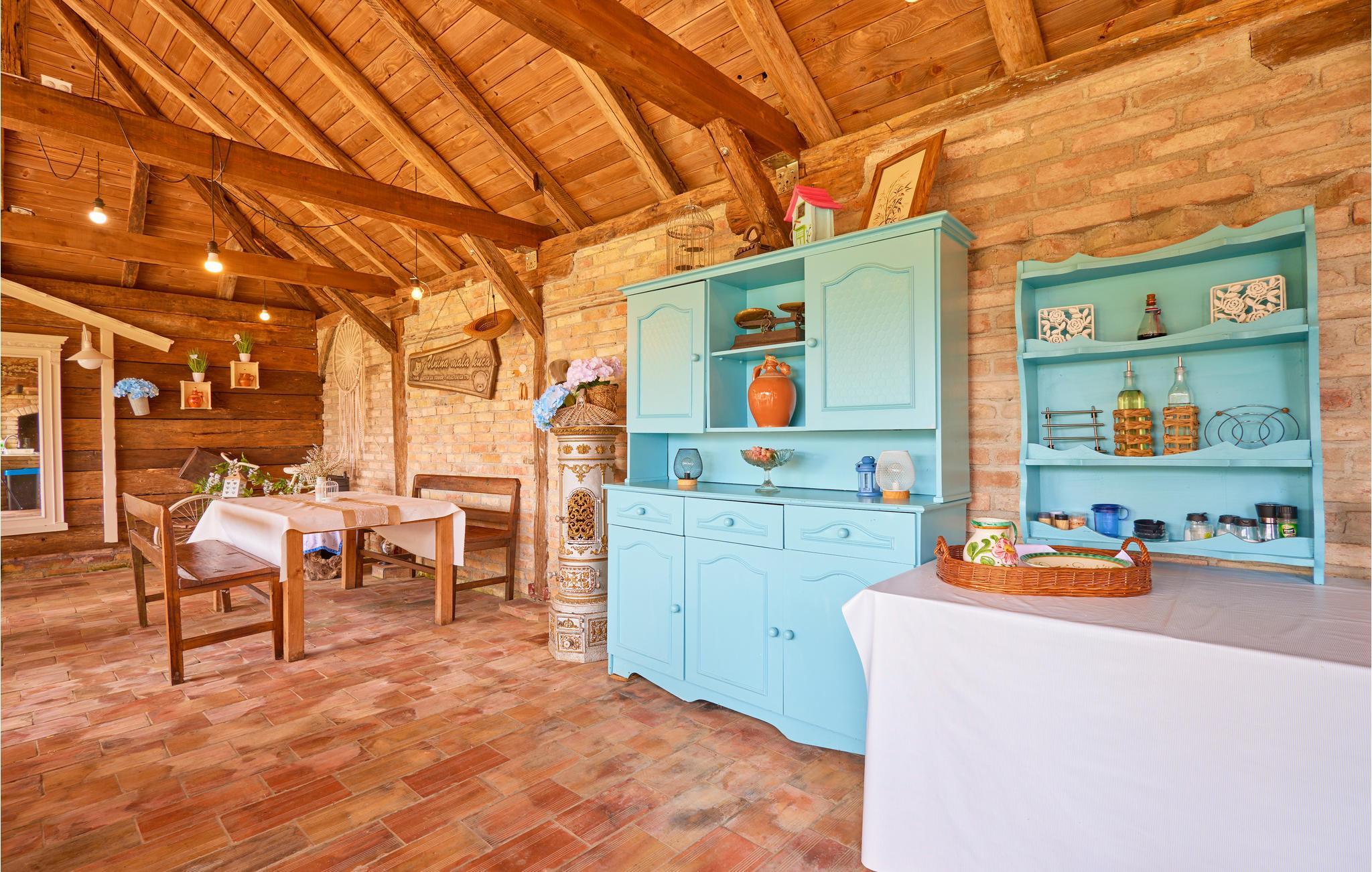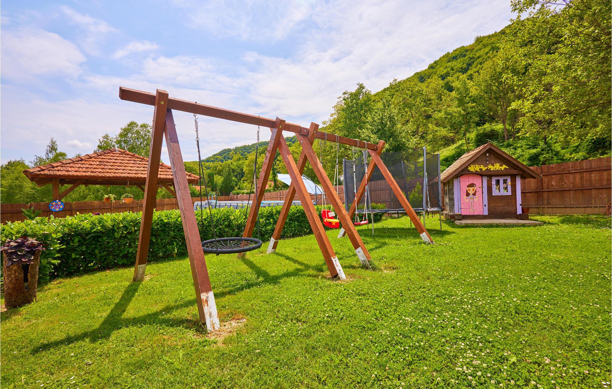 Velkommen til dette vakre feriehuset, som ønsker deg velkommen med sin rustikke hygge. En kakkelovn, massive tremøbler og trepanel bidrar til den gode atmosfæren i huset. Her kan du tilbringe mye tid sammen og sette opp en soveleir under taket. Hagen er et paradis for store og små. Barna dine vil få store øyne, for her kan du svinge, hoppe og svømme i bassenget. De voksne kan se på barna leke i skyggen på den overbygde terrassen, drikke en kaffe og slappe av. Om kveldene kan dere samles rundt bålpannen og holde marshmallows over bålet og nyte stillheten i naturen og stjernehimmelen.