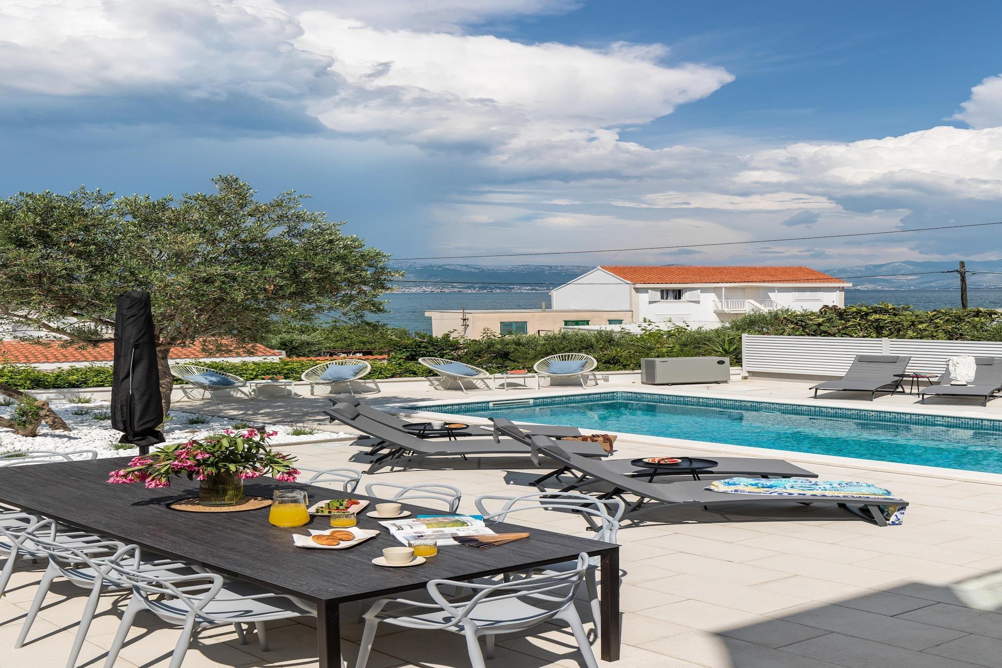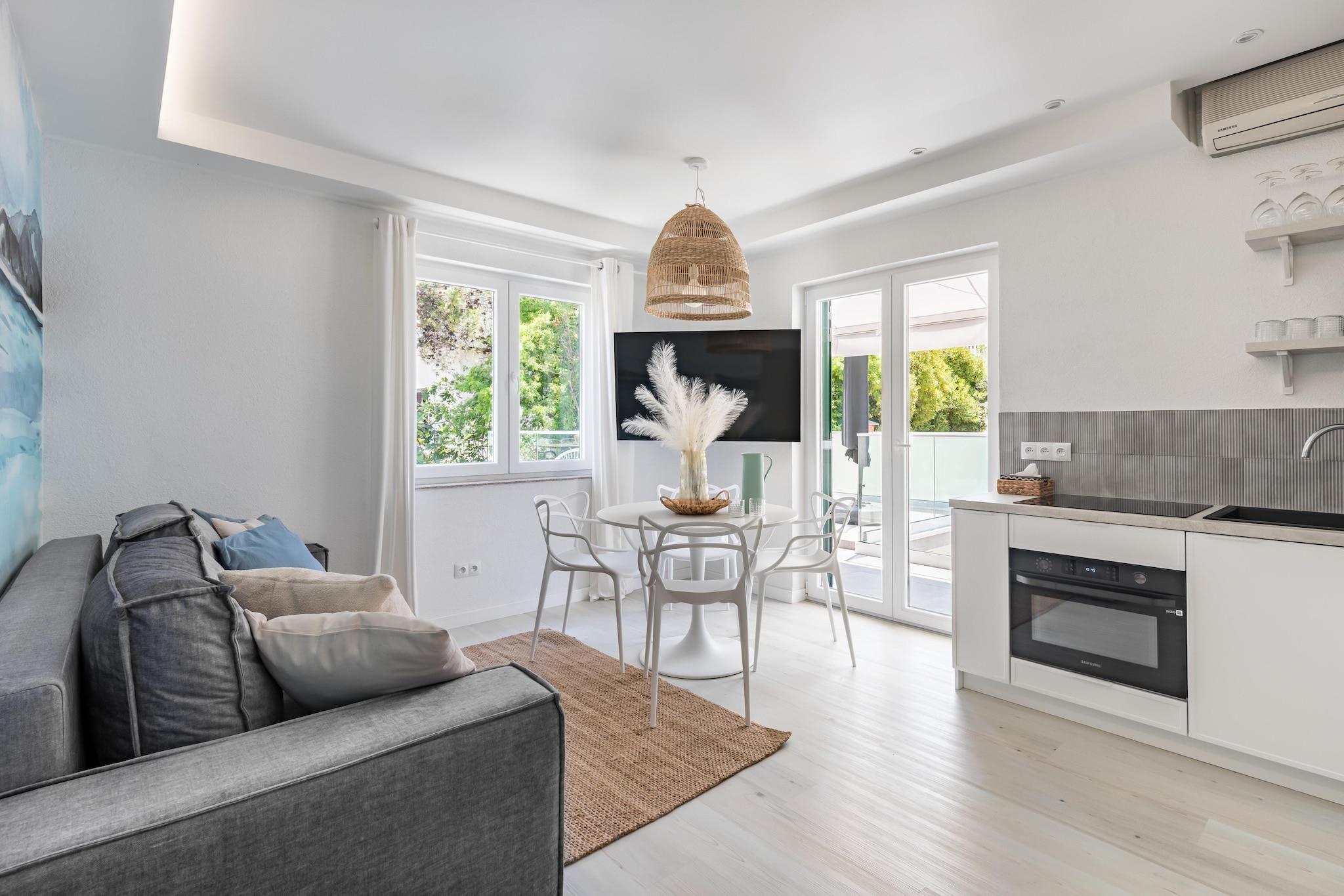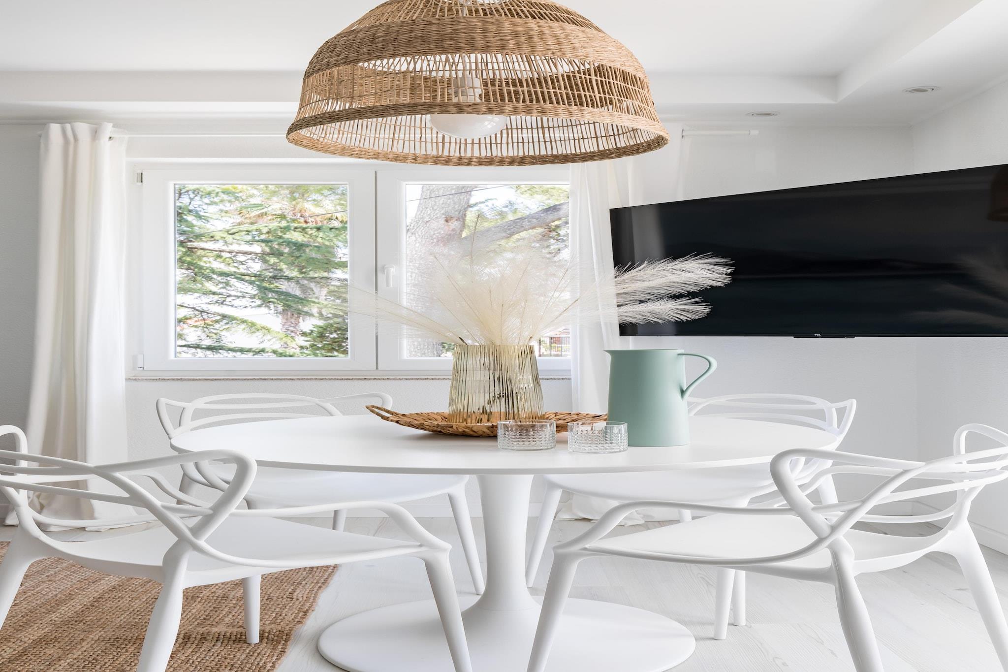 Denne kjæledyrvennlige leiligheten ligger i den fredelige landsbyen Slatine, bare 70 meter fra stranden og 5 km fra Trogirs historiske sentrum, og tilbyr et komfortabelt tilfluktssted for opptil fire gjester. Den har en ideell beliggenhet nær restauranter, butikker og offentlig transport, noe som gjør det enkelt å nyte både den avslappende kystomgivelsen og de kulturelle severdighetene i nærliggende byer. Leiligheten ligger i første etasje og har to soverom med dobbeltsenger, en koselig stue med sovesofa og flatskjerm-TV, og et fullt utstyrt kjøkken. Gjestene kan nyte en privat terrasse, tilgang til et felles svømmebasseng og boblebad, samt en hage med solsenger og grill. Leiligheten har moderne bekvemmeligheter som klimaanlegg, Wi-Fi og gulvvarme. Innsjekking er enkel med egen inngang og nøkkelkode. Parkering er tilgjengelig både foran og bak bygningen, hvor den vennlige husholdersken Alicia bor og kan hjelpe deg med alt du trenger. Gjestene må betale et depositum på 100 euro ved ankomst, som refunderes ved avreise. Passregistrering kan gjøres via QR-kode eller gjennom Alicia. Flyplasstransport og leiebil kan også ordnes på forespørsel.