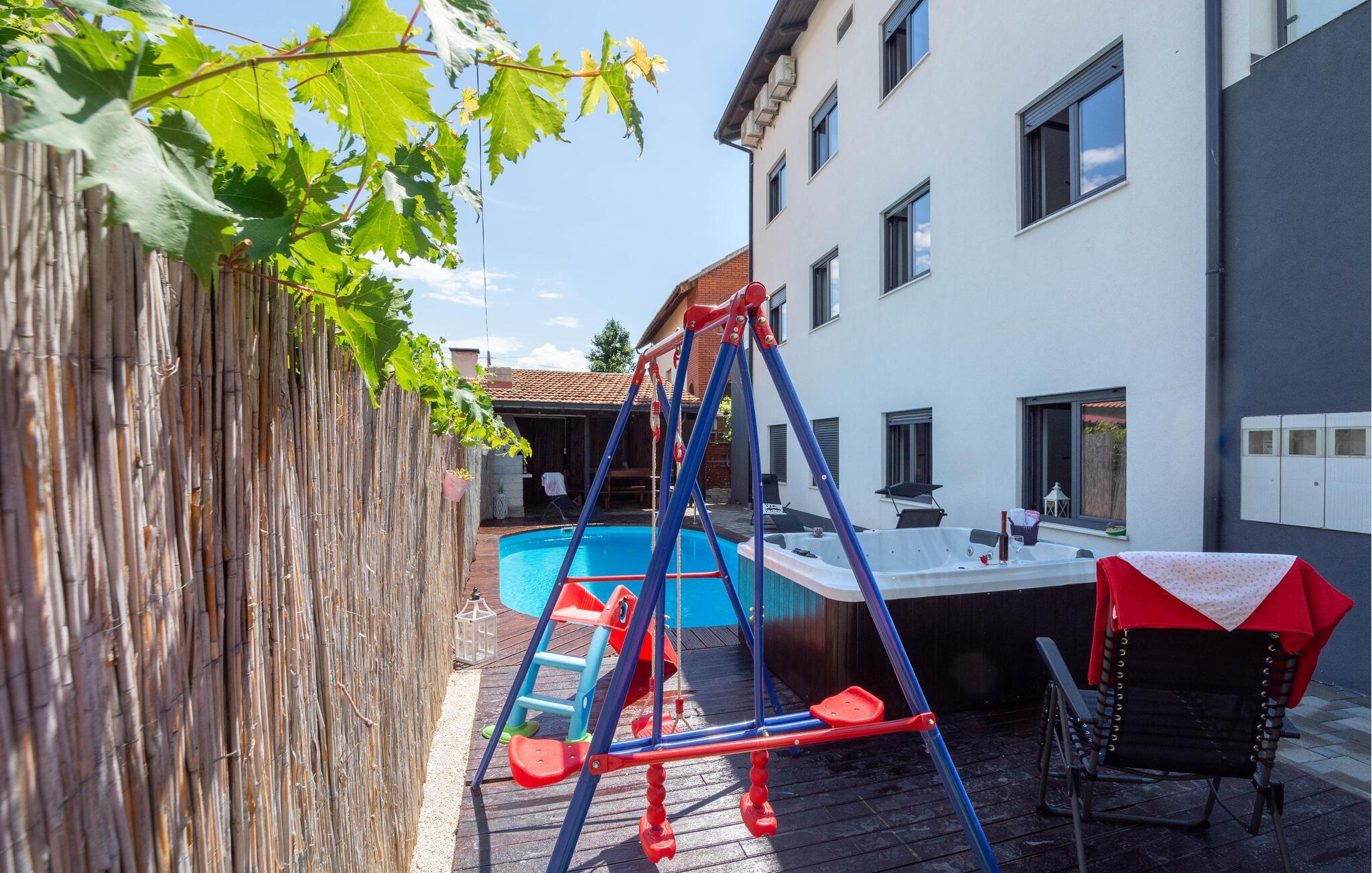Oppdag fellesområdet med basseng, lekeapparater, boblebad og en overbygd terrasse hvor du kan hygge deg med andre gjester over en grill og et måltid.