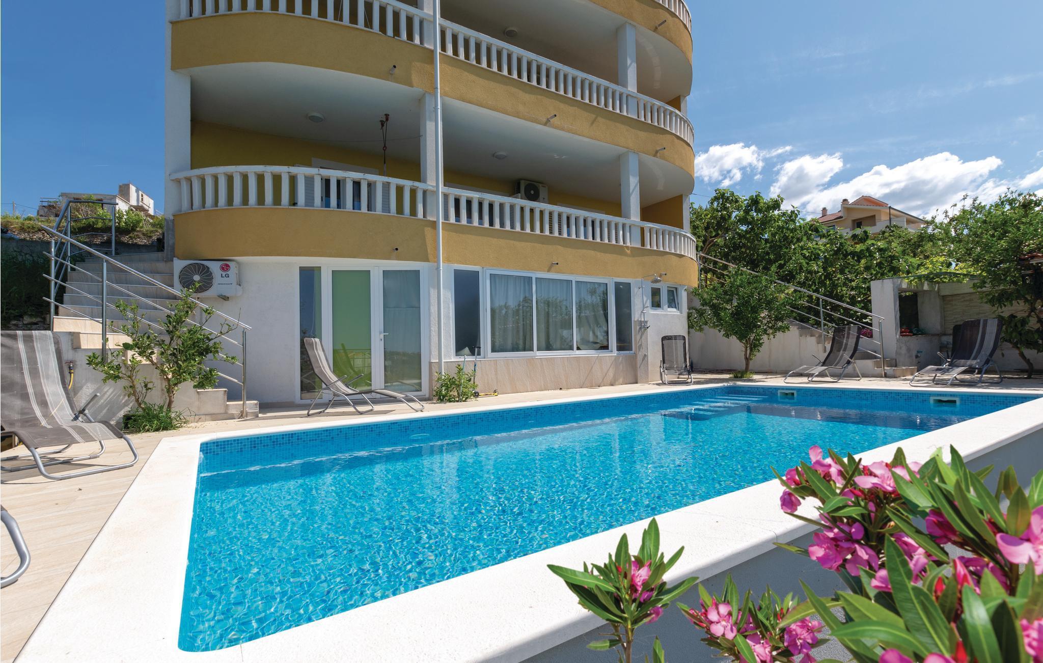 De funksjonelt og komfortabelt innredede leilighetene CDE338 og 339 ligger i Zrnovnica, i nærheten av Split. Her bor du i 2. etasje. Leilighetene har en vakker utsikt over havet og landskapet og kan kombineres godt for familier eller par. Ha en fin ferie og svøm i det delte bassenget foran huset eller slapp av i det delte boblebadet. Den historiske gamlebyen i Split, som er under UNESCO-beskyttelse, gleder seg med mange monumenter. I byen finner du fasiliteter og underholdning for alle aldre.