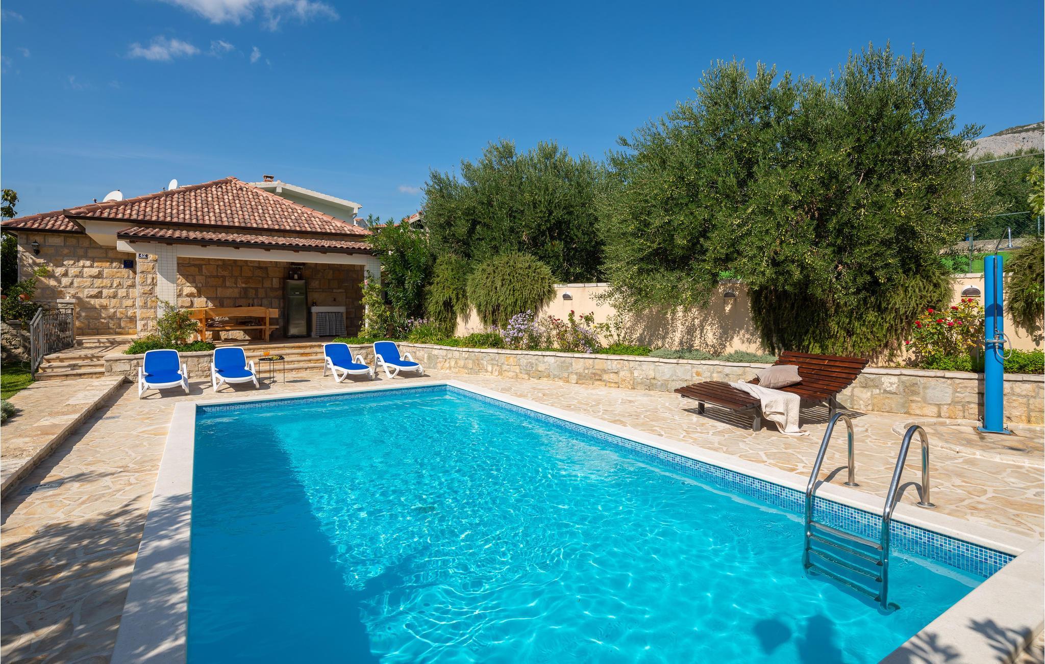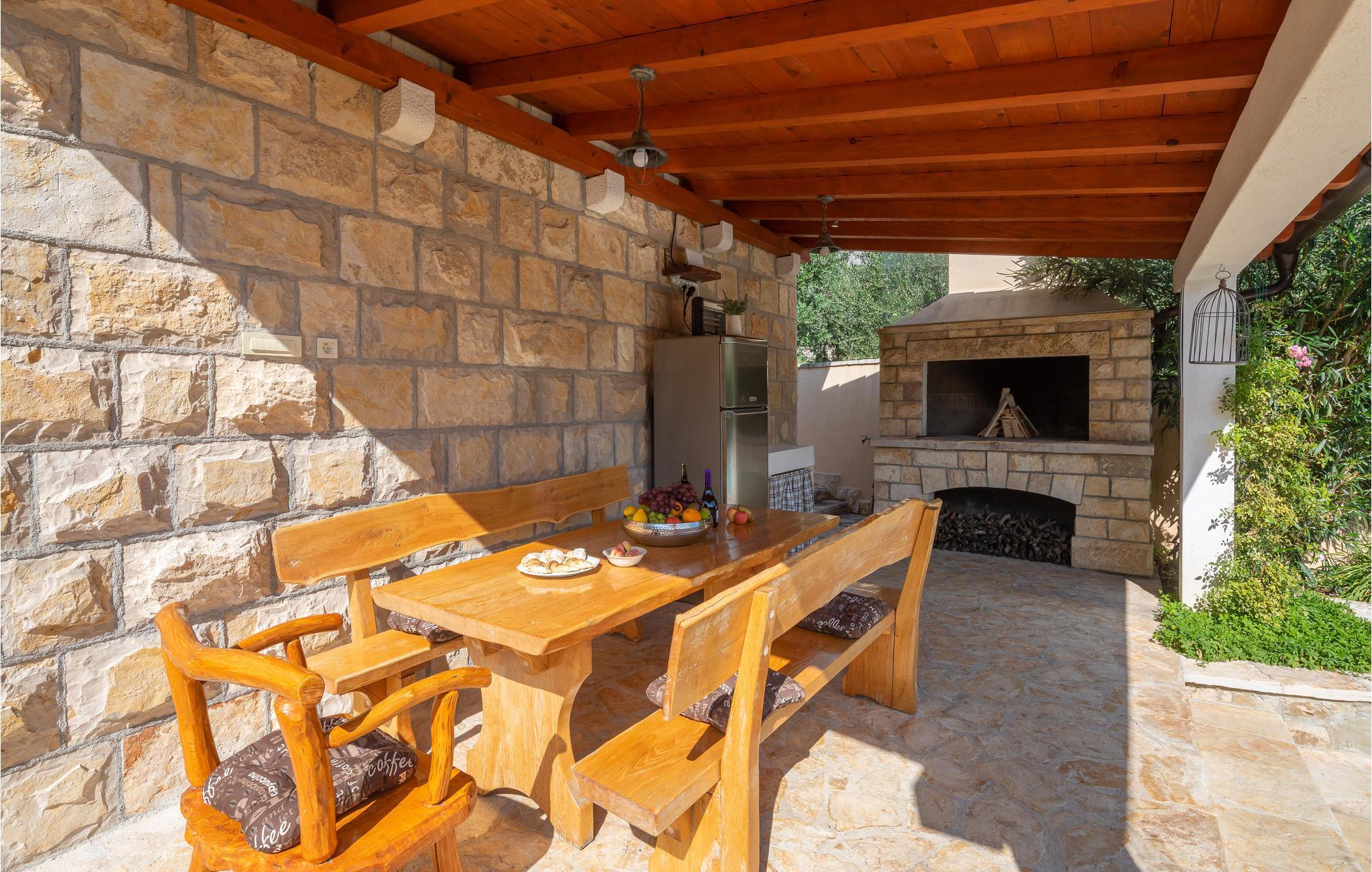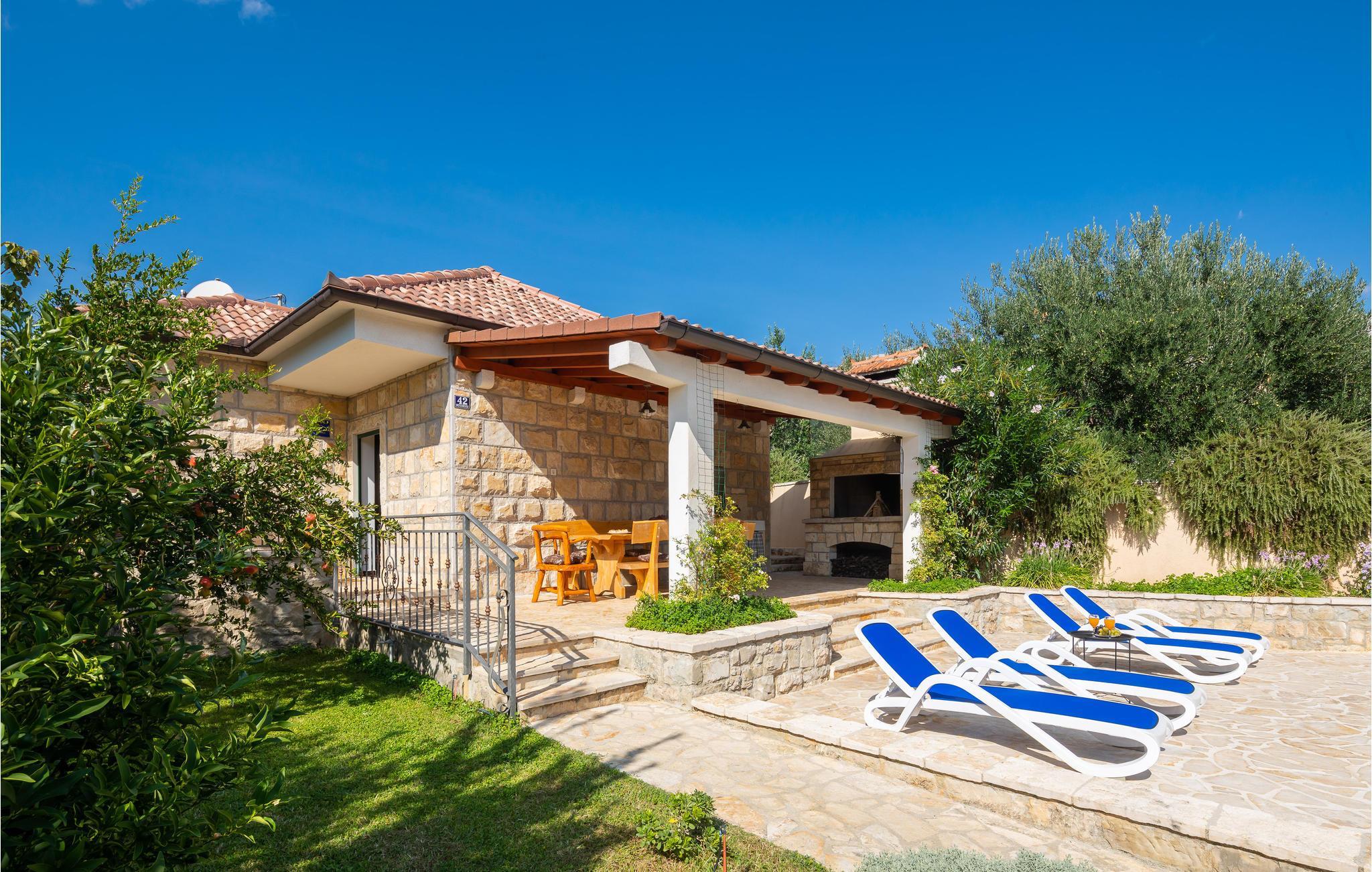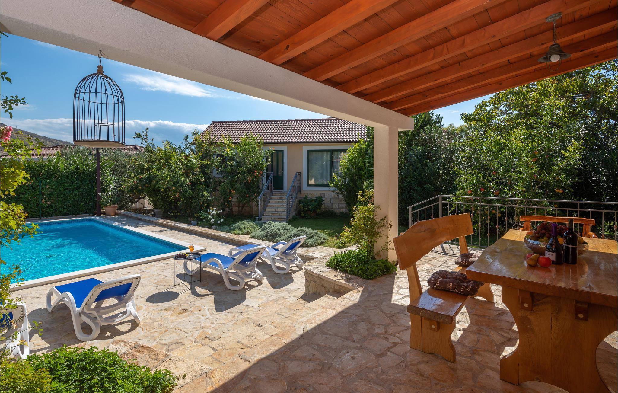 I en idyllisk naturlig beliggenhet i Zrnovnica har du dette nydelige feriehuset med et stilig interiør. Eiendommen består av 2 bygninger, en med kjøkken, stue, 2 soverom og romslig bad, den andre med stue, soverom og bad. Foran huset er en overbygd terrasse med grillplass, ved siden av er også bassenget hvor du kan ha det gøy. Ekstra toalett utenfor. Hvis du liker å spille golf eller tennis, er det baner ca 1 km unna mot et gebyr. På få minutters kjøretur kan du også nå sandstrender og den historiske byen Split.