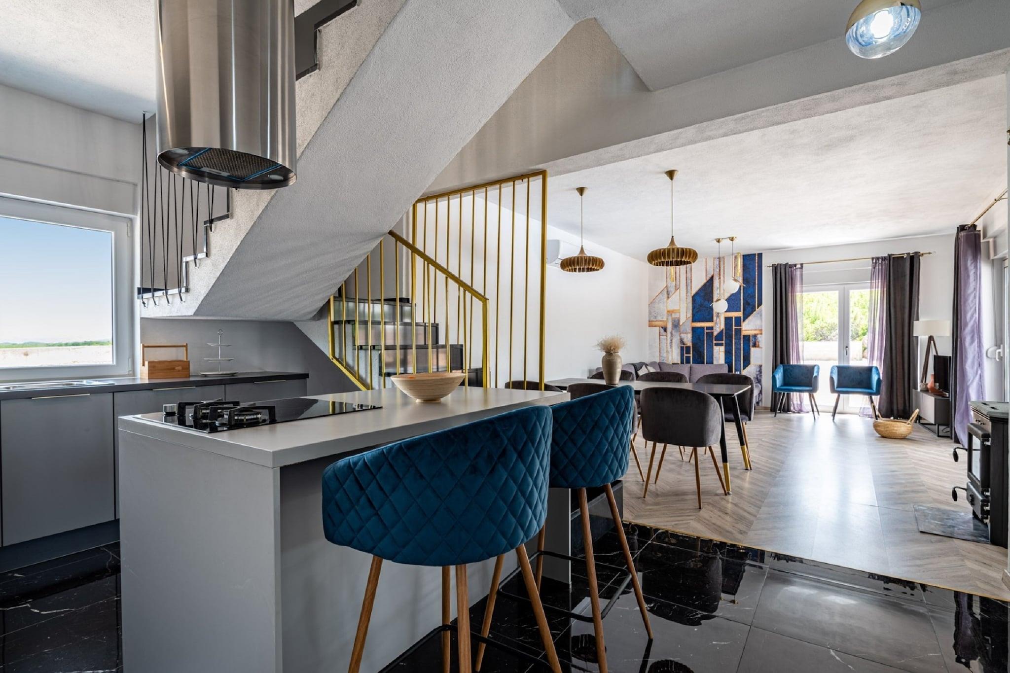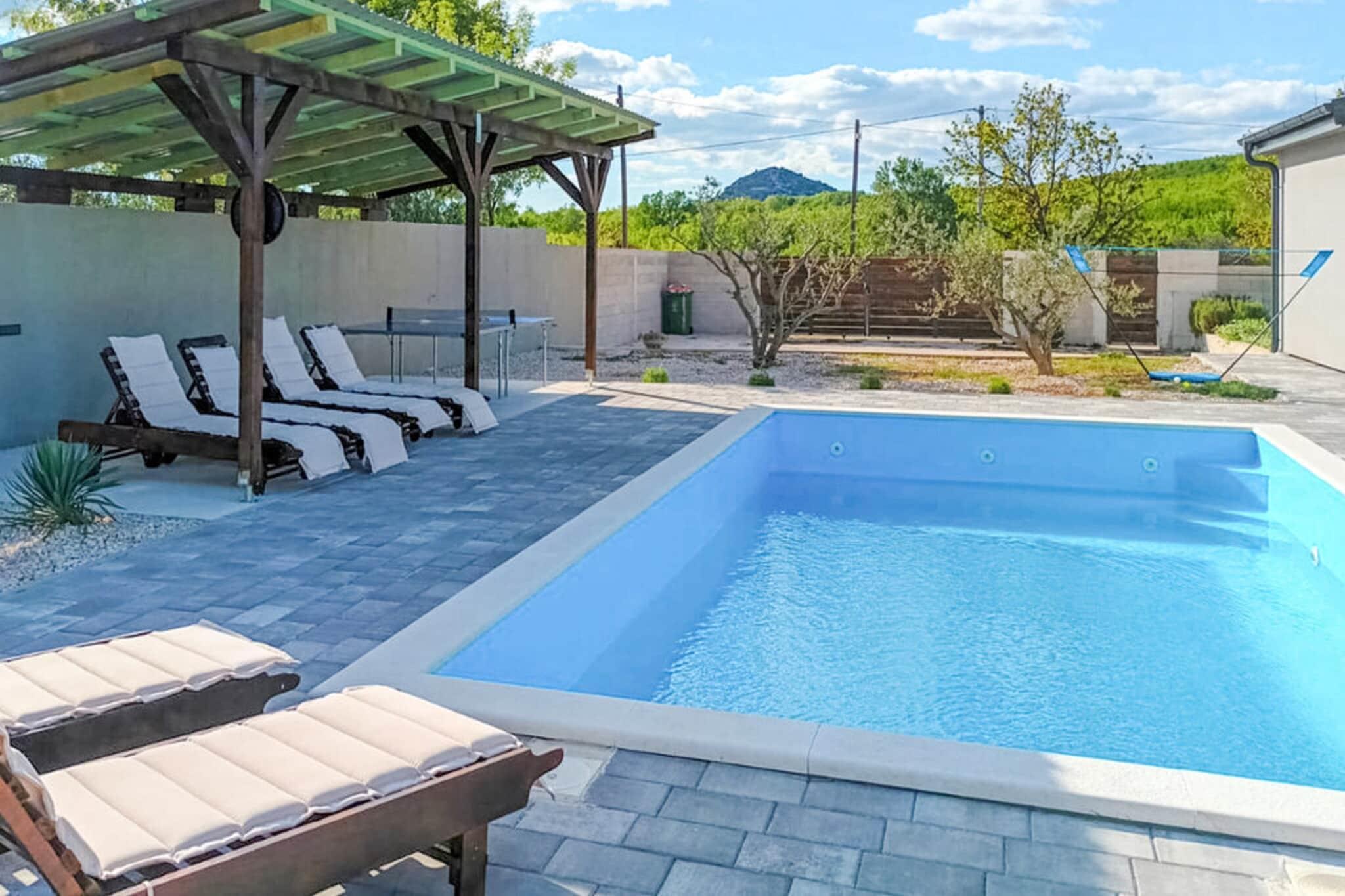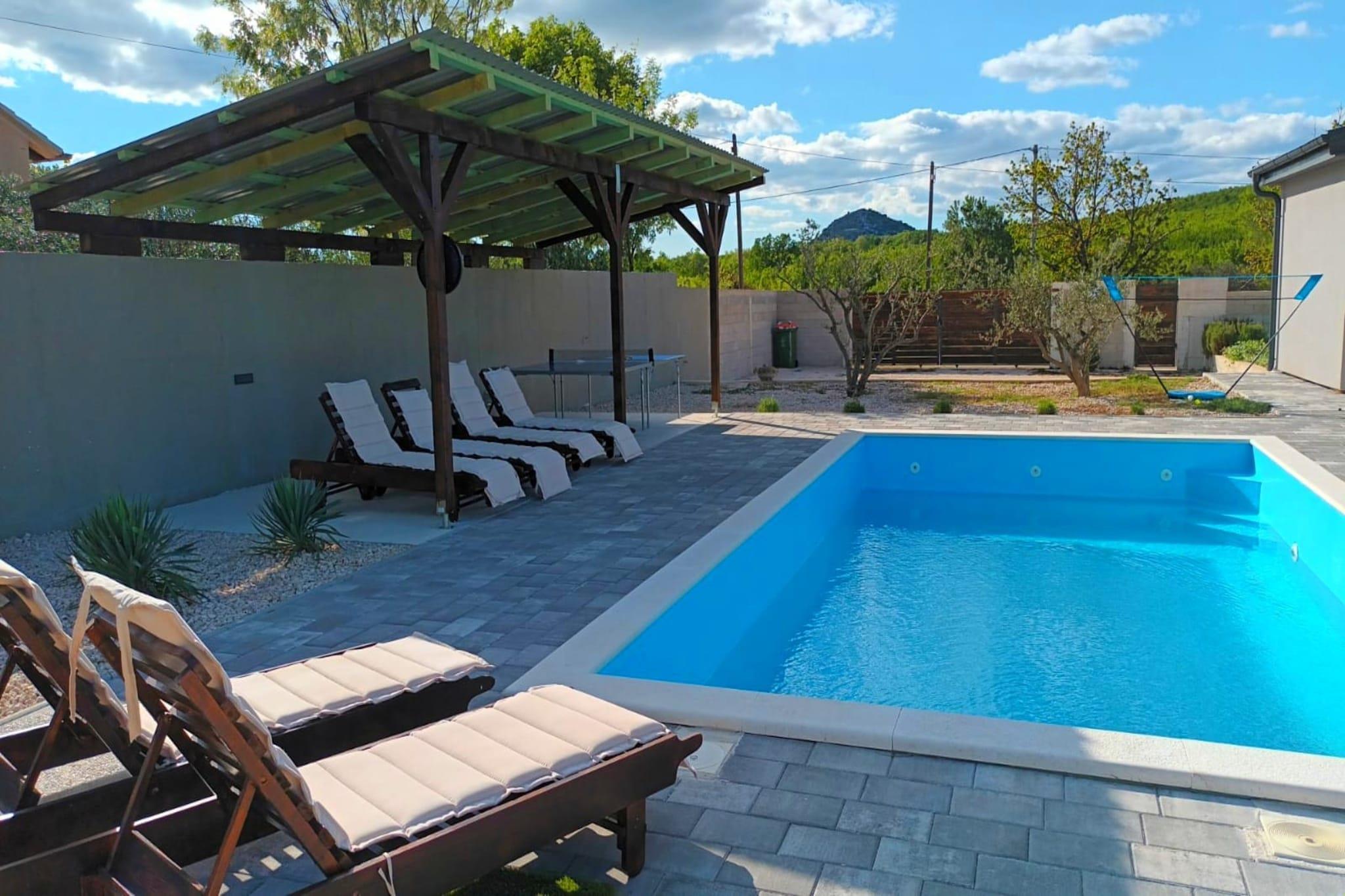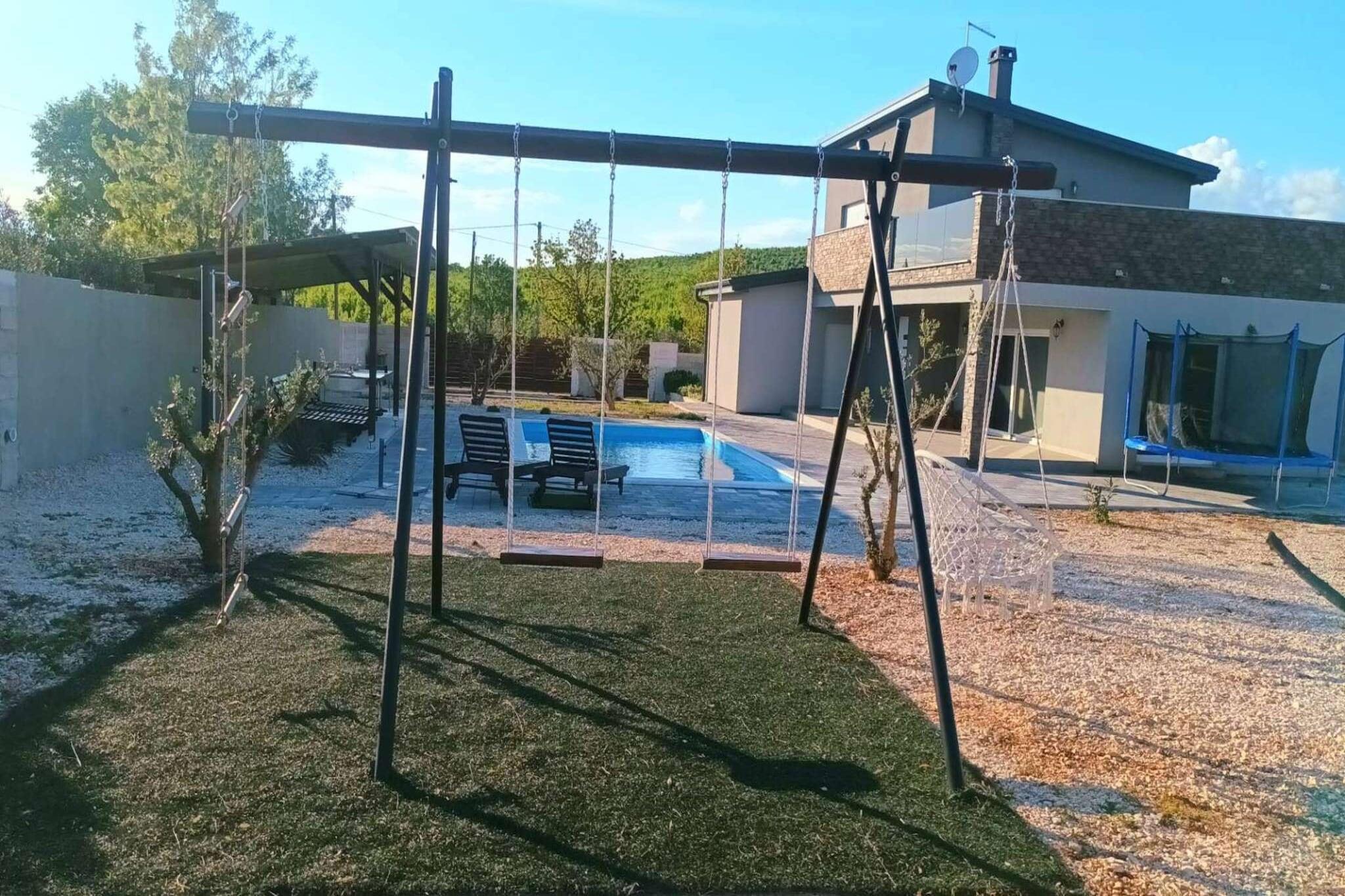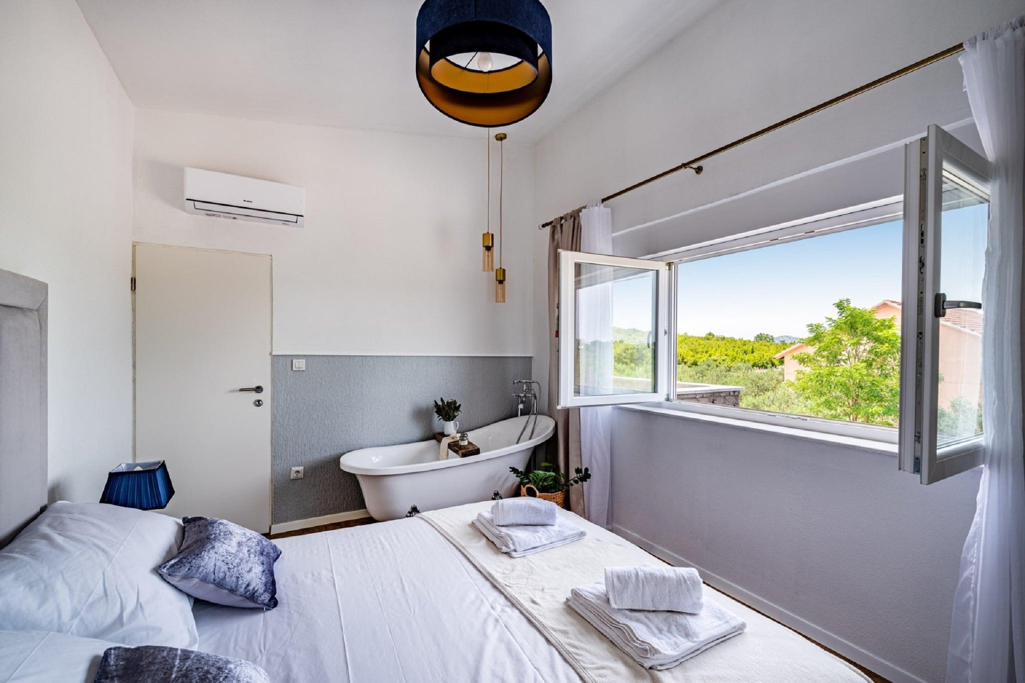 Denne moderne villaen med 4 soverom ligger i utkanten av den fredelige landsbyen Radašinovci, og tilbyr et luksuriøst tilfluktssted i nærheten av naturparken Vrana Lake. Omgitt av åser og kun 12 km fra stranden, er det en perfekt base for å utforske Krka nasjonalpark, Kornati, Paklenica og kystperlene i Šibenik og Zadar. Villaen har to soverom med eget bad i første etasje, og to soverom oppe som deler bad, ett med frittstående badekar. Begge de øverste rommene åpner mot private balkonger. Den romslige stuen, det fullt utstyrte kjøkkenet og vaskerommet sørger for et komfortabelt opphold, med klimaanlegg, satellitt-TV og gratis Wi-Fi overalt. Utendørs kan du nyte et 32 m² stort basseng, grill og en inngjerdet hage med badminton, trampoline, bordtennis og husker. Privat parkering for gjester og kjæledyrvennlige fasiliteter gjør det ideelt for familier. Et rolig og aktivitetsfylt tilfluktssted på den kroatiske landsbygda.
