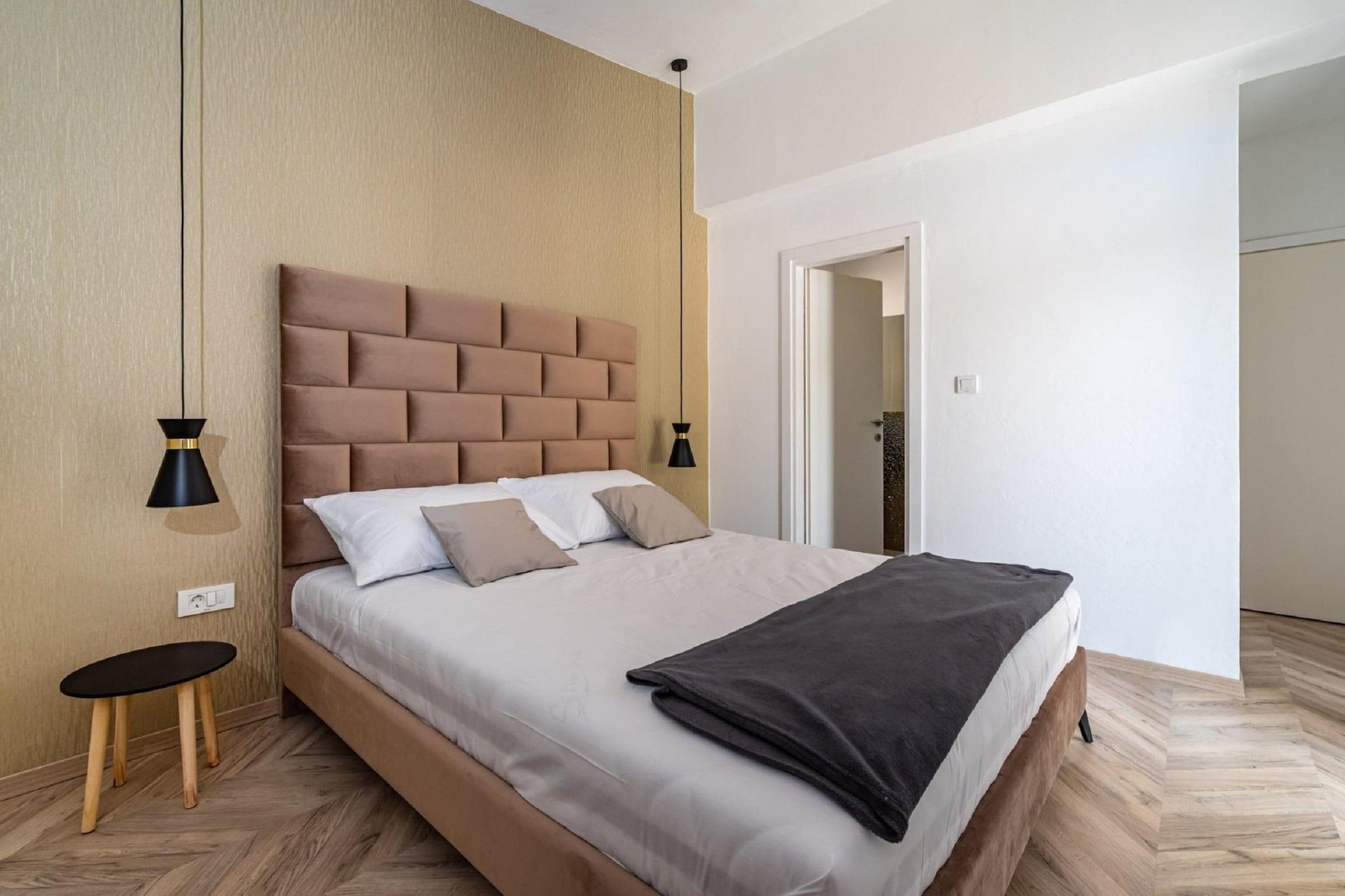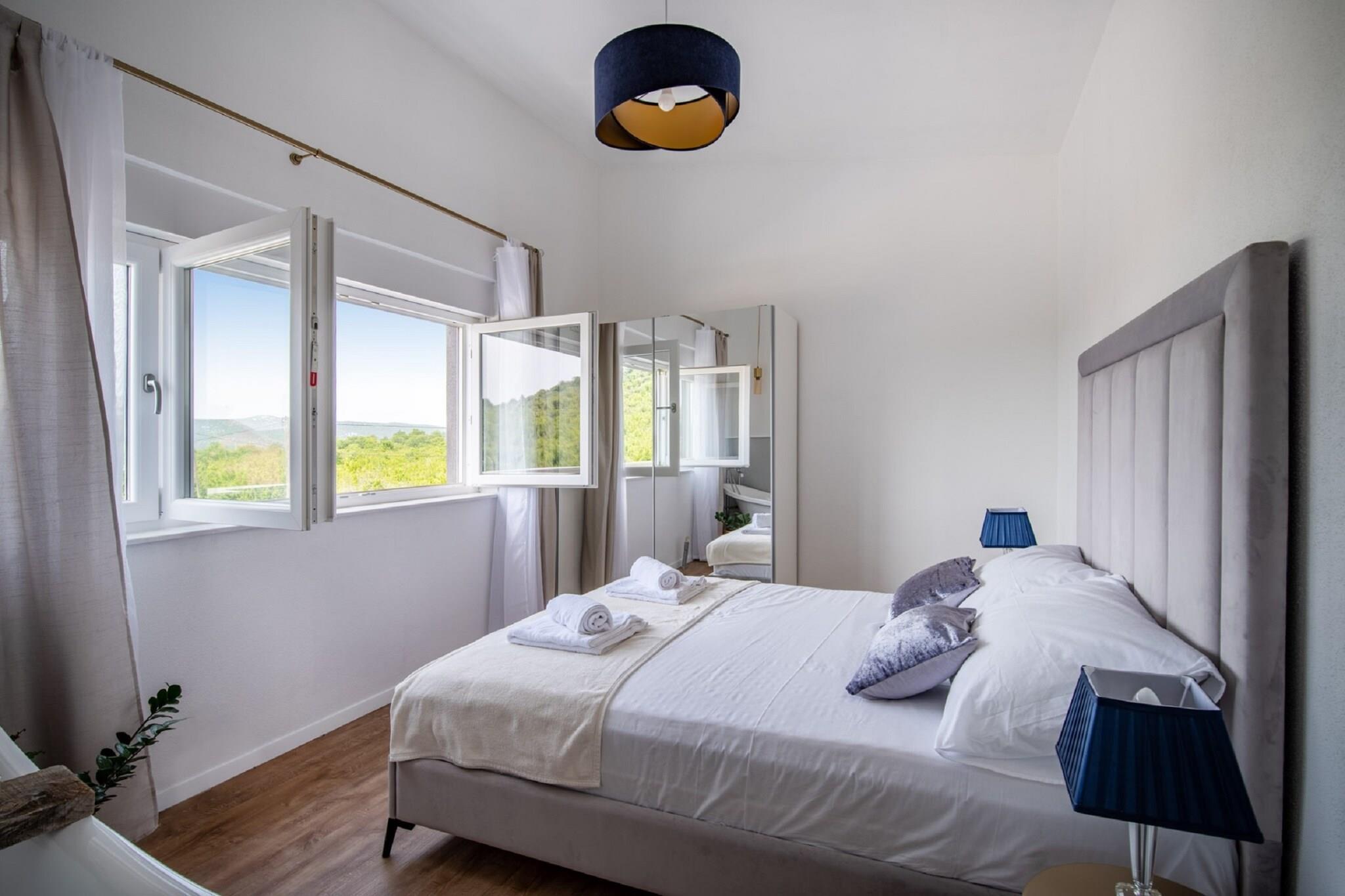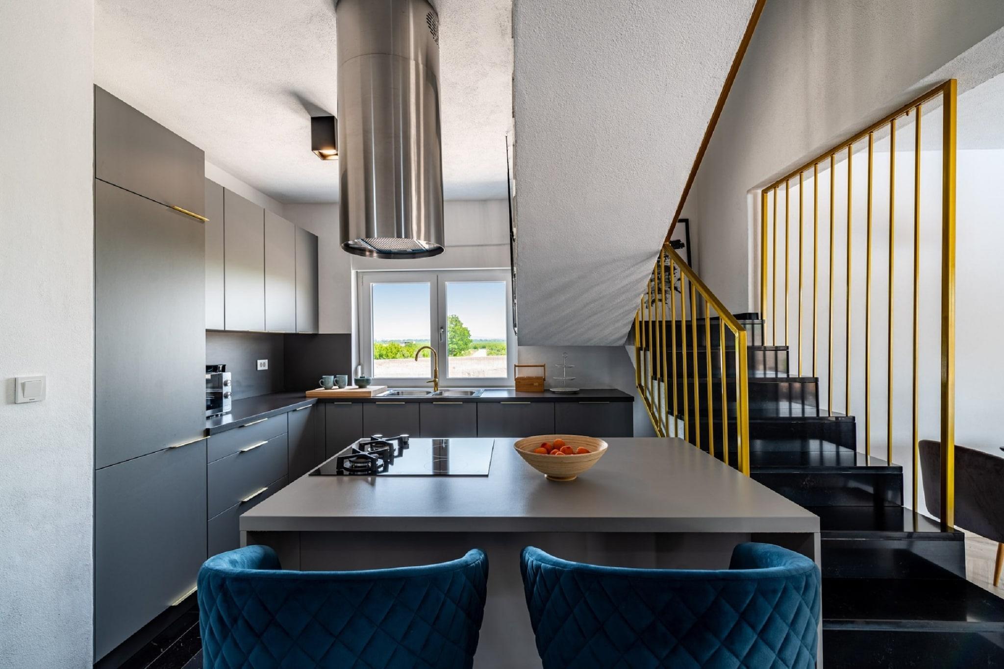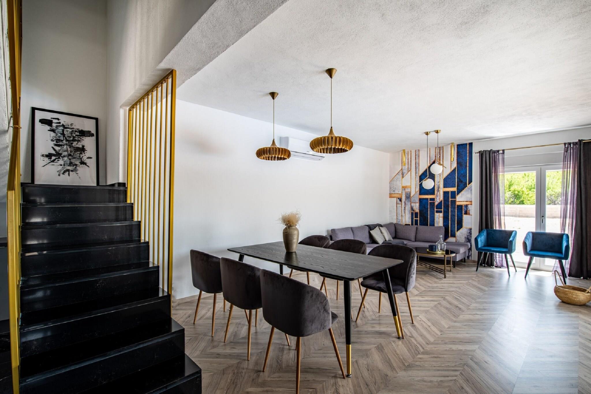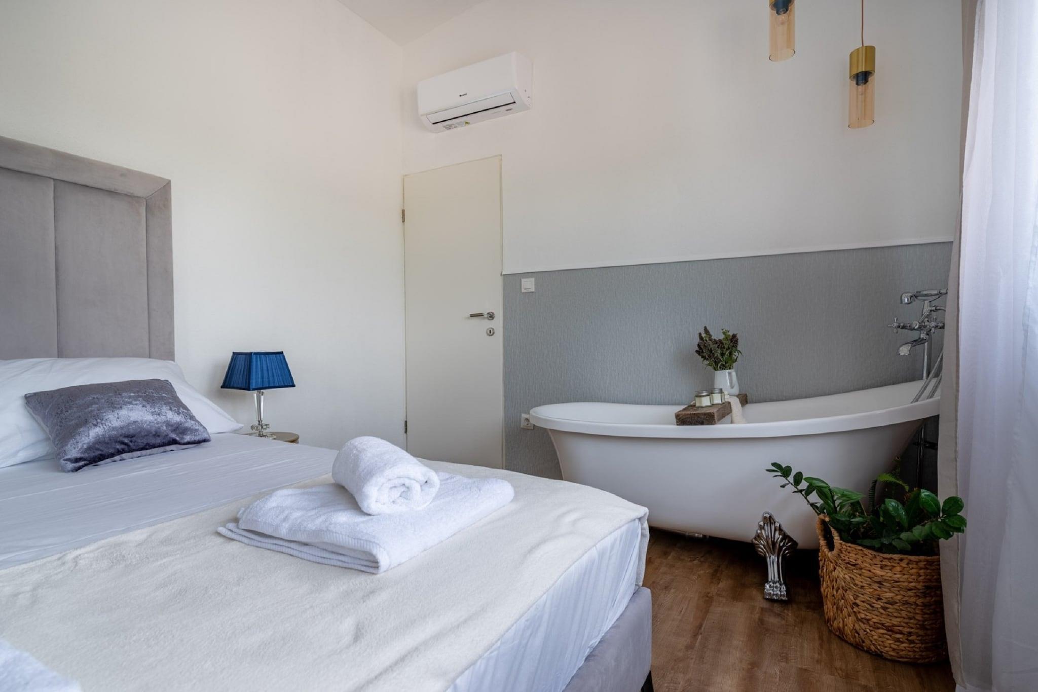 Denne moderne villaen med 4 soverom ligger i utkanten av den fredelige landsbyen Radašinovci, og tilbyr et luksuriøst tilfluktssted i nærheten av naturparken Vrana Lake. Omgitt av åser og kun 12 km fra stranden, er det en perfekt base for å utforske Krka nasjonalpark, Kornati, Paklenica og kystperlene i Šibenik og Zadar. Villaen har to soverom med eget bad i første etasje, og to soverom oppe som deler bad, ett med frittstående badekar. Begge de øverste rommene åpner mot private balkonger. Den romslige stuen, det fullt utstyrte kjøkkenet og vaskerommet sørger for et komfortabelt opphold, med klimaanlegg, satellitt-TV og gratis Wi-Fi overalt. Utendørs kan du nyte et 32 m² stort basseng, grill og en inngjerdet hage med badminton, trampoline, bordtennis og husker. Privat parkering for gjester og kjæledyrvennlige fasiliteter gjør det ideelt for familier. Et rolig og aktivitetsfylt tilfluktssted på den kroatiske landsbygda.