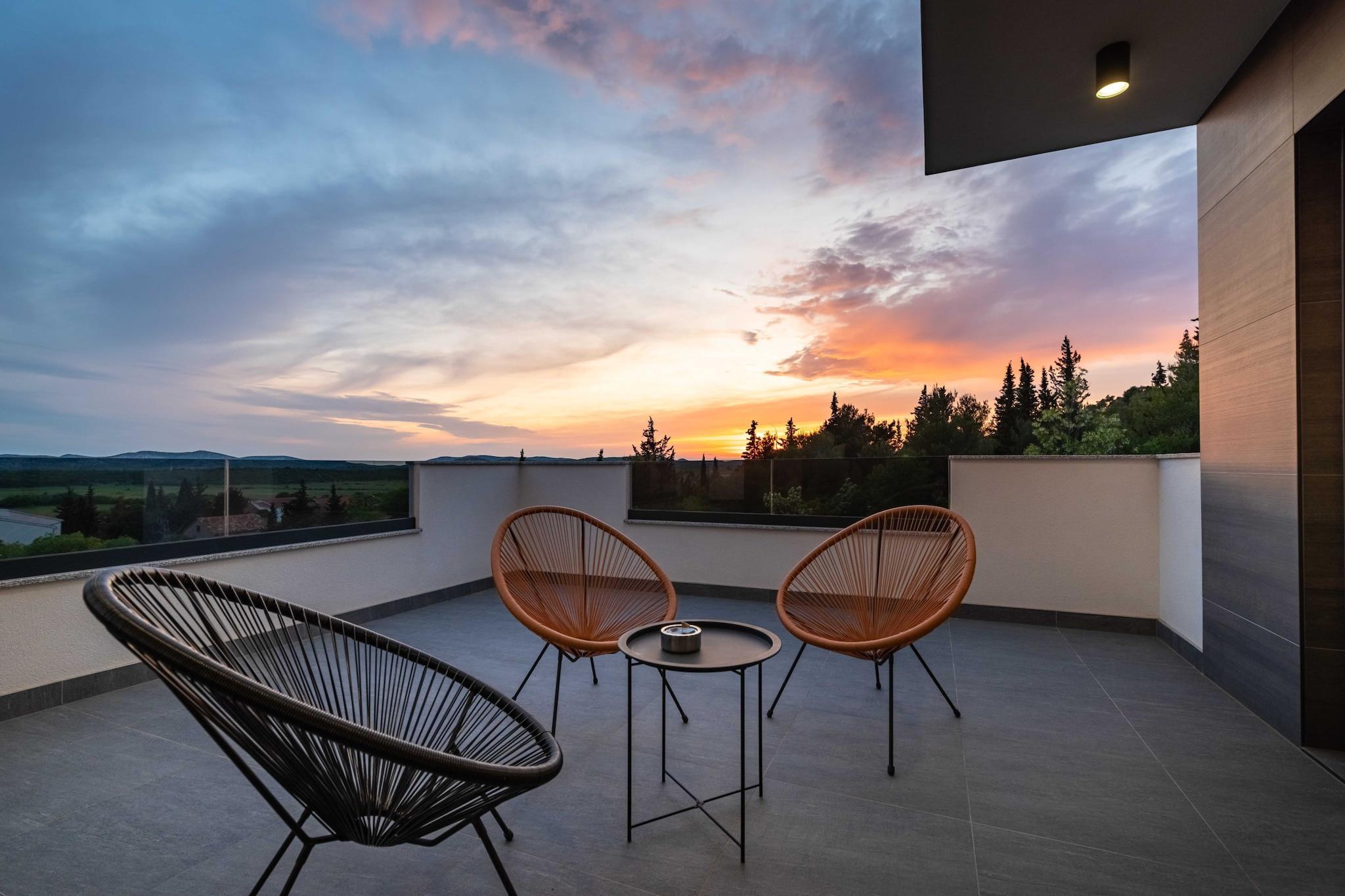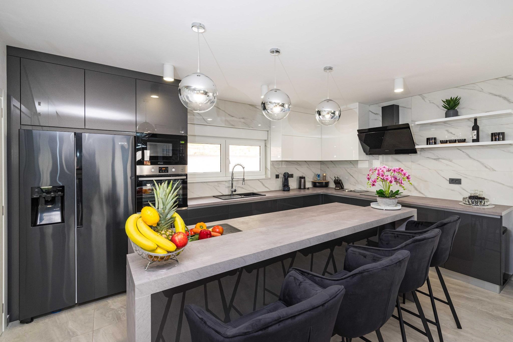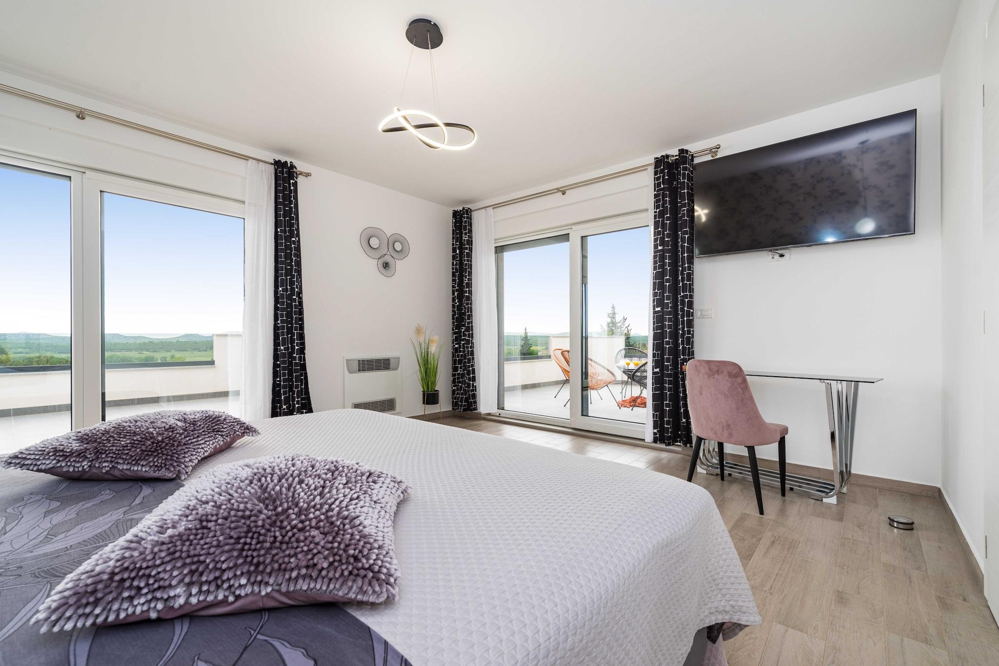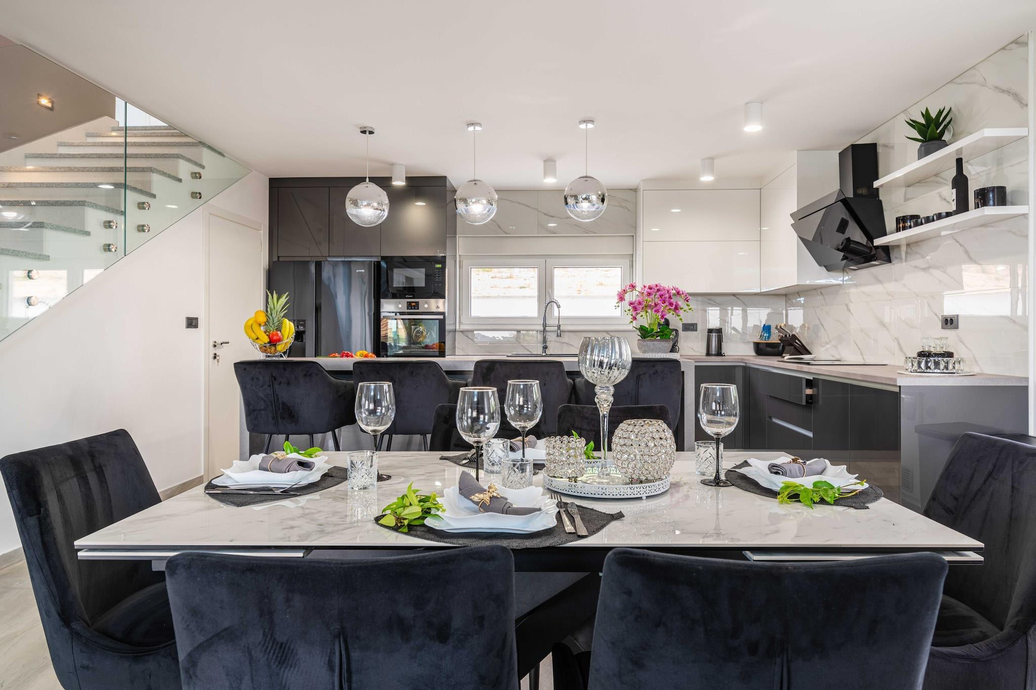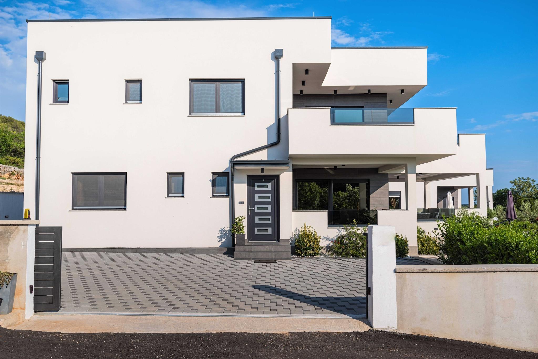 Dette elegante feriehuset ligger i den fredelige landsbyen Stankovci, bare 14 km fra nærmeste strand, og tilbyr den perfekte blandingen av komfort, privatliv og moderne luksus. Villaen er omgitt av vakker natur og har et stort privat svømmebasseng, et innbydende boblebad og panoramautsikt over det grønne landskapet. Den er ideell for familier eller en vennegjeng og kan huse opptil 8 gjester i stil og ro. Villaen på 300 m² er fordelt på to etasjer og kombinerer elegant, moderne design med møbler av høy kvalitet. Første etasje har en romslig stue og spisestue fylt med naturlig lys, et fullt utstyrt åpent kjøkken og tilgang til en overbygd terrasse med spisestue som er perfekt for måltider utendørs. Ovenpå finner du fire soverom med klimaanlegg og flatskjerm-TV, inkludert en master suite med eget bad og walk-in-garderobe. Det er totalt tre moderne bad, samt et vaskerom og gjestetoaletter. Utenfor kan gjestene slappe av ved det store bassenget, slappe av i boblebadet eller nyte et måltid i den sjarmerende tavernaen med et ekstra kjøkken, grill og sittegruppe. Den inngjerdede hagen har også solsenger, sykler og en lekeplass for barn, noe som gjør den ideell for både avslapning og rekreasjon. Med nasjonalparken Krka, naturparken Lake Vrana og kystbyen Pirovac innen kort kjøretur, er denne villaen det perfekte utgangspunktet for å utforske Dalmatias landsbygd, kyst og kultur mens du nyter luksuriøs komfort.