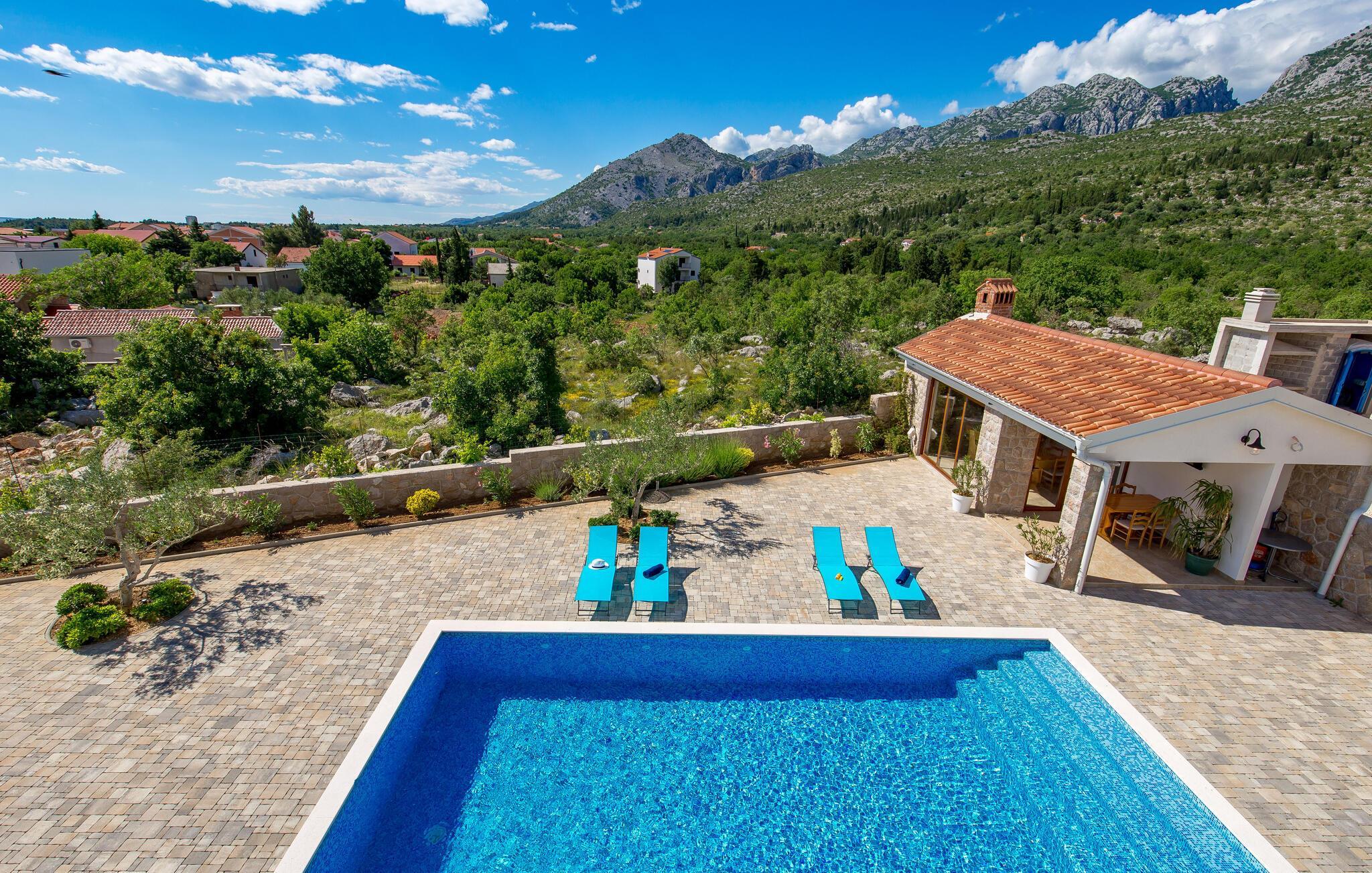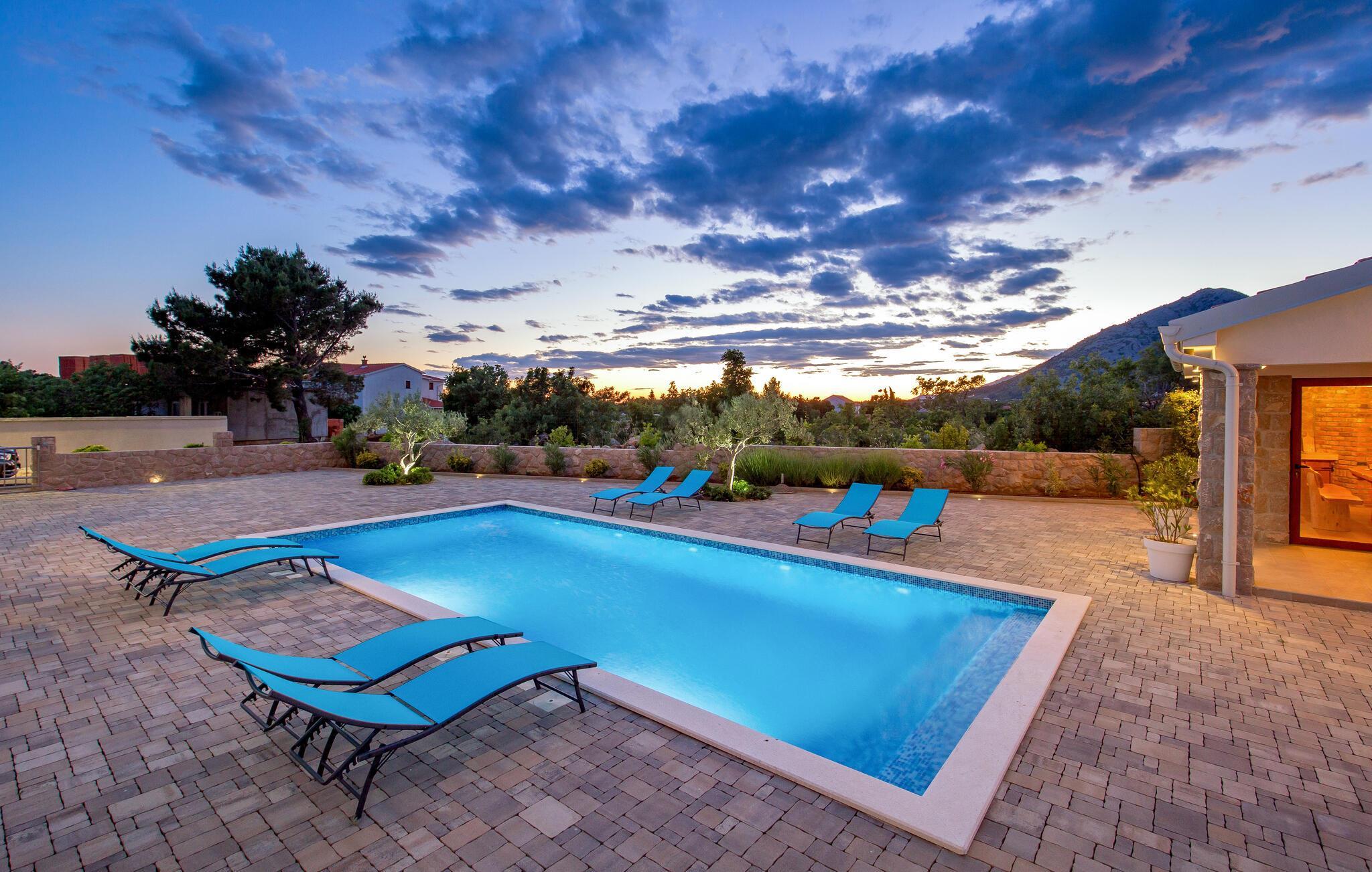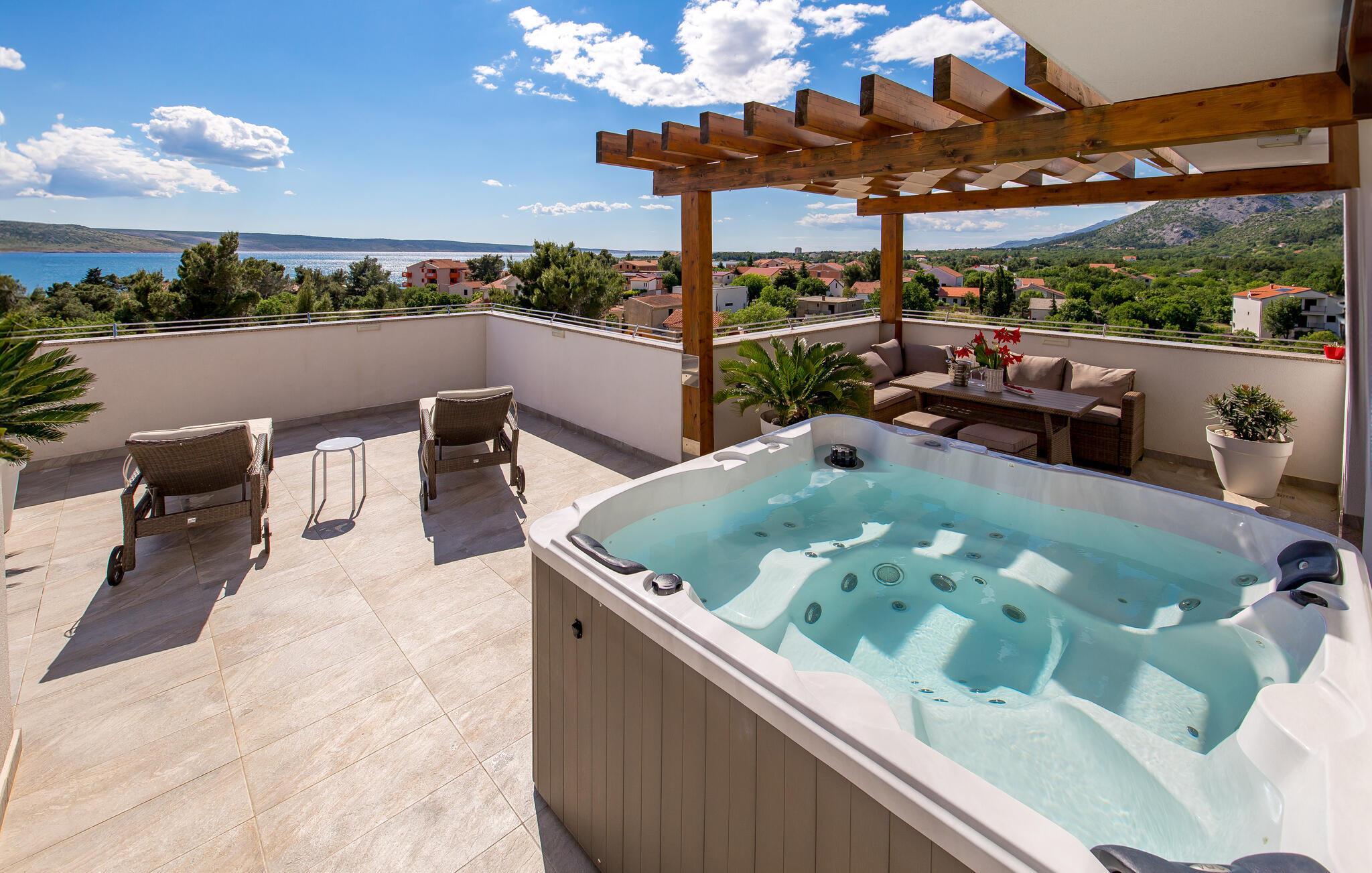 Det romslige feriehuset ligger i Seline, en idyllisk landsby ved foten av de majestetiske Velebit-fjellene. Start dagen på en avslappet måte med en familiefrokost ved det vakre spisebordet i tre med utsikt over hagen eller ved et av bordene i uteområdet, og diskuter planene for dagen i fred og ro. Unn deg et avslappende solbad ved bassenget og la blikket vandre over det vakre landskapet og det nærliggende havet. Svøm noen lengder fra tid til annen og nyt det forfriskende vannet. Du kan også slappe av i boblebadet på terrassen i øverste etasje og i badstuen på huset.