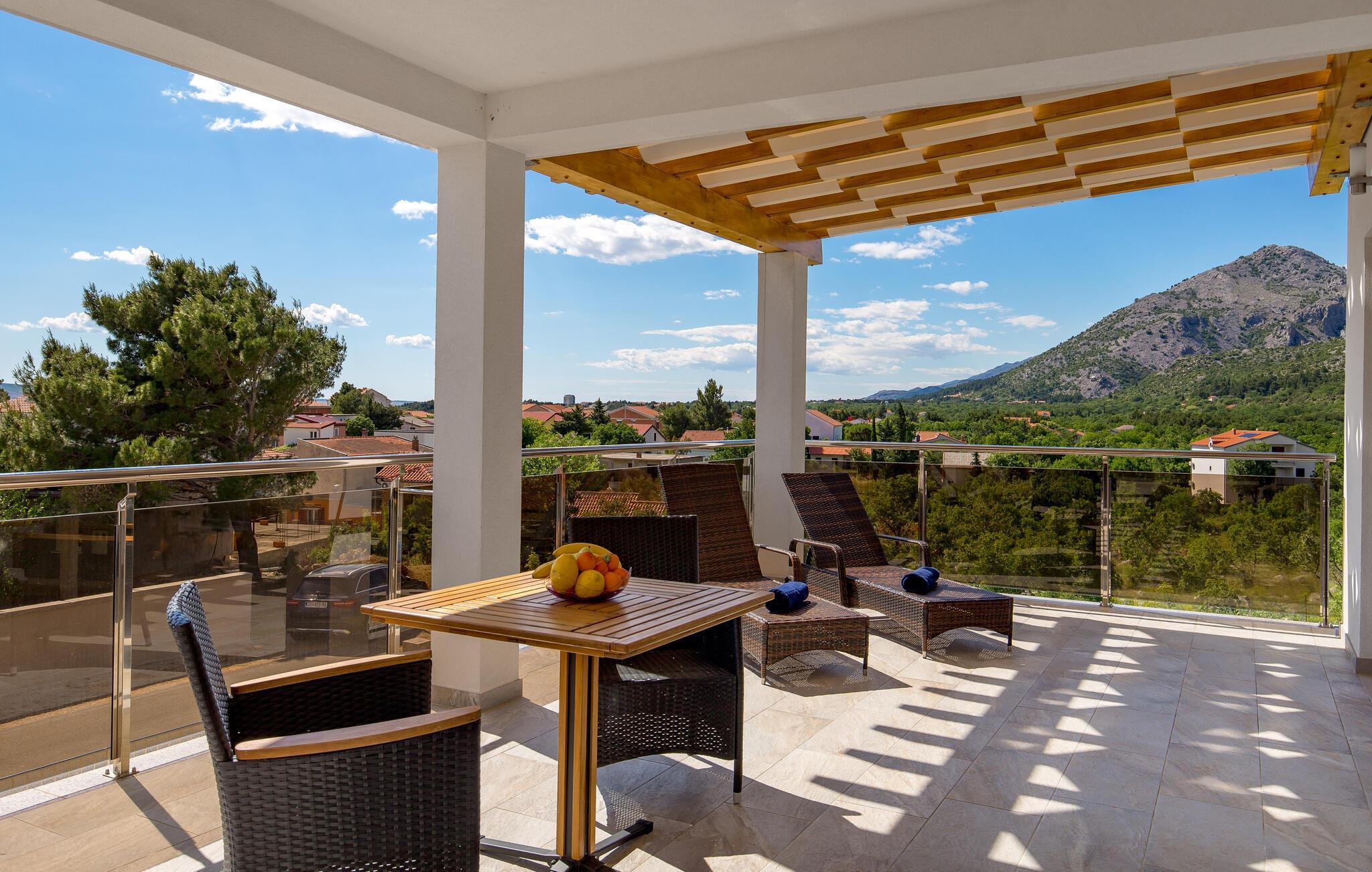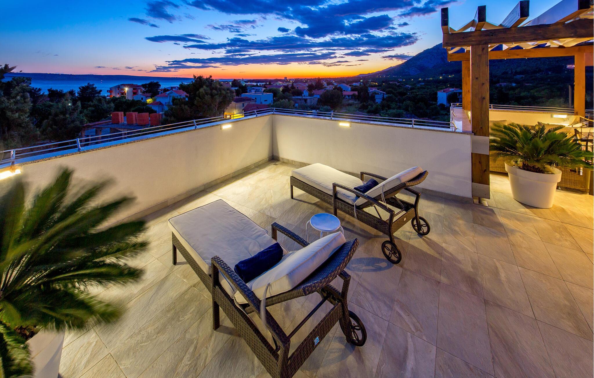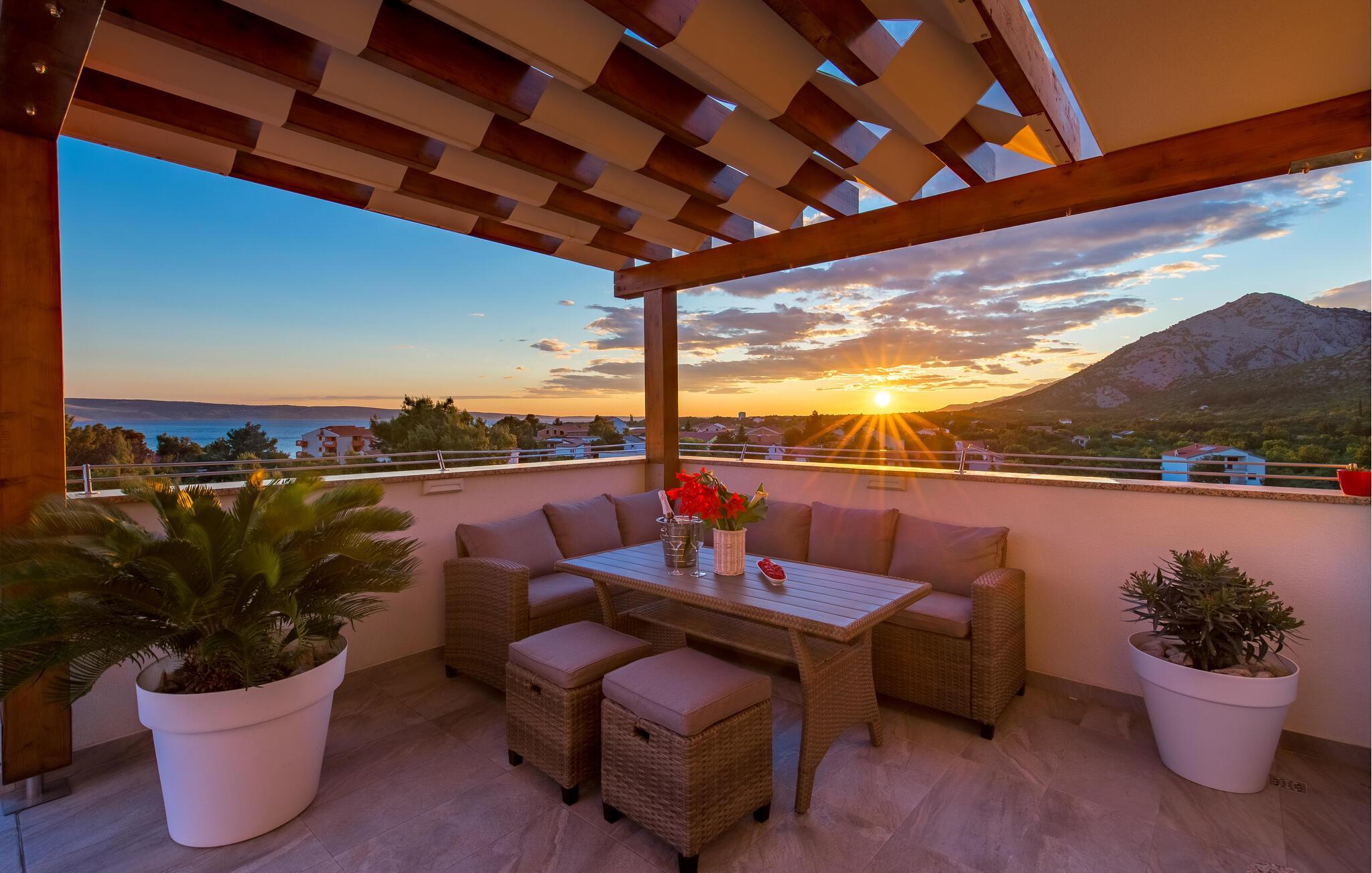Det romslige feriehuset ligger i Seline, en idyllisk landsby ved foten av de majestetiske Velebit-fjellene. Start dagen på en avslappet måte med en familiefrokost ved det vakre spisebordet i tre med utsikt over hagen eller ved et av bordene i uteområdet, og diskuter planene for dagen i fred og ro. Unn deg et avslappende solbad ved bassenget og la blikket vandre over det vakre landskapet og det nærliggende havet. Svøm noen lengder fra tid til annen og nyt det forfriskende vannet. Du kan også slappe av i boblebadet på terrassen i øverste etasje og i badstuen på huset.