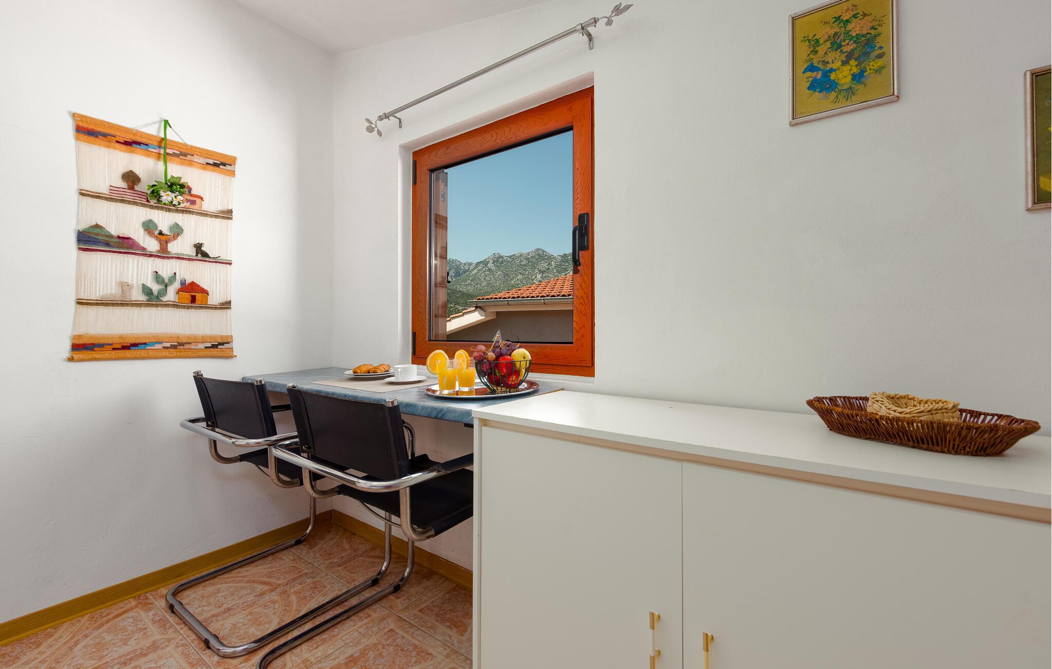 Bare en kort spasertur fra idylliske bademuligheter kan du føle deg som hjemme i denne koselige ferieleiligheten. Her kan du tilberede favorittrettene dine, planlegge aktivitetene dine ved det innbydende spisebordet og sette deg godt til rette i stuen for en morsom spillkveld.