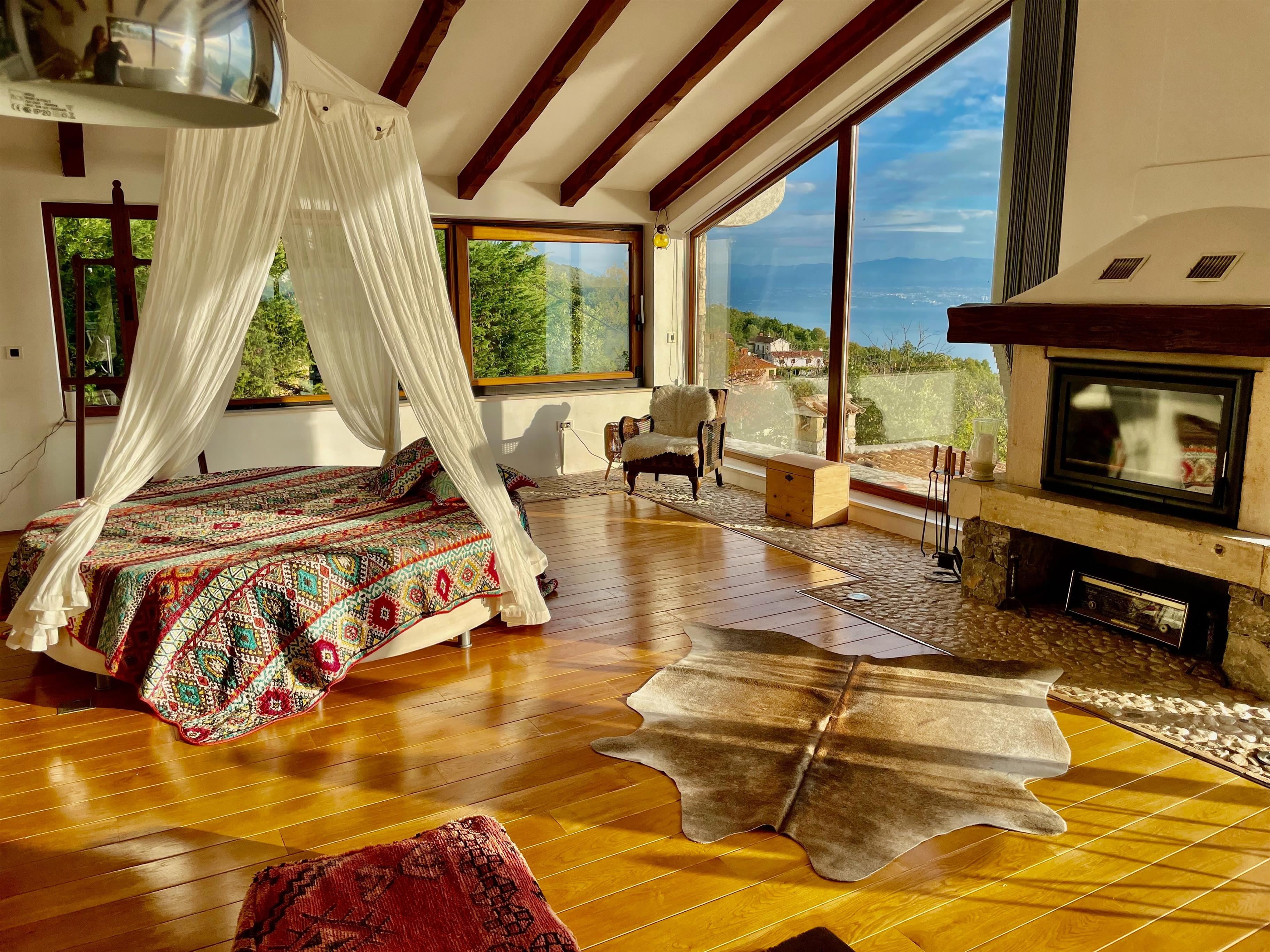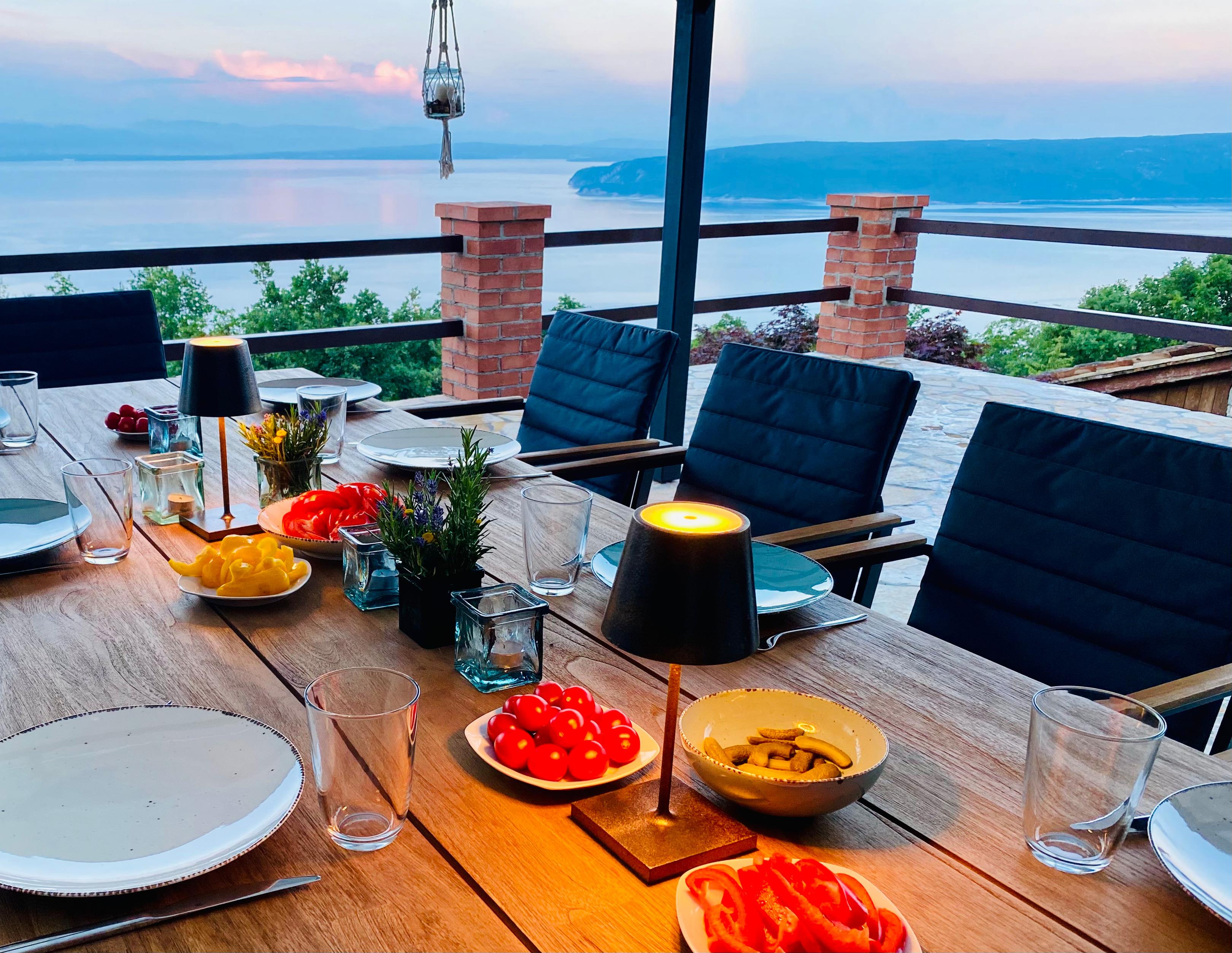In Richtung Meer ist es vom Boden bis zum Dachspitz verglast und bietet einen atemberaubenden Blick auf die gesamte Kvarner Bucht von Rijeka bis zu den Inseln Krk und Cres. Der lichtdurchflutete, offene Raum erzeugt ein Gefühl als würde die Villa mit der Natur verschmelzen. Nachts kann man die Lichter des Hafens von Rijeka über dem Meer glitzern sehen. Das Wohnzimmer ist u.a. mit ausgewählten Designerstücken eingerichtet und bietet jeden Komfort (z.B. großer Smart TV, Sonos Soundanlage, gemütliches Tagesbett etc.). Vom Wohnzimmer kann man direkt auf eine große, überdachte Terrasse gelangen. Eine Klimaanlage mit Heizfunktion sorgt sowohl im Sommer, als auch im Herbst und Winter für eine angenehme, ausgeglichene Raumtemperatur.