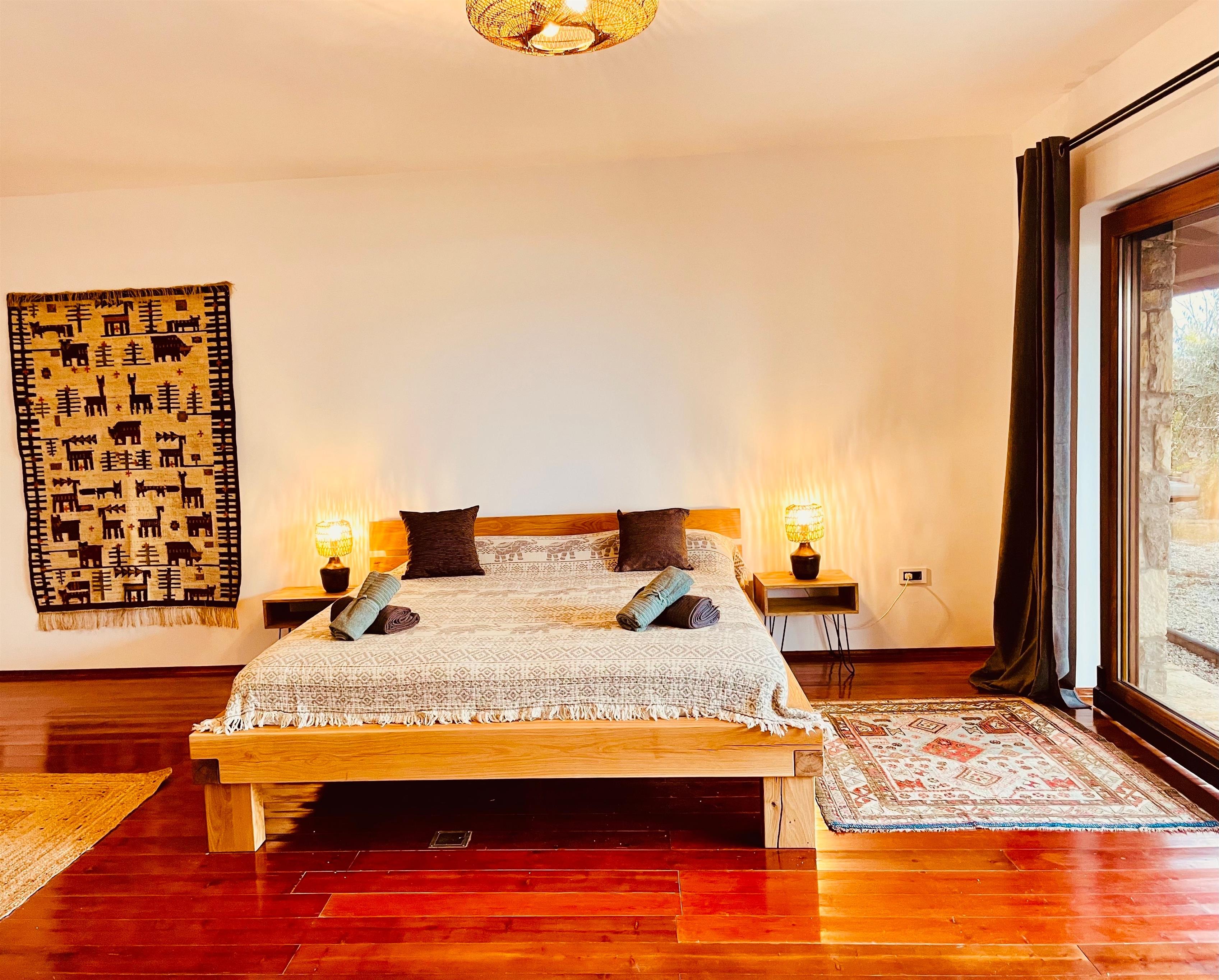 Hier befinden sich drei gemütliche und exklusiv eingerichtete Schlafzimmer, jedes mit eigenem Bad, Klimaanlage und wunderschönem Ausblick aufs Meer. Alle Zimmer haben direkten Zugang zu einer Terrasse mit alten Olivenbäumen und einer überdachten Pergola mit Kamin.