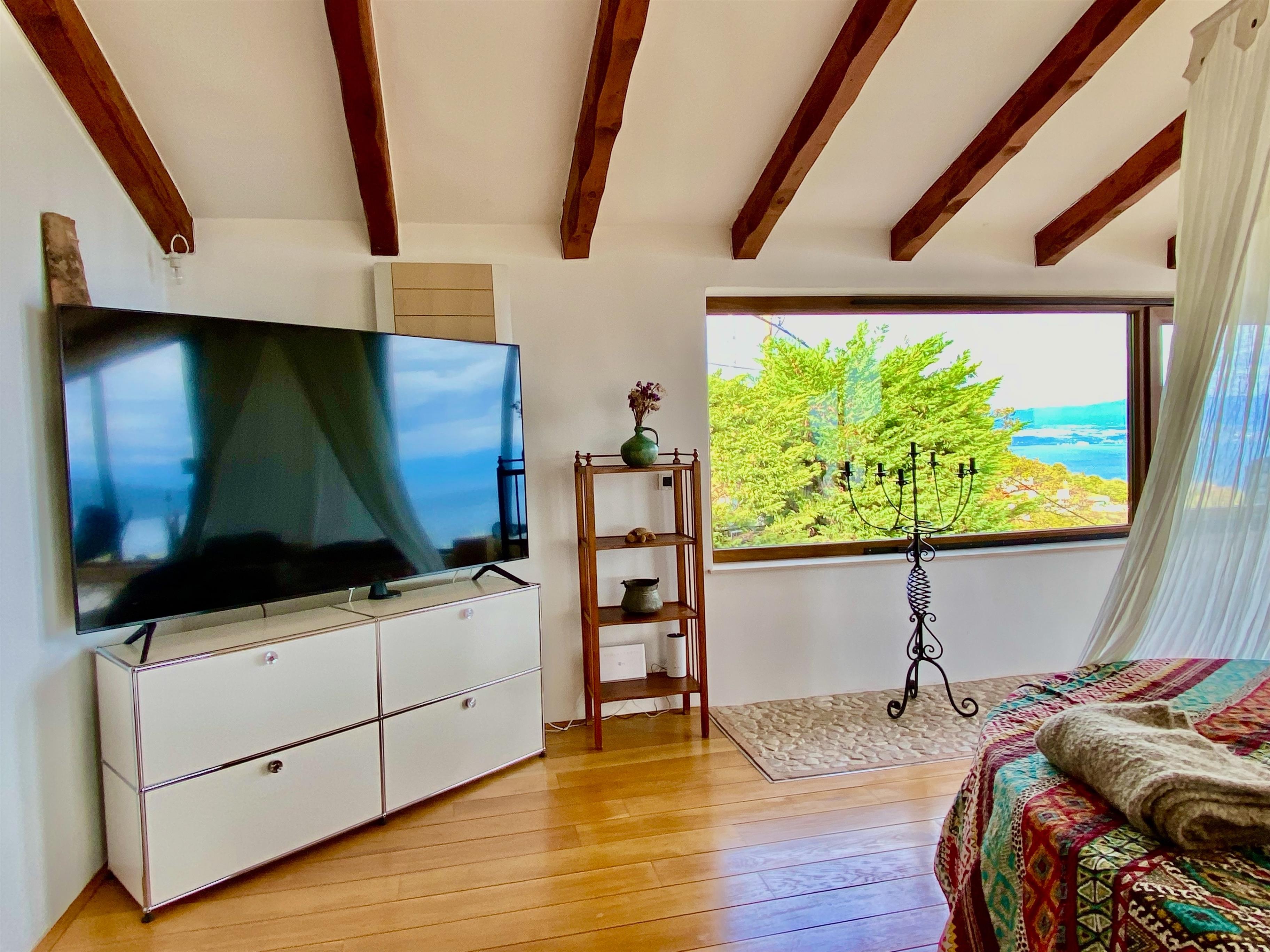 Es verfügt über ein großes Doppelbett (1,80m) und eine Schlafcouch. Das angeschlossene Badezimmer ist mit einer luxuriösen Jacuzzi Badewanne und einer Doppeldusche ausgestattet. Durch große Fenster können Sie auch vom Bad aus den Blick aufs Meer genießen.