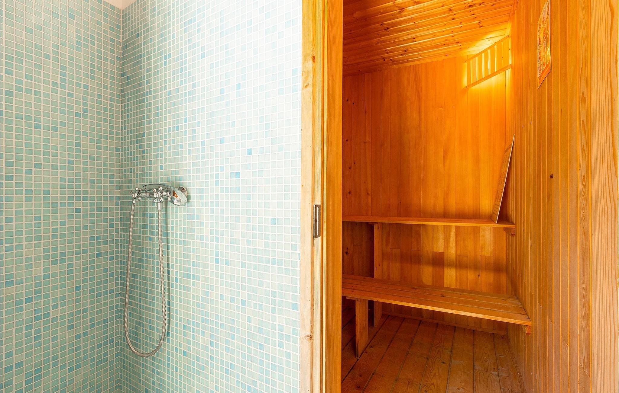 Det mindre huset er ideelt for en familie med barn som ønsker å være for seg selv. I første etasje er det en soveavdeling med 2 enkeltsenger som kan skyves sammen. Inngangen til soverommet i øverste etasje er gjennom trappen direkte fra rommet i første etasje. Det mindre huset har også 2 soverom. Badstuen gir et ekstra snev av luksus. Innenfor det inngjerdede uteområdet er det en stor hage med en koselig spiseplass, grill og et stort, vakkert basseng.