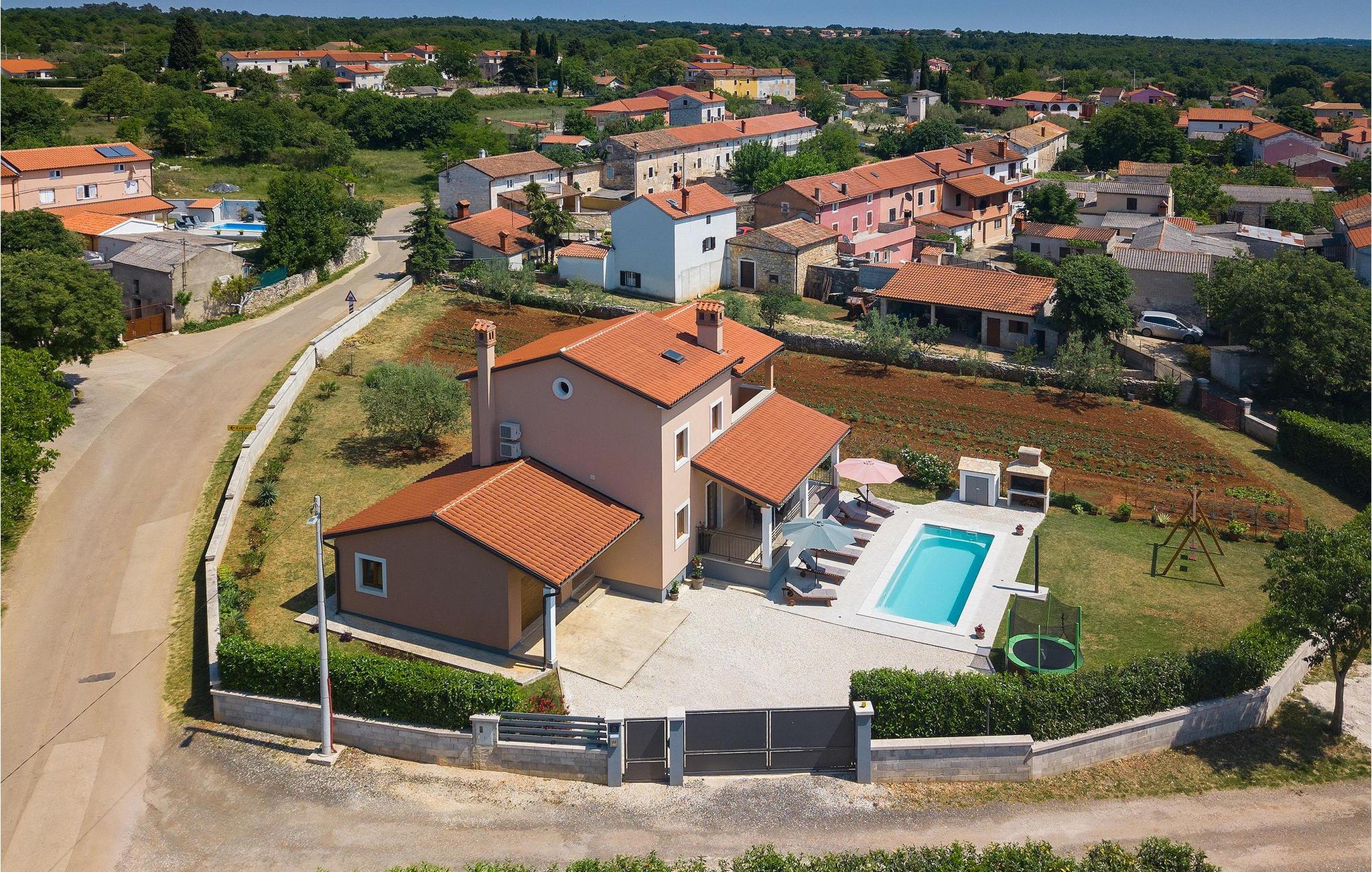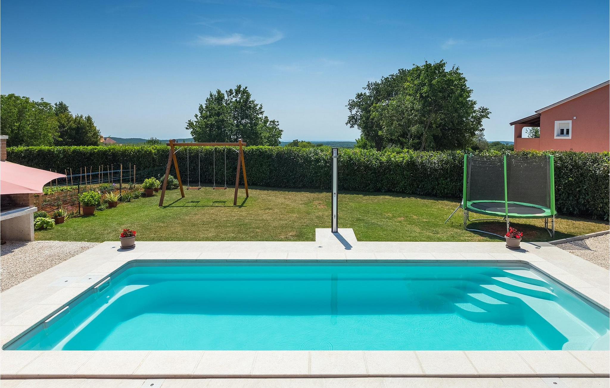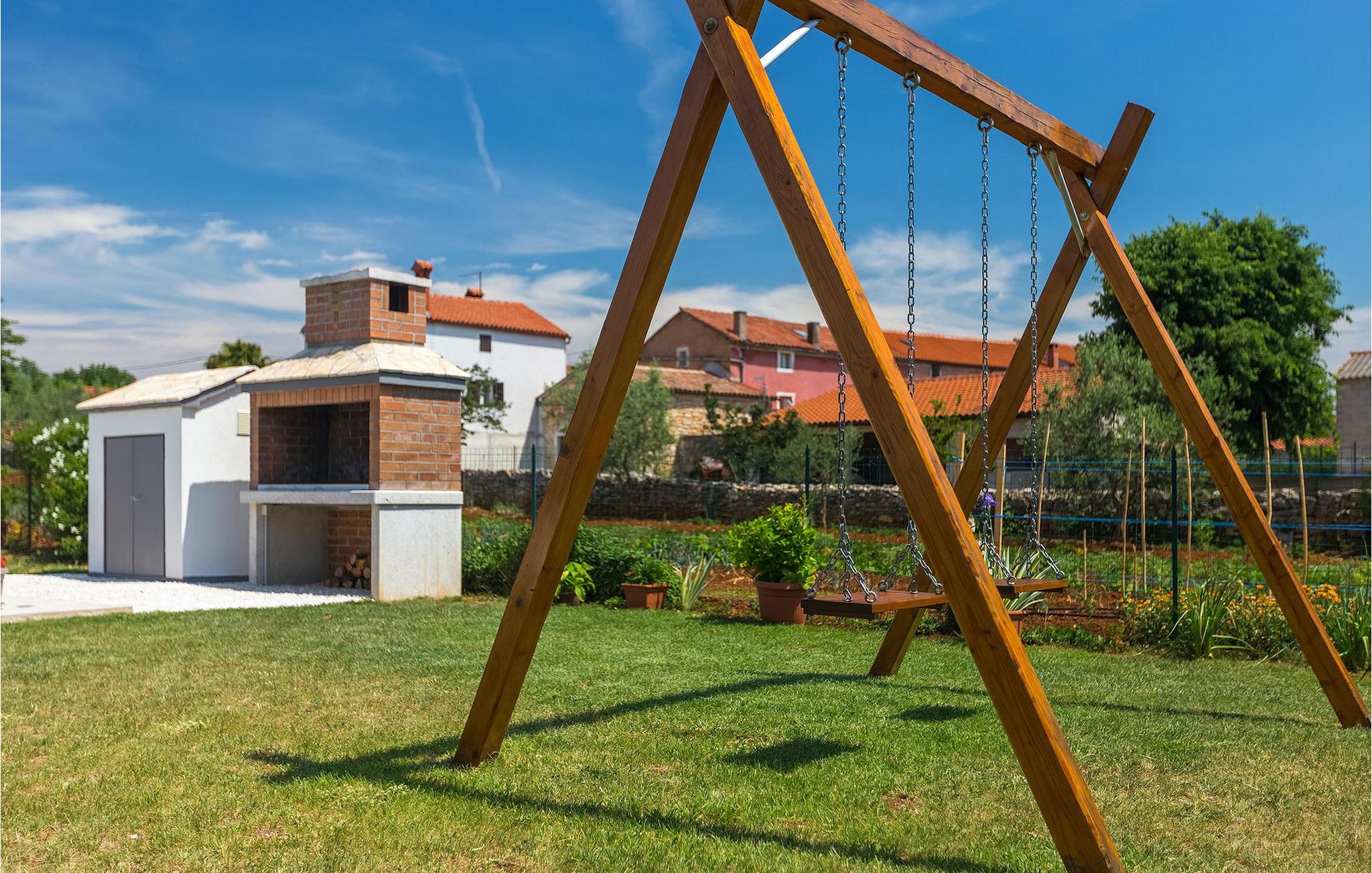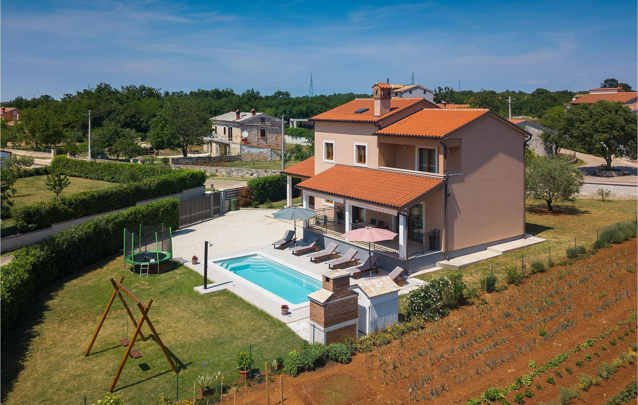 Denne vakre eiendommen ligger i hjertet av Istria. Villaens beliggenhet er ideell for en avslappende ferie, men også et utmerket utgangspunkt for en rekke dagsturer rundt halvøya. Villaen består av 3 soverom og tilbyr komfortabel innkvartering for 6 personer. Villaen ligger på en 900 m2 stor tomt hvor du har et utrolig innbydende privat basseng til disposisjon, samt en utendørsterrasse med spisebord for 6 personer og en kullgrill for de som ønsker å tilberede måltidene utendørs. Villaen er svært romslig innredet og utstyrt for at du skal føle deg hjemme så snart du ankommer. Første etasje består av en stue med en koselig sofa og TV, et fullt utstyrt kjøkken med spiseplass og utgang til utendørsterrassen. Ett bad ligger i første etasje og ett i andre etasje, sammen med de tre soverommene. Ett soverom har to separate enkeltsenger og to soverom har hver sin dobbeltseng. Ett av dem har utgang til den fantastiske loggiaen. Villaen er omgitt av en grønn eng som sammen med bassenget, husken og trampolinen gjør den til et utmerket valg for en flott familieferie.villaen ligger i hjertet av det landlige Istria, halvveis mellom Pazin og Pula, og er omgitt av et vakkert landskap med olivenlunder og idylliske vingårder. Sentrale Istria er kjent for sine vakre, pittoreske middelalderbyer. Du finner gode restauranter, kafeer, vingårder og butikker i Svetvincenat, en sjarmerende, rolig landsby i nærheten av villaen, som ikke bare er kjent for sin rike historiske og kulturelle arv, men også for sitt utmerkede autentiske istriske kjøkken. I denne regionen er det mange tur- og sykkelruter som gir deg en ekte istrisk opplevelse. De berømte, livlige byene langs den vakre kysten ligger bare en kort kjøretur unna i de pittoreske omgivelsene.