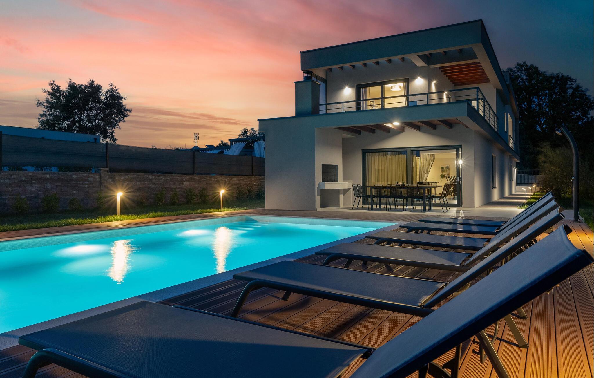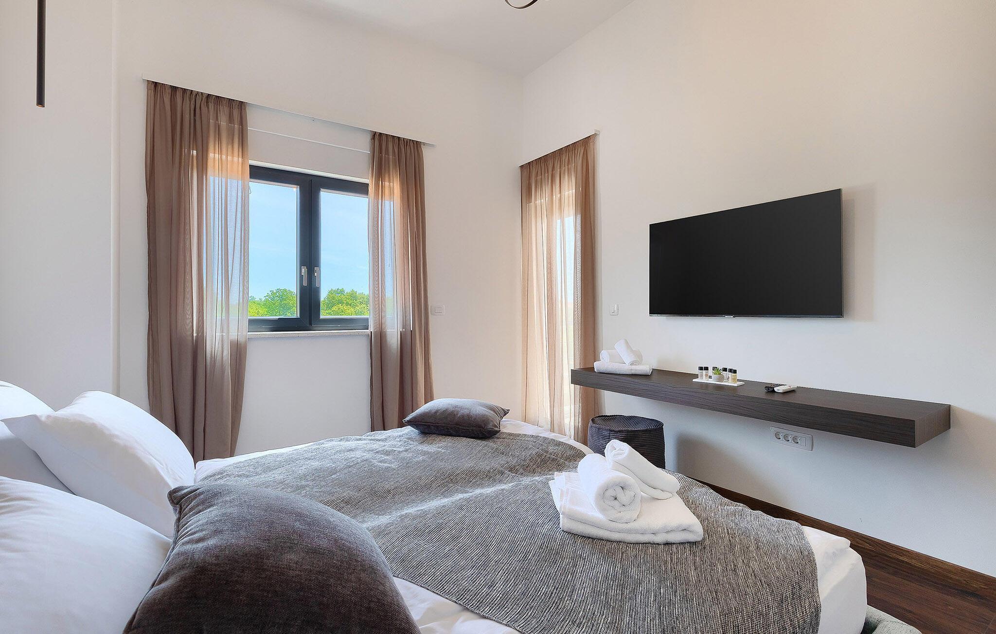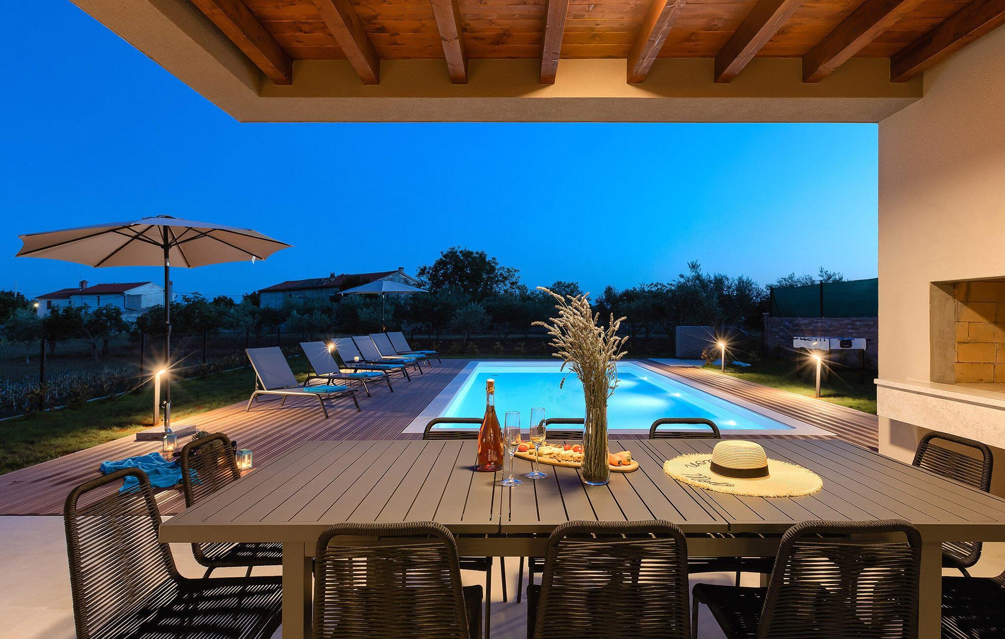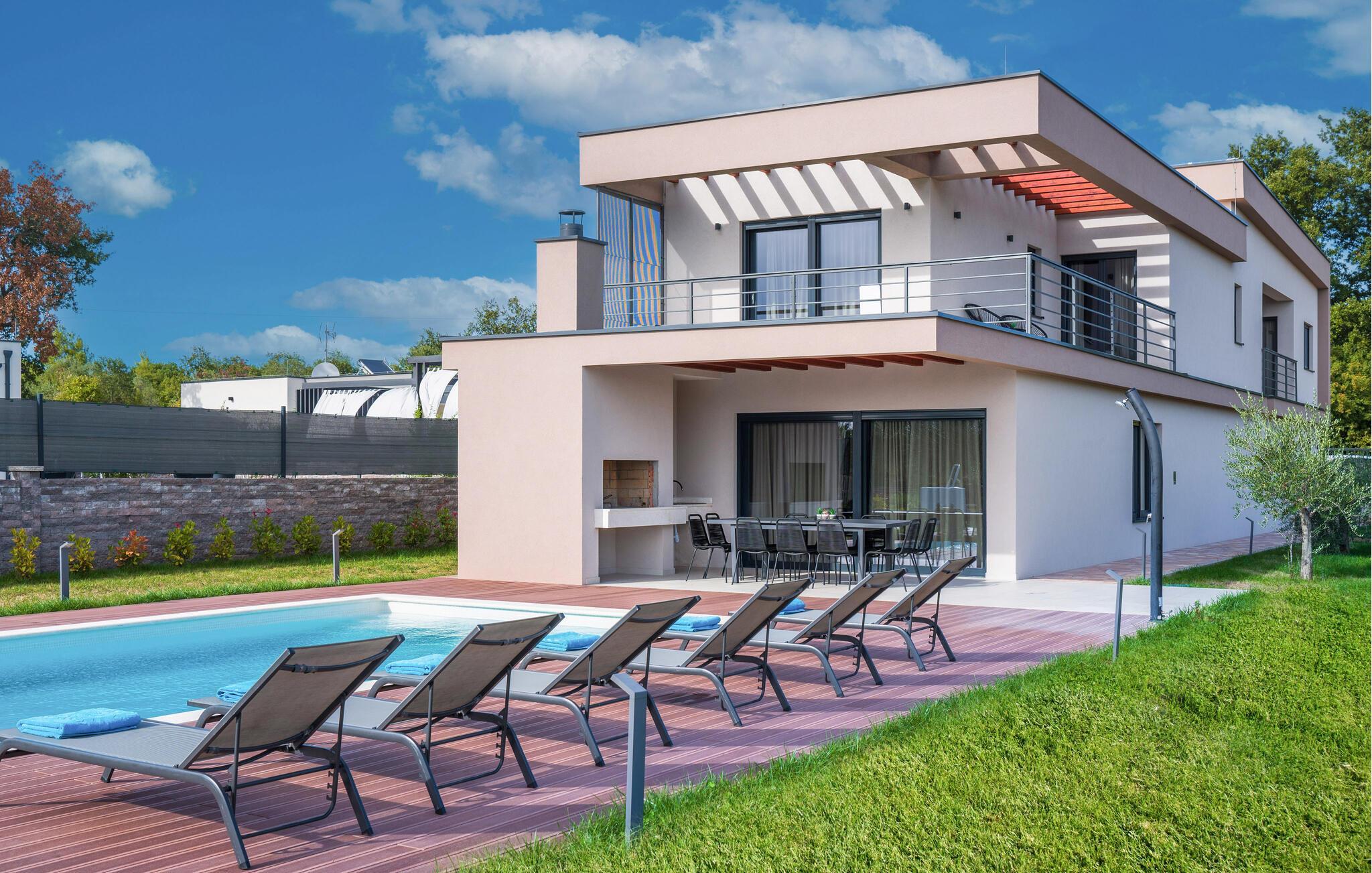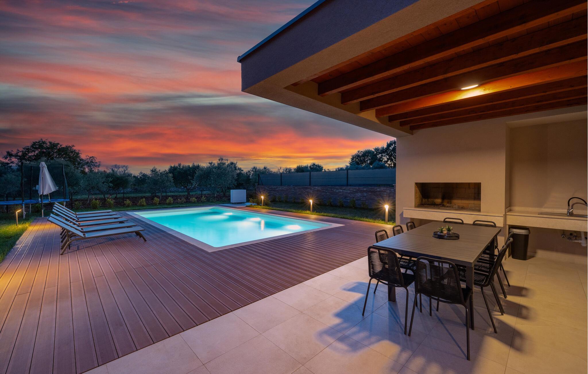 Den vakre familievillaen Artsi ligger i middelalderbyen Svetvincenat. Den fullt inngjerdede villaen tilbyr deg en intim ferie med familie, venner og kjæledyr. Foran villaen ligger et imponerende oppvarmet basseng på 50 m2. Nyt soling på solsengene eller tilbring uforglemmelige sammenkomster ved bassenget i det overbygde området ved et bord med ti sitteplasser. Tilbered tradisjonelle istriske retter på grillen for hele familien. Ha det gøy utendørs med dine kjære når du spiller bordfotball og bordtennis. De yngste gjestene kan ha det gøy på lekeplassen med sklie. Interiøret i villaen er innredet i en moderne stil. I første etasje av villaen er det en åpen planløsning med en romslig stue, et fullt utstyrt kjøkken der hele familien kan delta i matlagingen, og en spisestue med plass til ti personer der dere kan tilbringe tid sammen. I første etasje av villaen er det et separat toalett og det første soverommet med dobbeltseng og eget bad. De resterende fire soverommene med dobbeltsenger og eget bad ligger i andre etasje. Alle soverommene har TV og klimaanlegg, noe som er ideelt for en fredelig natts søvn og ønsket fred og ro. Alle soverommene har tilgang til villaens terrasse, hvor du kan nyte morgenkaffen eller en forfriskende drink mens du beundrer den vakre utsikten over den uberørte naturen. Velg denne vakre villaen, som er ideell for en familieferie med venner og kjæledyr i landlige omgivelser. Nyt en unik ferie i det indre av Istria. Villa Artsi ligger i nærheten av middelalderbyen Svetvincenat, i landsbyen Stokovci i det sør-sentrale Istria. Svetvincenat vil glede deg med sitt renessansetorg Placa med Morosini-Grimani-slottet, byens landemerke. En viktig del av Svetvincenats kulturarv er de bevarte restene av veggmalerier i Sankt Vincents kirke nær byens kirkegård og i Sankt Katarinas kirke. Denne spesielle byen tiltrekker seg besøkende med interessante og varierte lokale arrangementer. Det mest fremtredende er middelalderfestivalen, der du kan prøve deg på middelalderske leker. Du vil bli imponert over lokalbefolkningens gjestfrihet, det rike tradisjonelle istriske kjøkkenet og den ekstra jomfruolivenoljen. Oppdag skjønnheten i denne regionen på de mange sykkel- og turstiene. Besøk de viktigste turistsentrene i Istria: Rovinj, Porec, Labin, Pula. I Rovinj kan du besøke barokkirken St Euphemia, mens du i Porec kan se den bysantinske Eufrasius-basilikaen, som står på UNESCOs verdensarvliste. Gå ikke glipp av et besøk til Istrias største by Pula, der du kan se Pula Arena, Augustus-tempelet, Den gylne port og mange andre kulturelle og historiske monumenter. Til slutt kan du utforske Brijuni-skjærgården med den berømte Brijuni nasjonalpark. Temperaturen i det oppvarmede bassenget avhenger av eksterne faktorer, blant annet værforholdene, og vanntemperaturen kan derfor ikke garanteres.