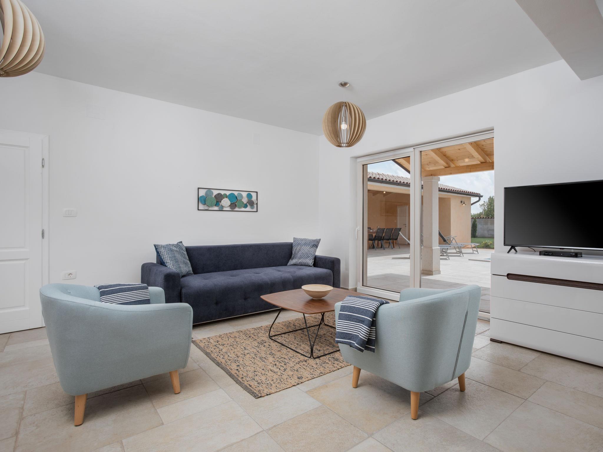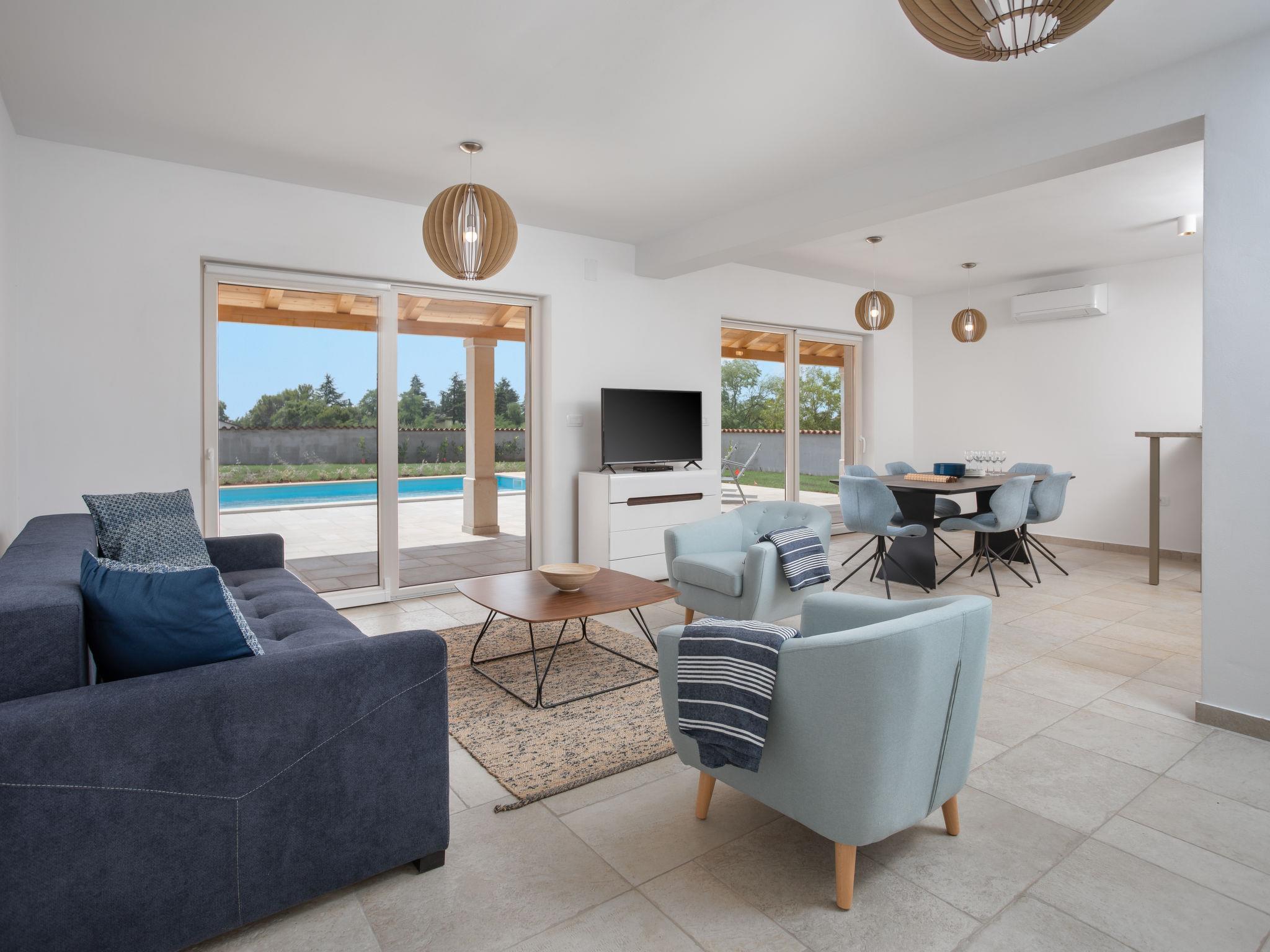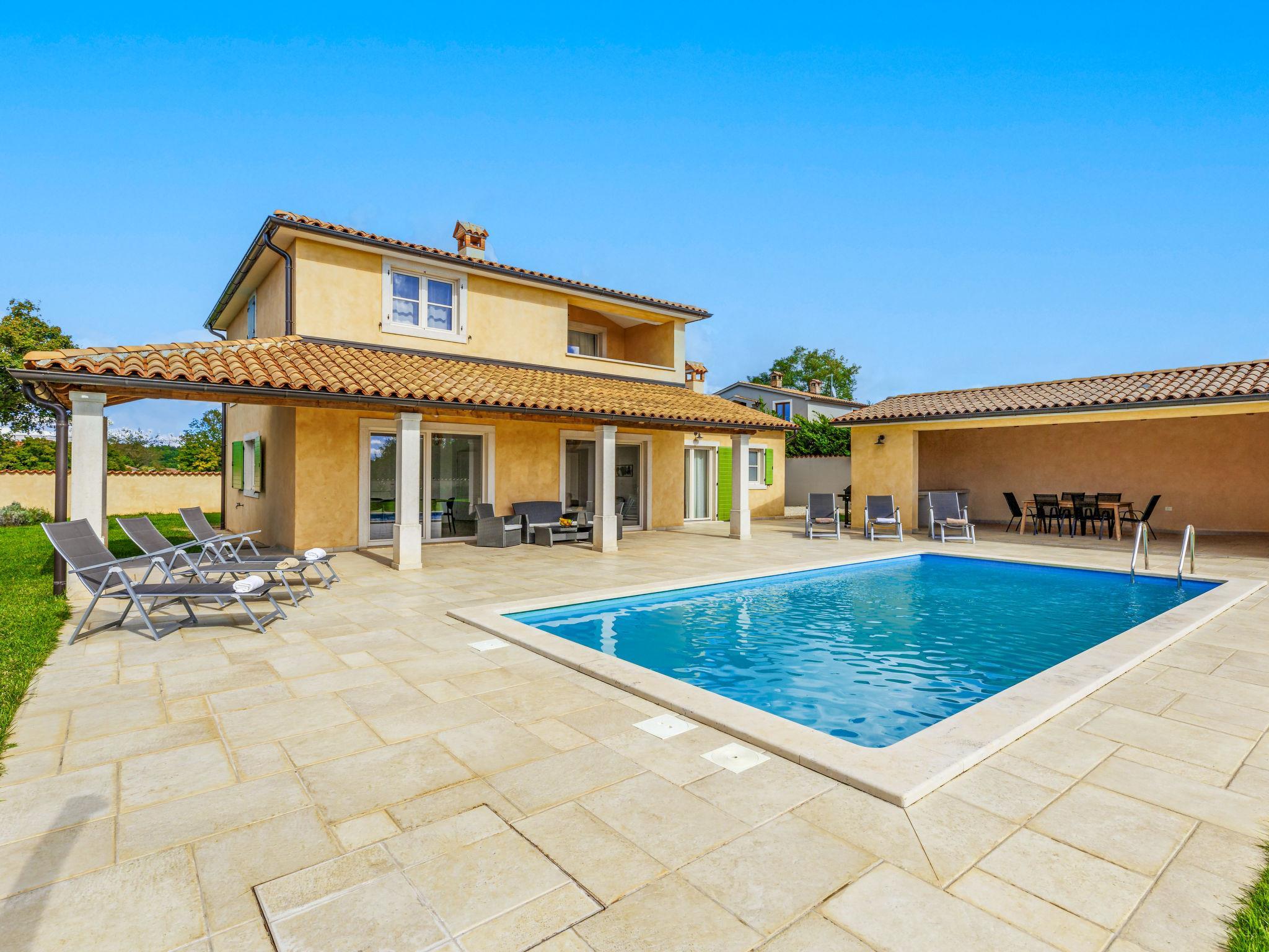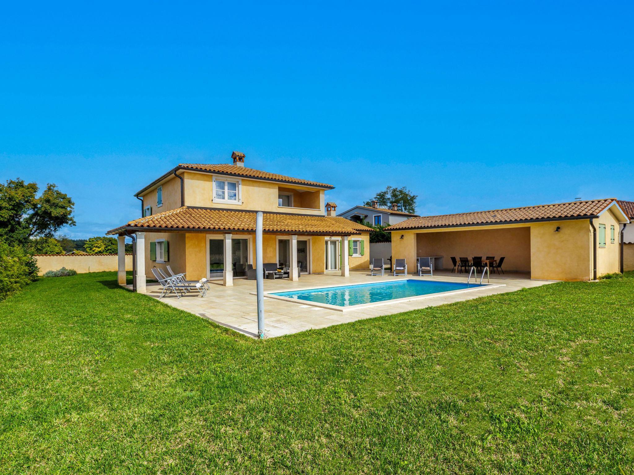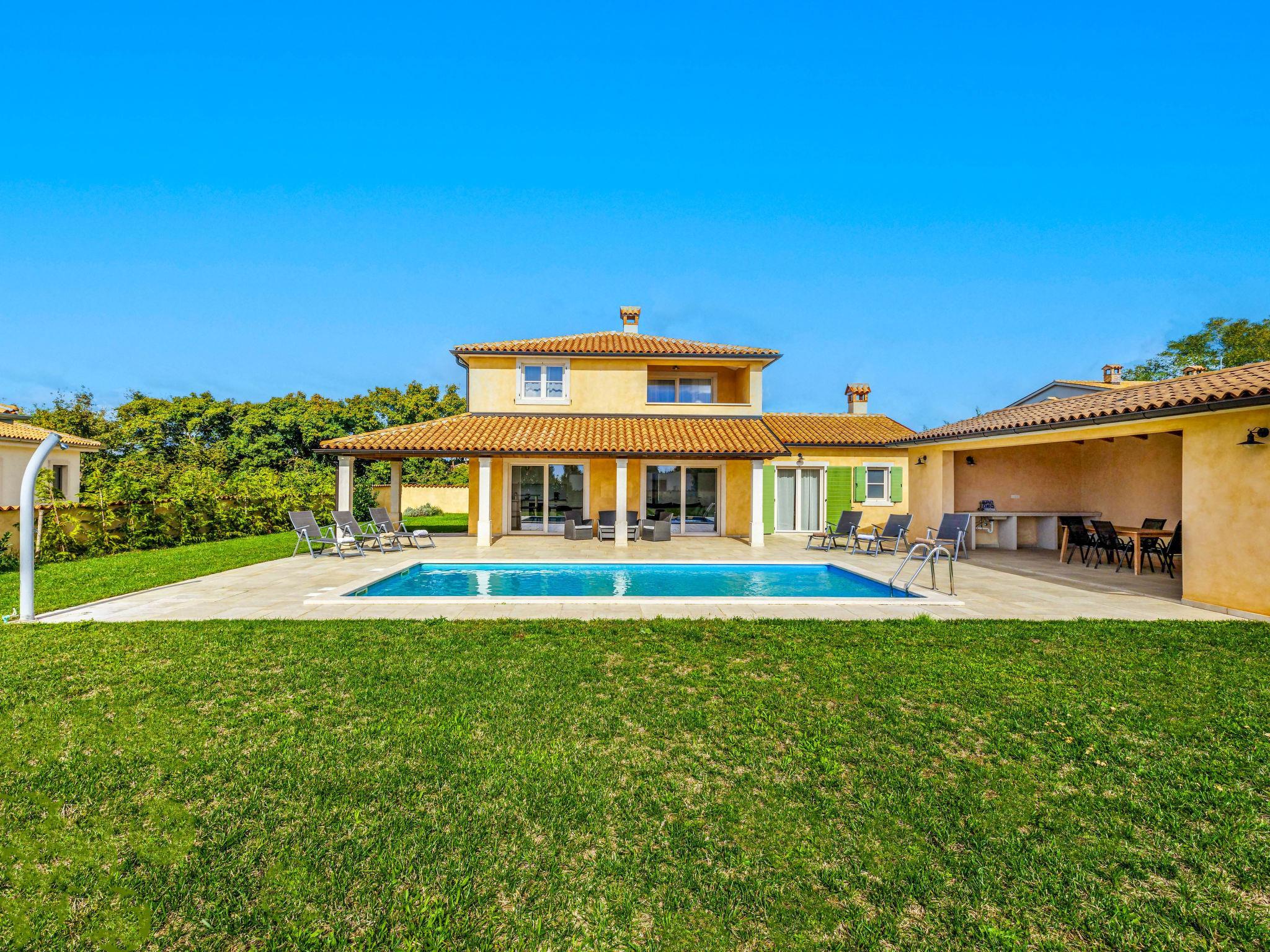 Villa "Flori", 2 storeys, built in 2019. 300 m from the centre of Svetvincenat, in a quiet, sunny position, 20 km from the sea. Private: property 1'080 m2 (fenced), garden with lawn and wildlife garden, swimming pool angular (8 x 4 m, 36 m2, depth 150 cm, seasonal availability: 01.May. - 30.Sep.). WC in the pool area, outdoor shower, terrace (35 m2), garden furniture, barbecue. In the house: internet access, washing machine. Motor access to the house (100 m via unmade road). Parking (for 4 cars) at the house on the premises. Shop, supermarket, restaurant 300 m, bus stop 1.1 km, pebble beach 20 km. Riding stable 15 km, walking paths from the house 50 m, cycle lane 100 m. Nearby attractions: adventure park 13 km, amusement park 3.5 km. By groups of young people double deposit is requested on arrival.