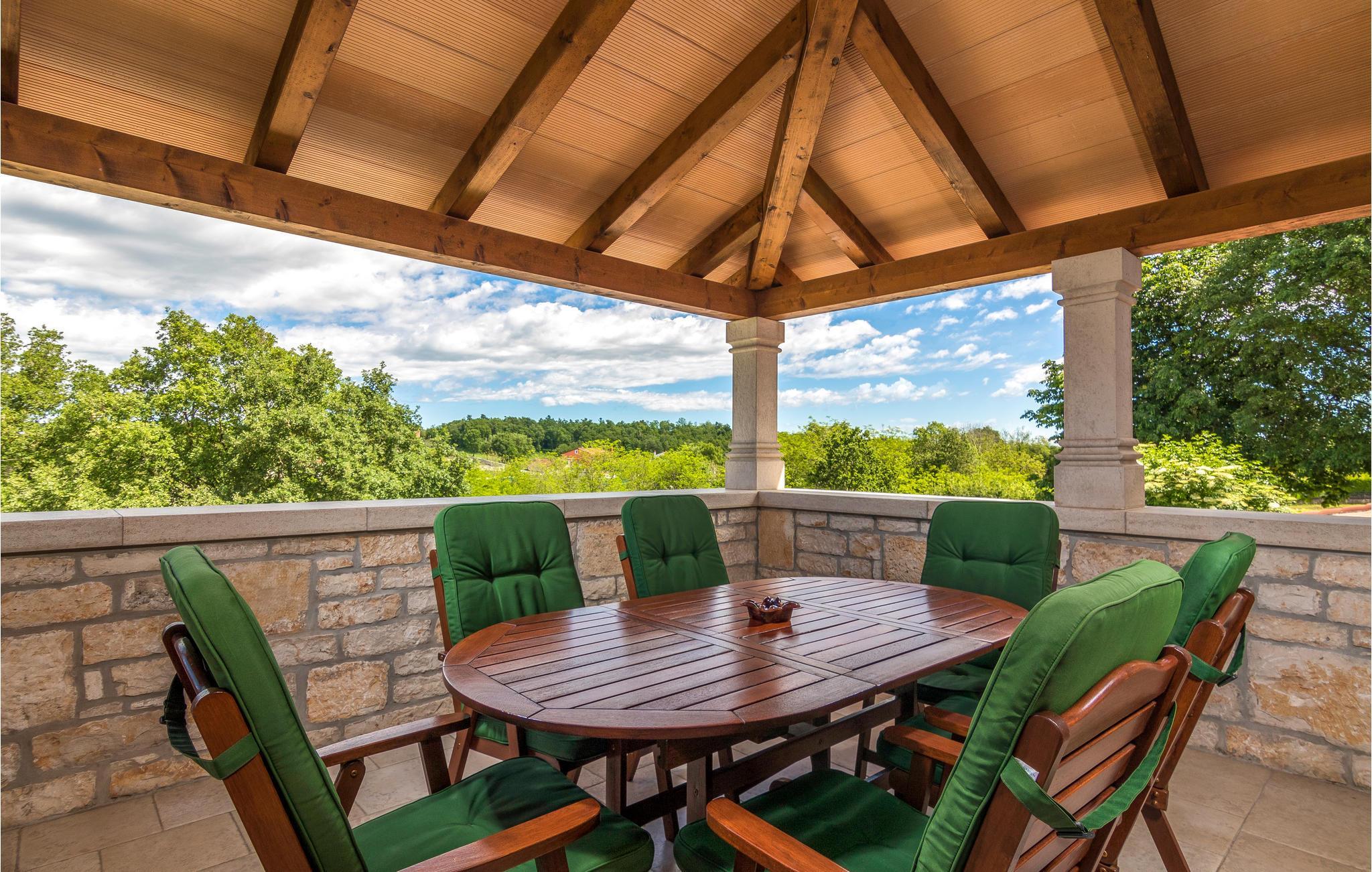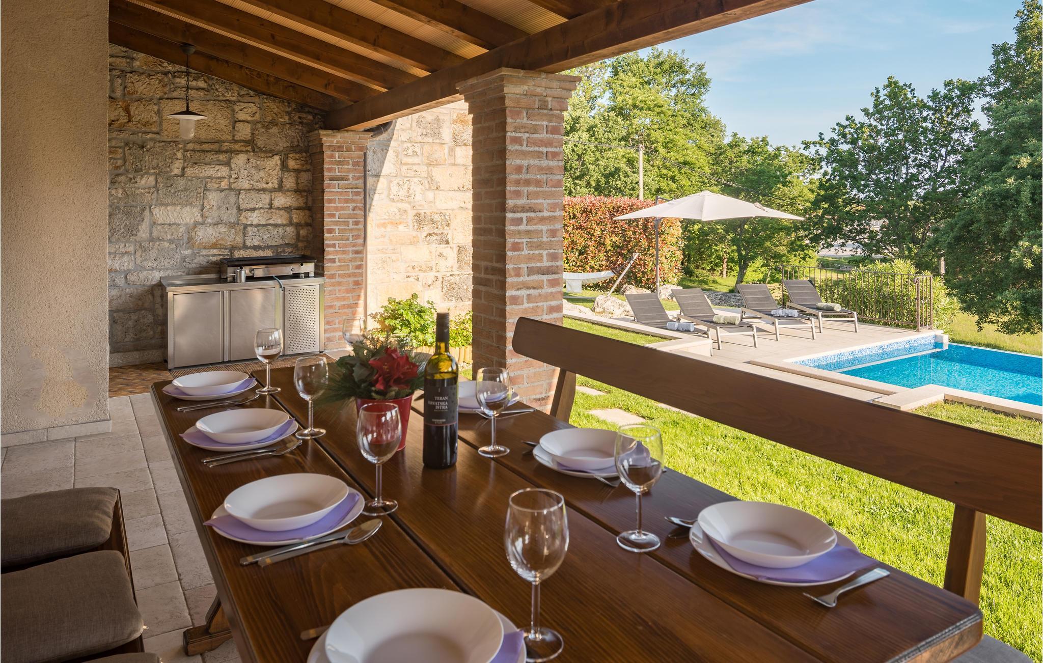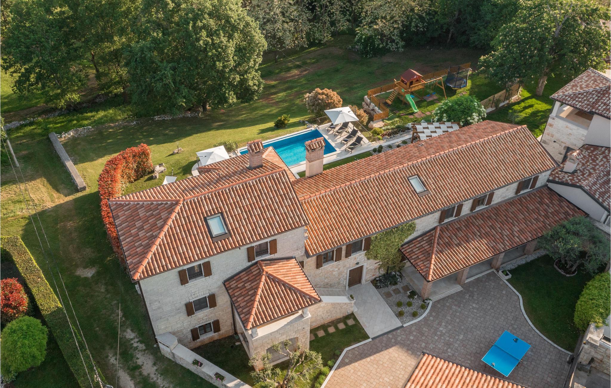 Dette vakre feriehuset ble renovert i 2014 i tradisjonell stil. Det tilbyr mye komfort og en vakker atmosfære. I første etasje finner du kjøkkenet med spiseplass samt et spillrom med biljardbord og en stor stue med peis gir hygge. Interne trapper fører til 1. etasje med soverommene og et lekerom med PlayStation. Eiendommen er delt inn i to deler. Den mindre delen fungerer som en overbygd parkeringsplass, mens den store delen, terrassert i kaskader, inneholder bassenget og en overbygd terrasse. Tilgang til denne delen er gitt fra stuen. Porec ligger en 15-minutters kjøretur unna.