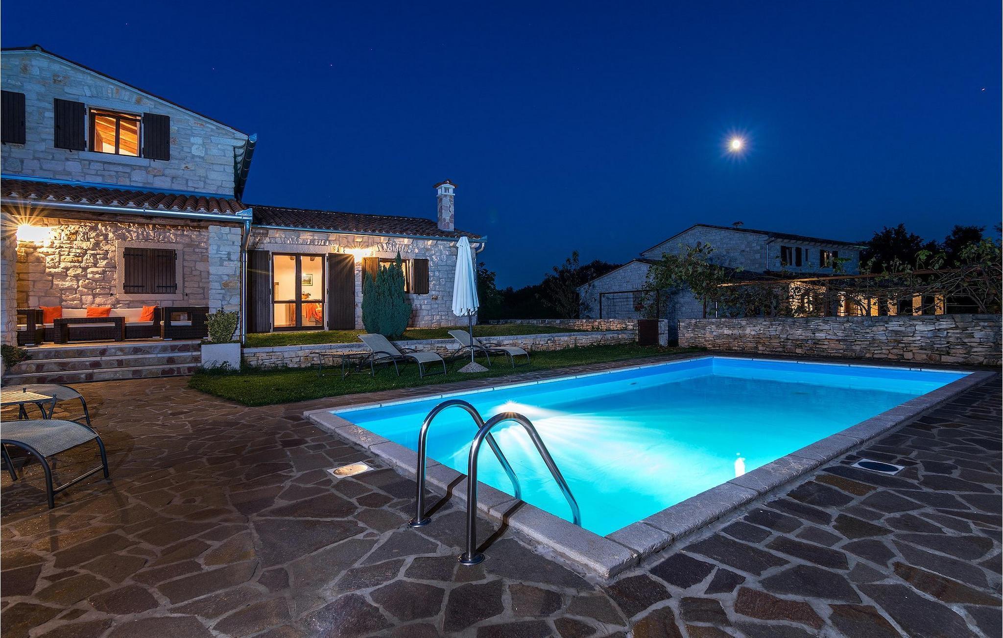 Den innbydende plenen i uteområdet innbyr til å ligge i en solstol under en parasoll ved bassenget. Hvis parasollen ikke gir nok skygge og beskyttelse, finnes det også en overbygd terrasse med grill hvor man kan nyte måltider sammen. Villaen har egen parkeringsplass for opptil tre bilerVillaen ligger like utenfor og i gangavstand fra landsbyen Kringa. Kringa ligger i sentrum av Istria, 5 kilometer sør for Tinjan, på stedet der det lå bygninger fra jernalderen, senere en romersk festning, og er den nest største bosetningen i Tinjan kommune. Regionen er kjent for sin gode mat, og det finnes mange gode restauranter i nærheten. Det indre av Istria med sine fjellandsbyer og vakre landskap er ideelt for bil-, sykkel- og fotturer. Adriaterhavskysten og turiststedet Porec, alle strendene i Istria, alle de historiske stedene og andre interessante steder ligger bare en kort kjøretur unna. En dagligvarebutikk, en bar og en utmerket taverna ligger innen gangavstand. Pula og nasjonalparken Brijuni-øyene ligger 45 minutter unna. Fra Porec kan du også ta en båttur til Venezia i Italia.