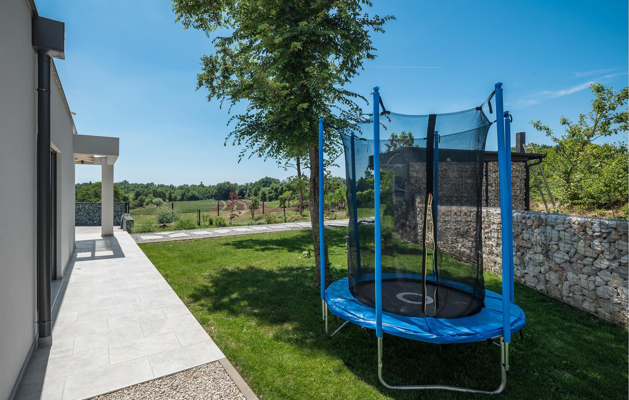 Fra stuen har du tilgang til terrassen og solterrassen med basseng. Den overbygde terrassen med hage- og salongmøbler er et flott sted å slappe av med en kjølig drink. Barna vil elske de mange aktivitetene og spillene som rutsjebanen, lekehuset eller husken.