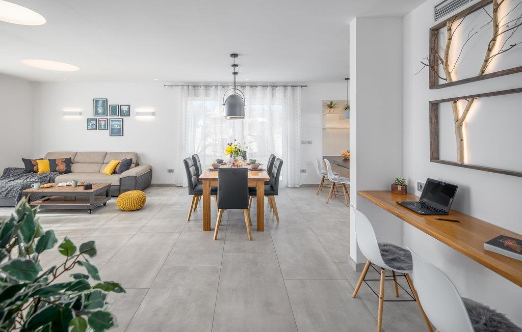 Feriehuset er vakkert og moderne innredet og tilbyr rikelig med innhold for barn og familie. Takket være gulvvarme i hele huset er det også behagelig på kjøligere dager. På varme dager sørger klimaanlegget for avkjøling. Huset er spredt over en etasje med 2 soverom, 2 bad, separat toalett, spisekjøkken og stue.