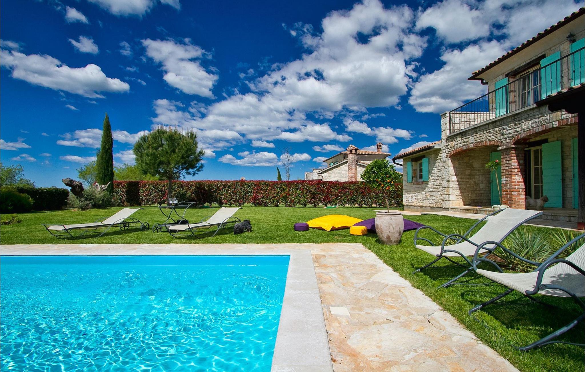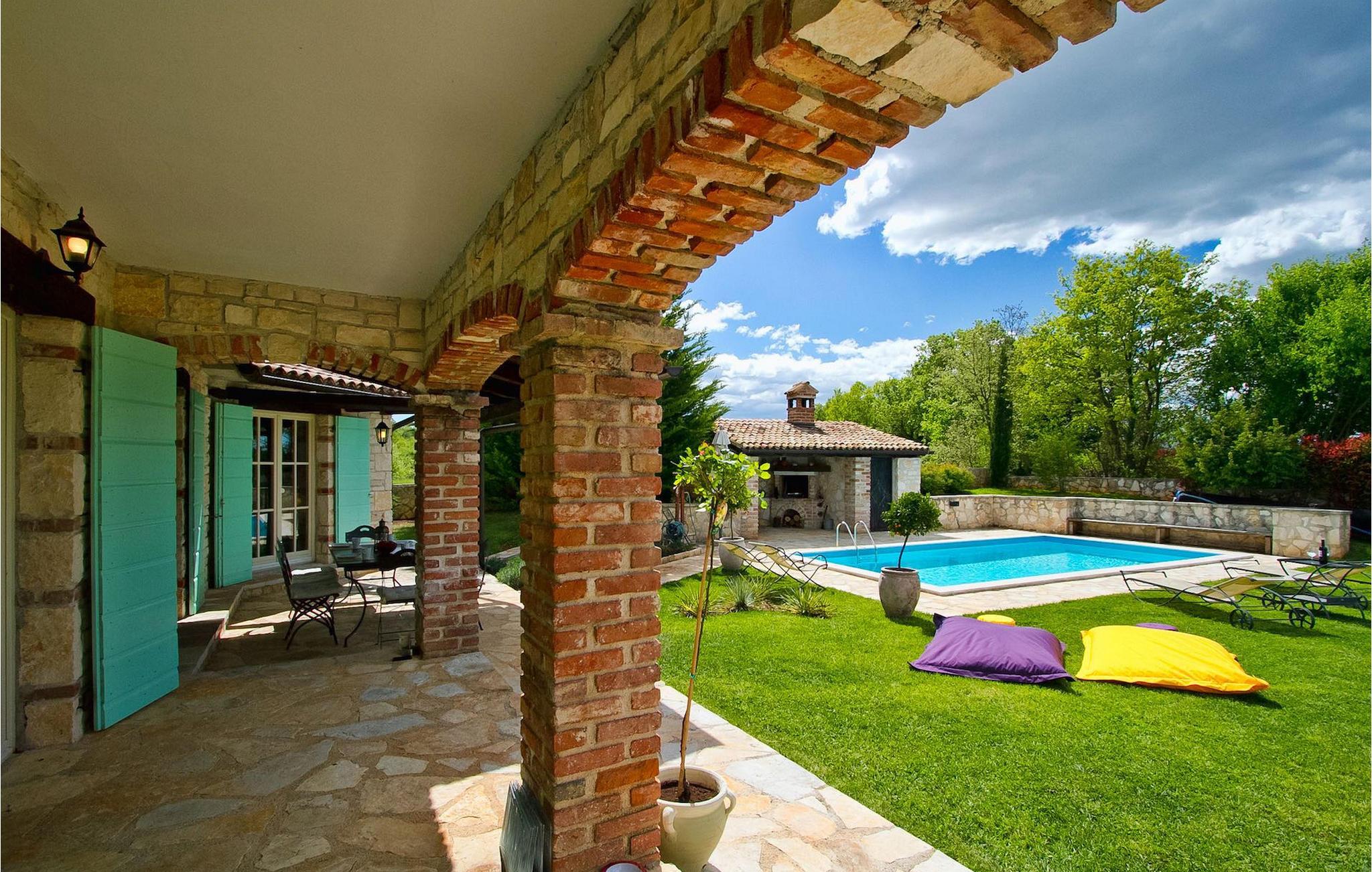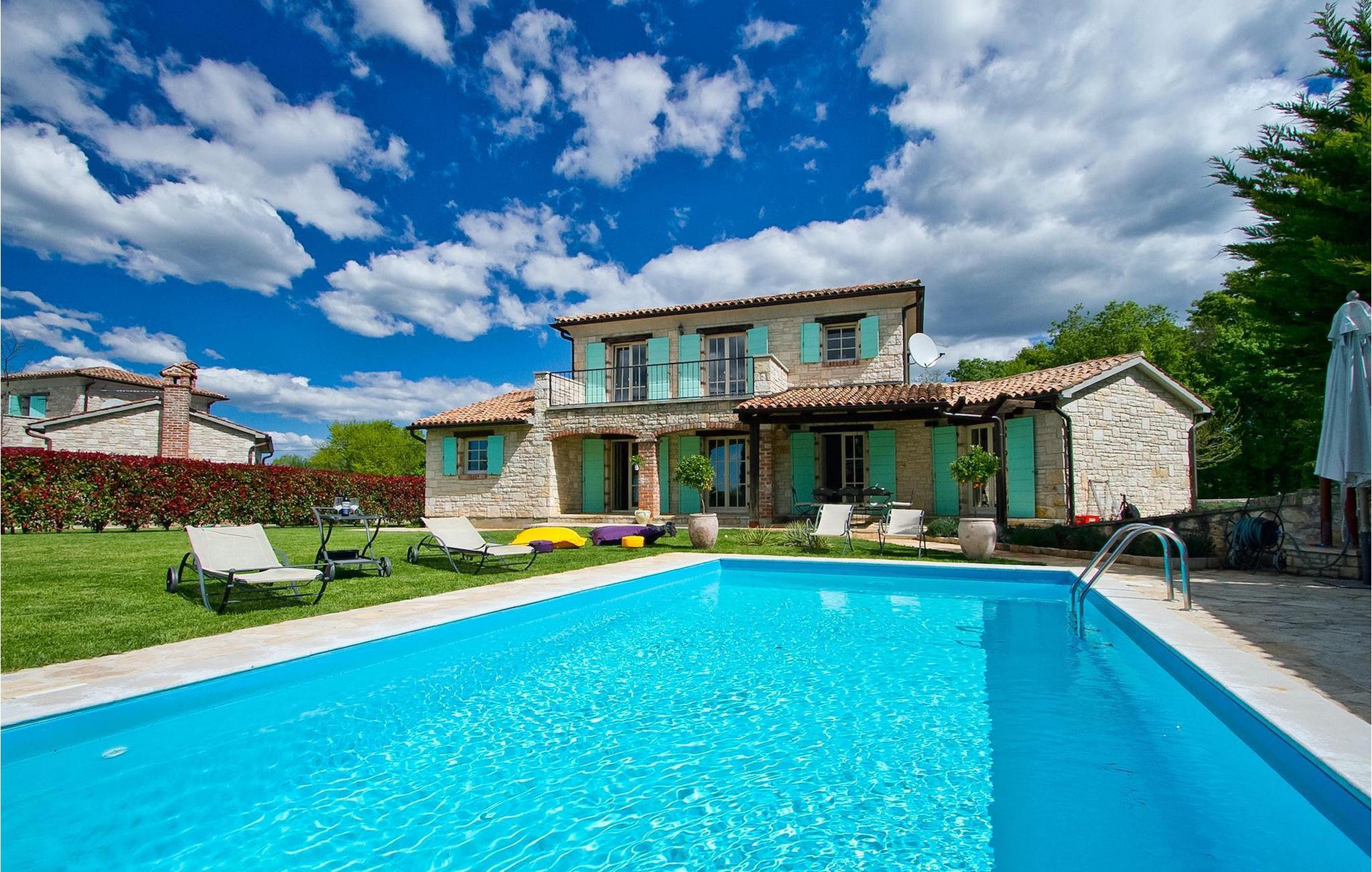 Vakkert og smakfullt innredet feriehus for drømmeferien. Feriehuset byr på luksuriøs innkvartering i 3 soverom, som er innredet med stor sans for detaljer. Overalt finner du gjenstander som passer inn i husets avslappende atmosfære. Feriehuset er velutstyrt og godt vedlikeholdt. Huset har en inngjerdet parkeringsplass for to biler. Nyt det store svømmebassenget og forfrisk deg på varme istriske sommerdager. Huset har klimaanlegg, satellitt-TV, Wi-Fi og et sikkerhetssystem for våre gjester. Feriehuset har en vakker beliggenhet i utkanten av en liten landsby i Istria. Sentrale Istria er en av de sjeldne middelhavsregionene som kjennetegnes av et uberørt naturlandskap og en rik kulturarv. Mange bukter og åser forbinder og skiller de mange fortryllende bosetningene og skaper et nesten uvirkelig landskap.
