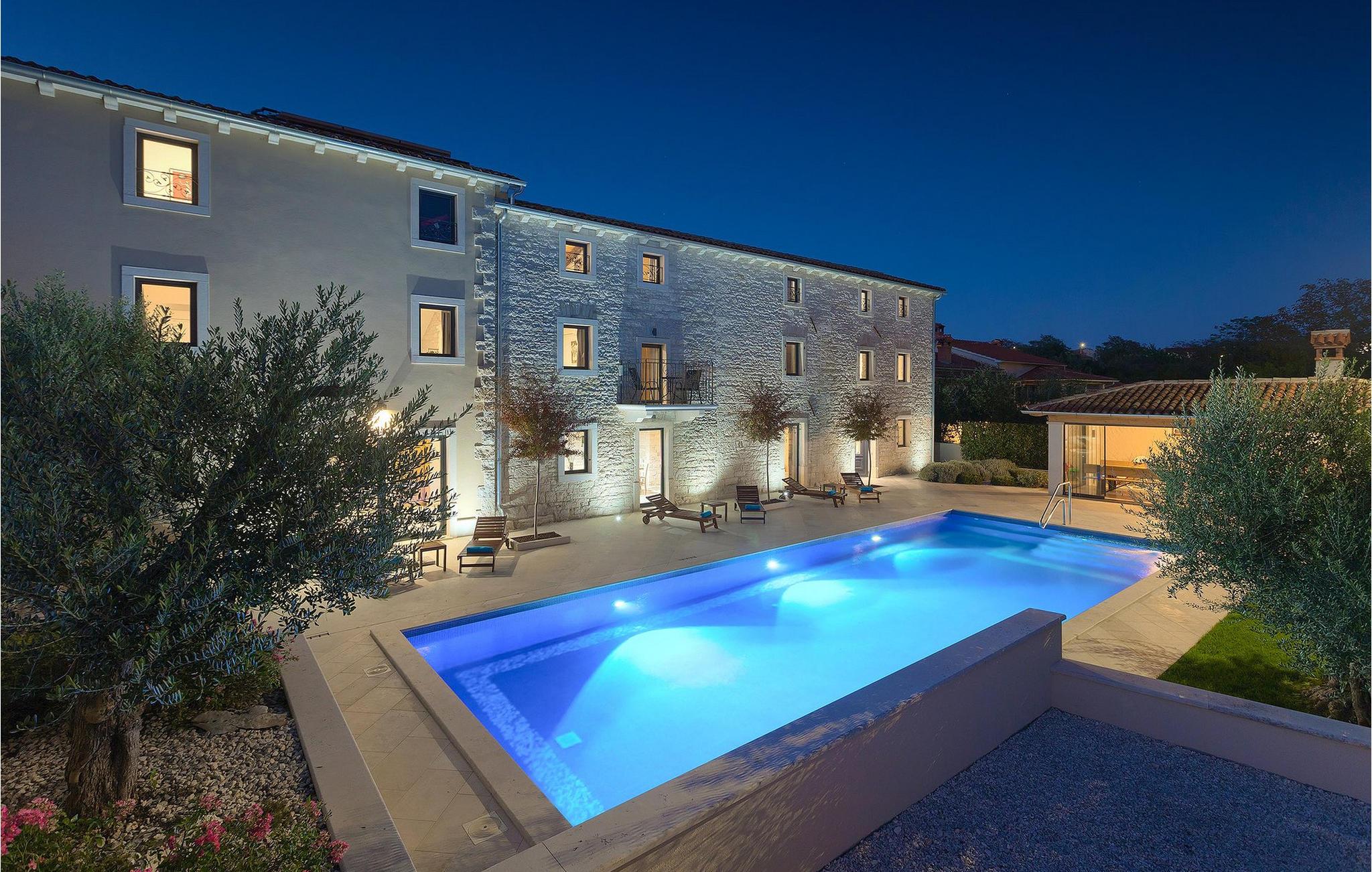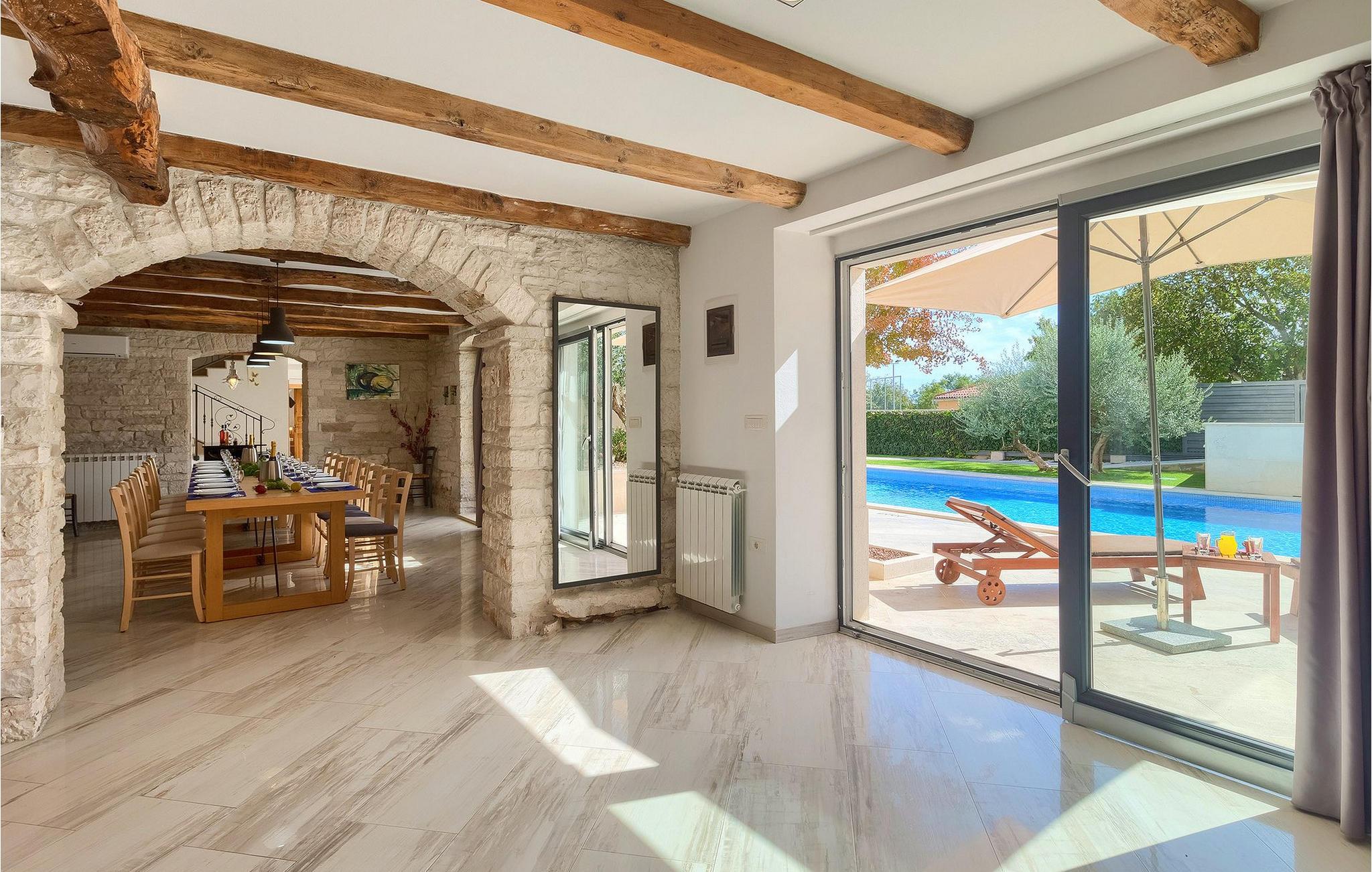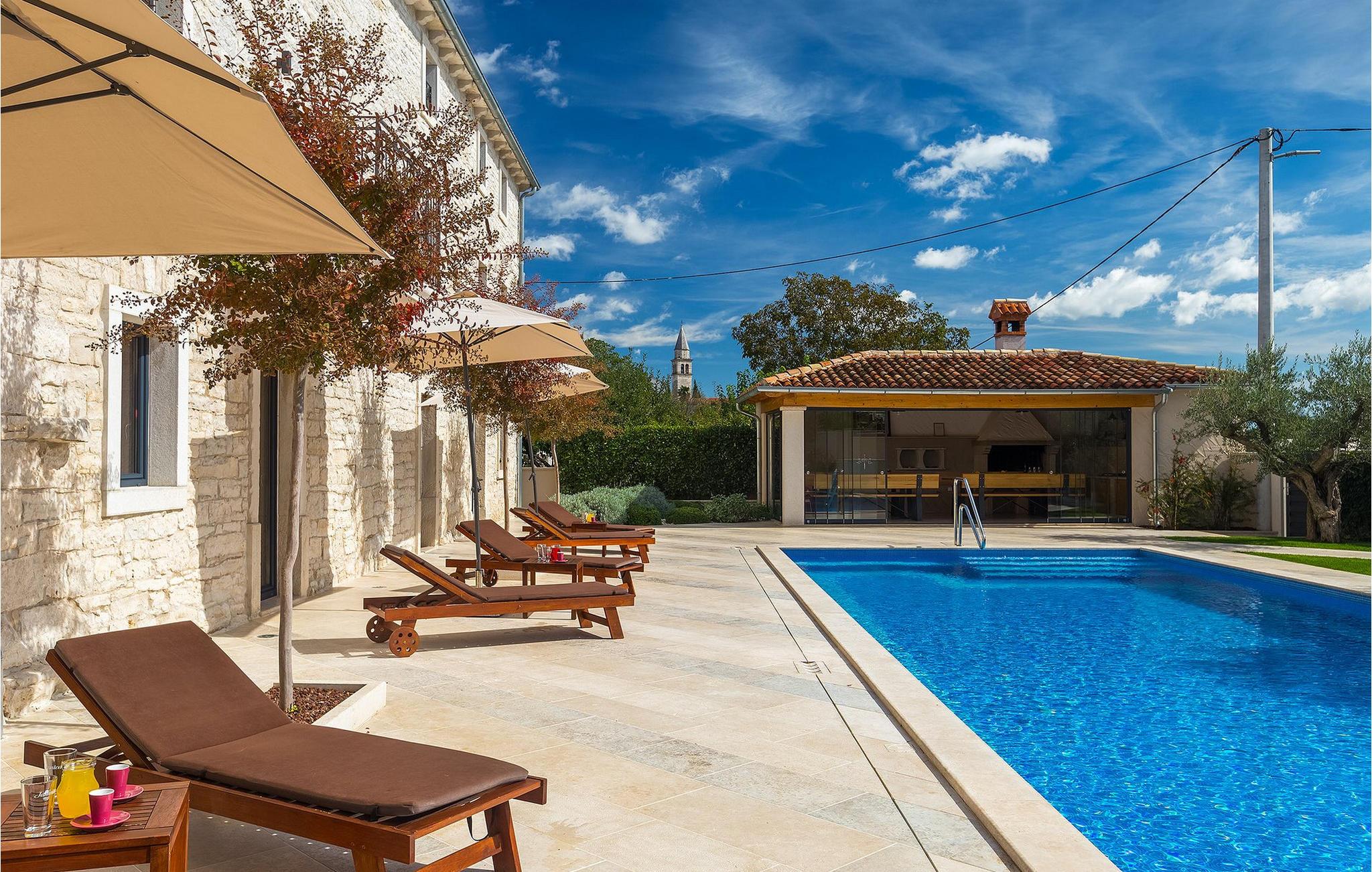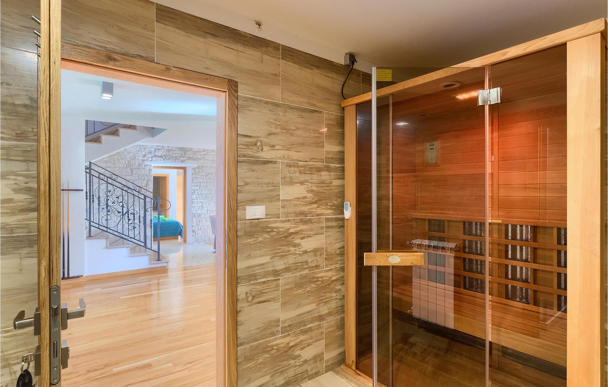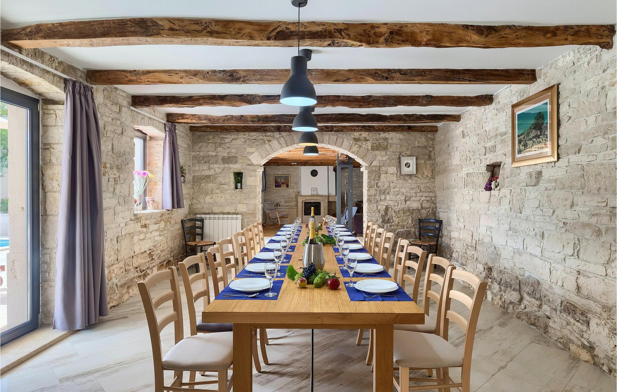 Luksuriøse Villa Simeanna ligger midt i det vakre istriske landskapet, bare en kort kjøretur fra Tinjan og Sveti Lovrec. Denne praktfulle eiendommen ble bygget i 1805 og totalrenovert i 2016. I dag har villaen totalt 9 soverom og plass til opptil 20 personer. På den ene siden gir de mange trebjelkene og de delvis åpne steinveggene villaen en landlig sjarm. På den andre siden har denne fantastiske villaen aircondition, fullt utstyrt kjøkken, 9 ensuite-bad og alt du trenger for en avslappende ferie. I første etasje er det et moderne kjøkken, en romslig stue med peis, et soverom med eget bad og et separat toalett. Ytterligere soverom ligger i første og andre etasje. Hvis du vil ha det gøy sammen med venner eller hele familien, finner du salongen med biljardbord og dart i første etasje. Skjem deg bort i badstuen eller nyt det innbydende private bassenget. De varme, solfylte dagene kan du tilbringe på terrassen, hvor du kan tilberede tradisjonelle kroatiske spesialiteter.Denne luksuriøse villaen ligger i det sentrale Istria, i den lille landsbyen Kringa, bare 5 kilometer sør for Tinjan. Sentrale Istria er ikke bare kjent for sitt uberørte landskap, bølgende åser, olivenåkre og tørre steinmurer, men også for sin utmerkede gastronomi. Nyt de tradisjonelle spesialitetene og prøv den verdensberømte istriske prosciuttoen og den lokale olivenoljen. Den rike kulturarven, den lange historien og de pittoreske landsbyene og byene gjør regionen enda vakrere. Det slående landskapet er ideelt for turentusiaster som ønsker å nyte en avslappende og fredelig ferie.