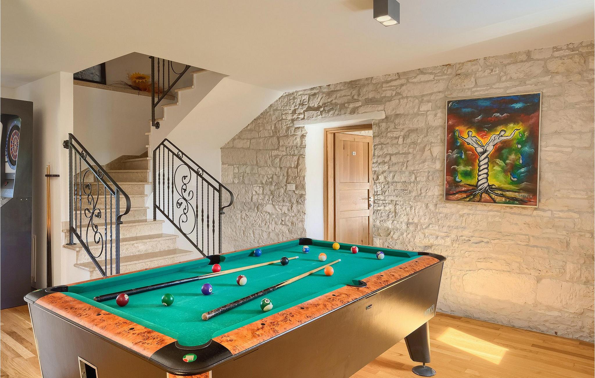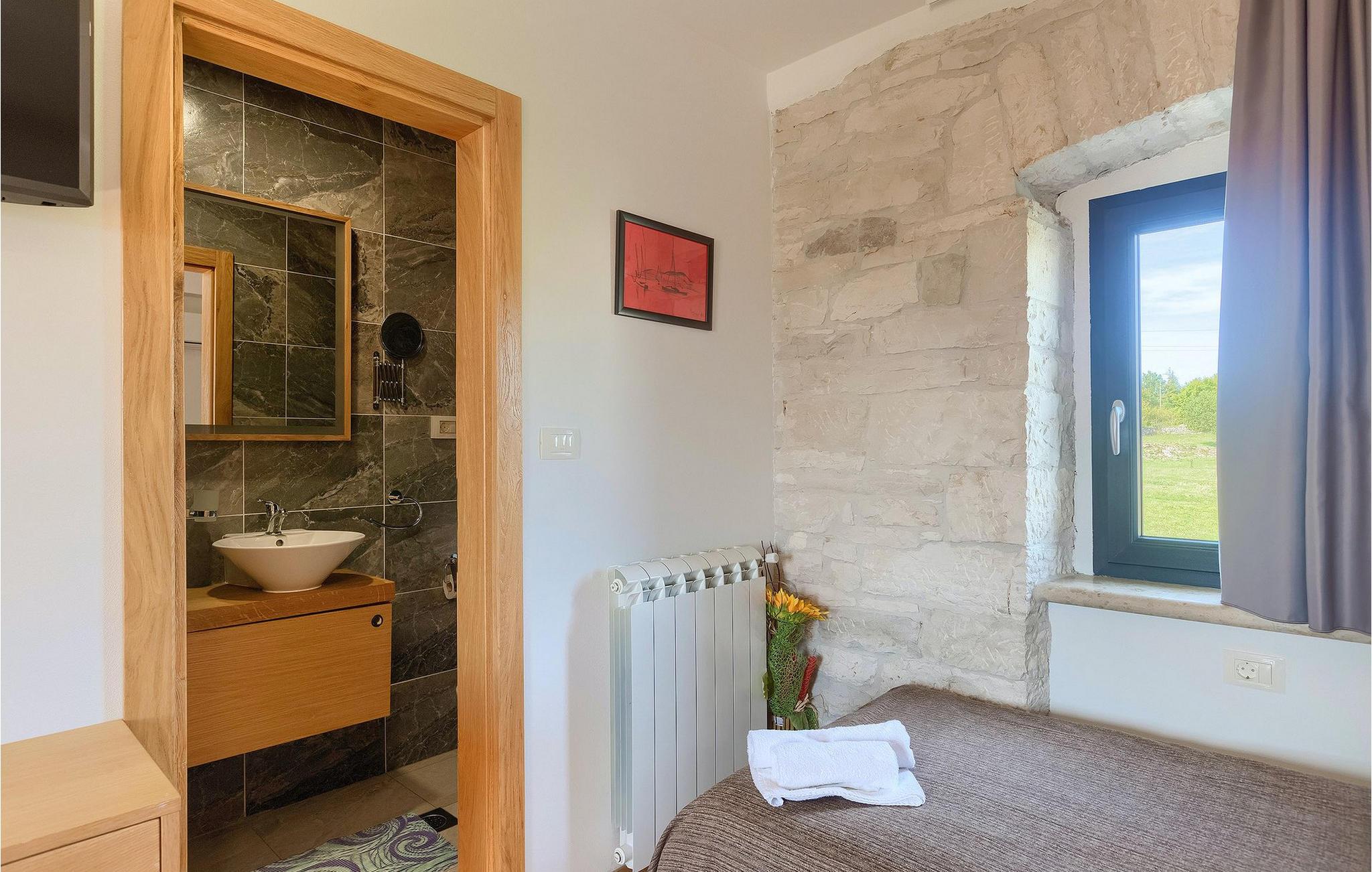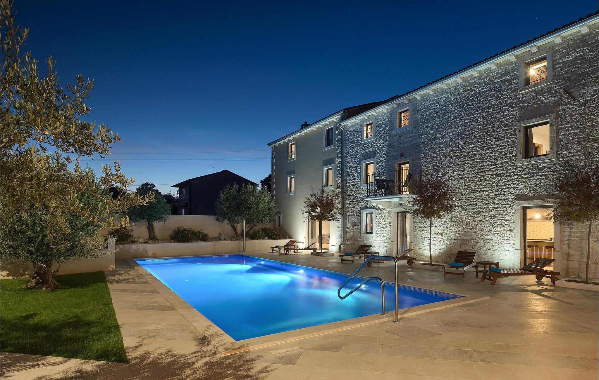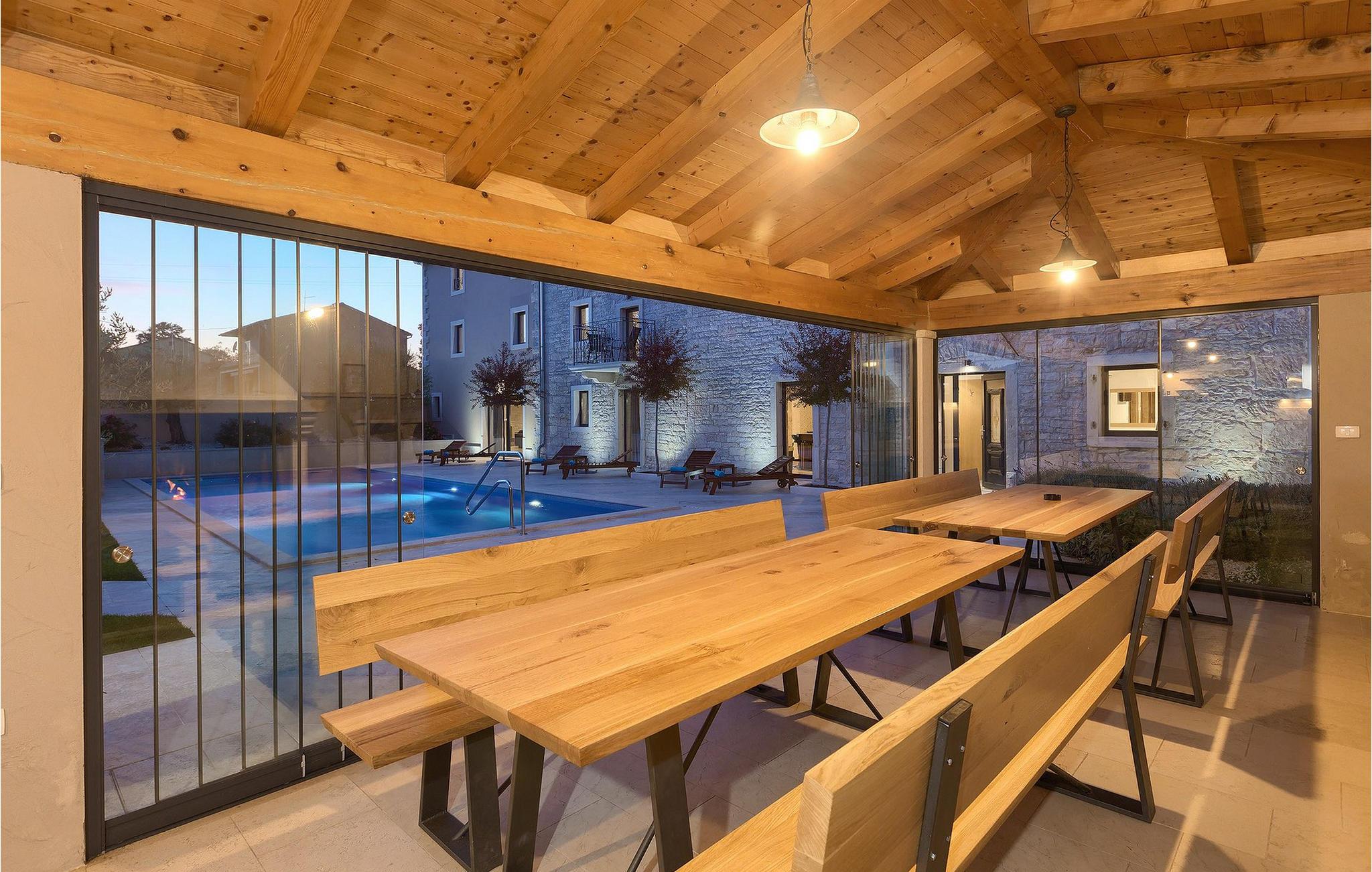 Luksuriøse Villa Simeanna ligger midt i det vakre istriske landskapet, bare en kort kjøretur fra Tinjan og Sveti Lovrec. Denne praktfulle eiendommen ble bygget i 1805 og totalrenovert i 2016. I dag har villaen totalt 9 soverom og plass til opptil 20 personer. På den ene siden gir de mange trebjelkene og de delvis åpne steinveggene villaen en landlig sjarm. På den andre siden har denne fantastiske villaen aircondition, fullt utstyrt kjøkken, 9 ensuite-bad og alt du trenger for en avslappende ferie. I første etasje er det et moderne kjøkken, en romslig stue med peis, et soverom med eget bad og et separat toalett. Ytterligere soverom ligger i første og andre etasje. Hvis du vil ha det gøy sammen med venner eller hele familien, finner du salongen med biljardbord og dart i første etasje. Skjem deg bort i badstuen eller nyt det innbydende private bassenget. De varme, solfylte dagene kan du tilbringe på terrassen, hvor du kan tilberede tradisjonelle kroatiske spesialiteter.Denne luksuriøse villaen ligger i det sentrale Istria, i den lille landsbyen Kringa, bare 5 kilometer sør for Tinjan. Sentrale Istria er ikke bare kjent for sitt uberørte landskap, bølgende åser, olivenåkre og tørre steinmurer, men også for sin utmerkede gastronomi. Nyt de tradisjonelle spesialitetene og prøv den verdensberømte istriske prosciuttoen og den lokale olivenoljen. Den rike kulturarven, den lange historien og de pittoreske landsbyene og byene gjør regionen enda vakrere. Det slående landskapet er ideelt for turentusiaster som ønsker å nyte en avslappende og fredelig ferie.