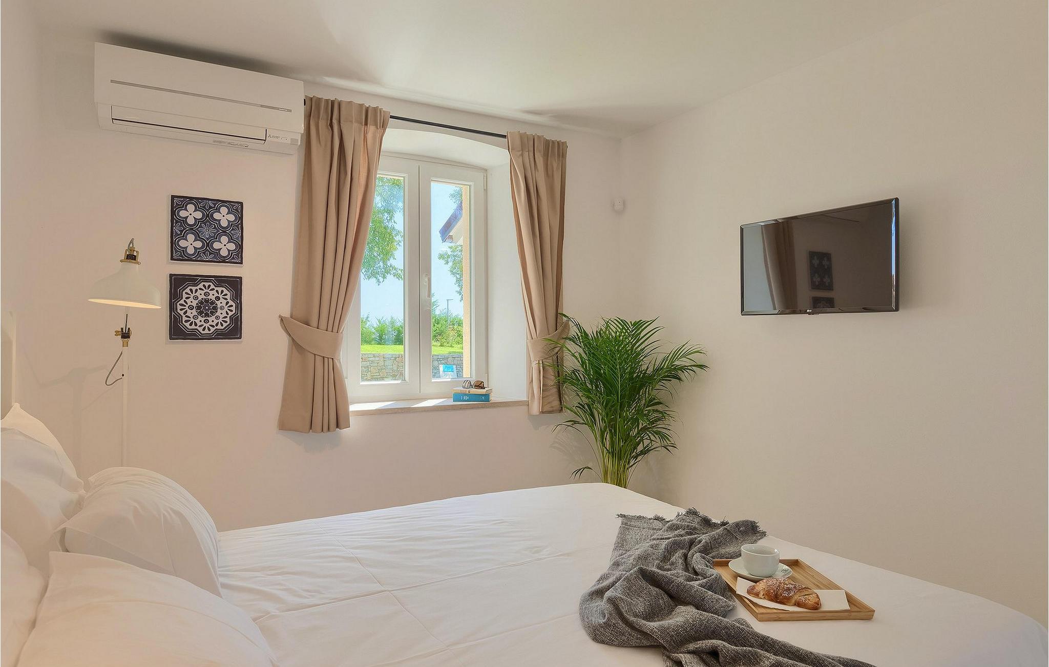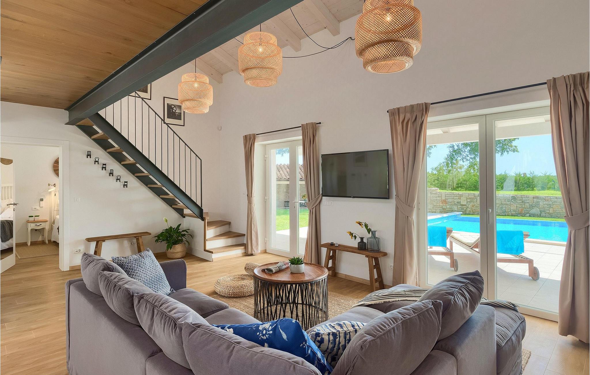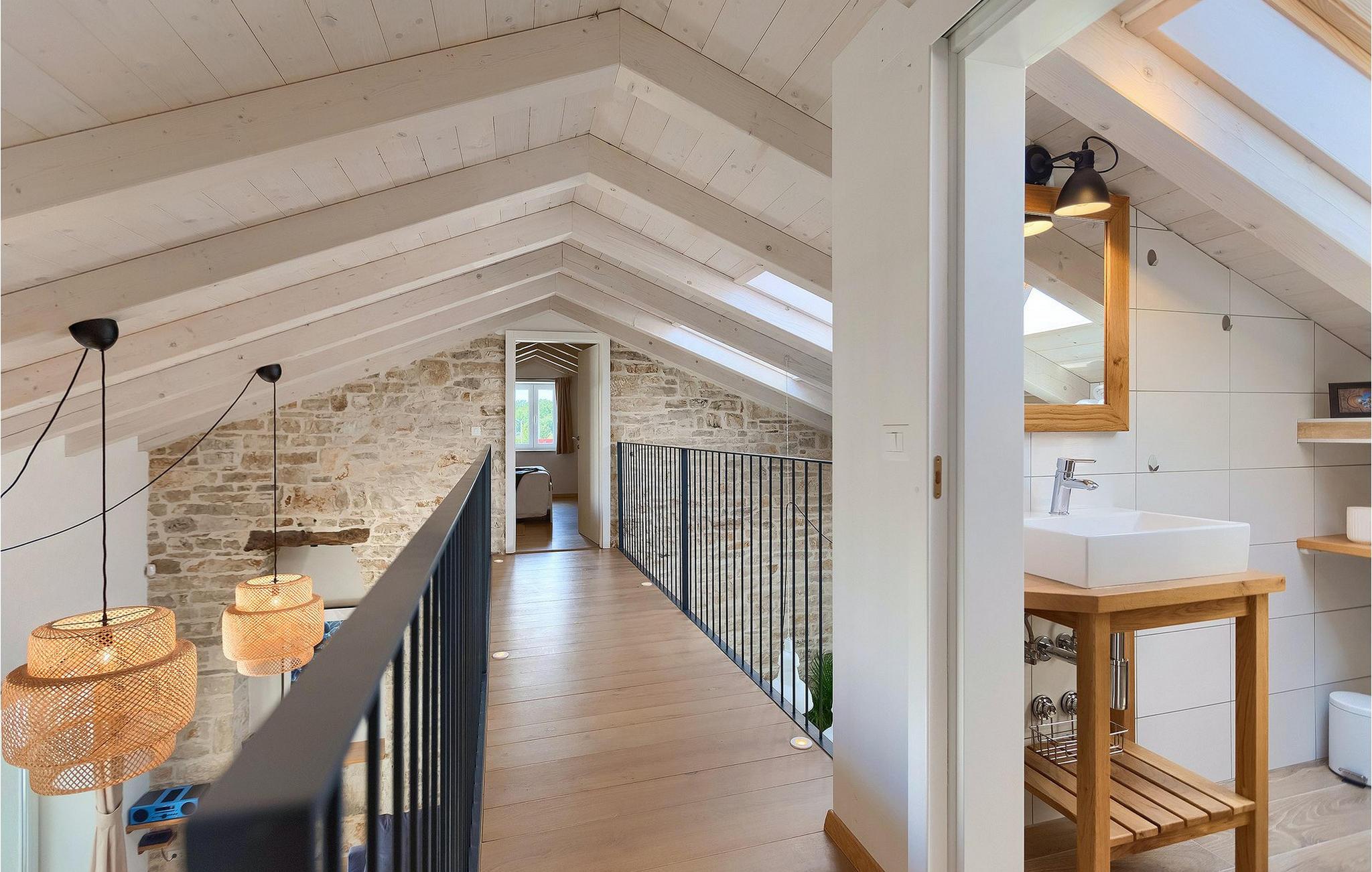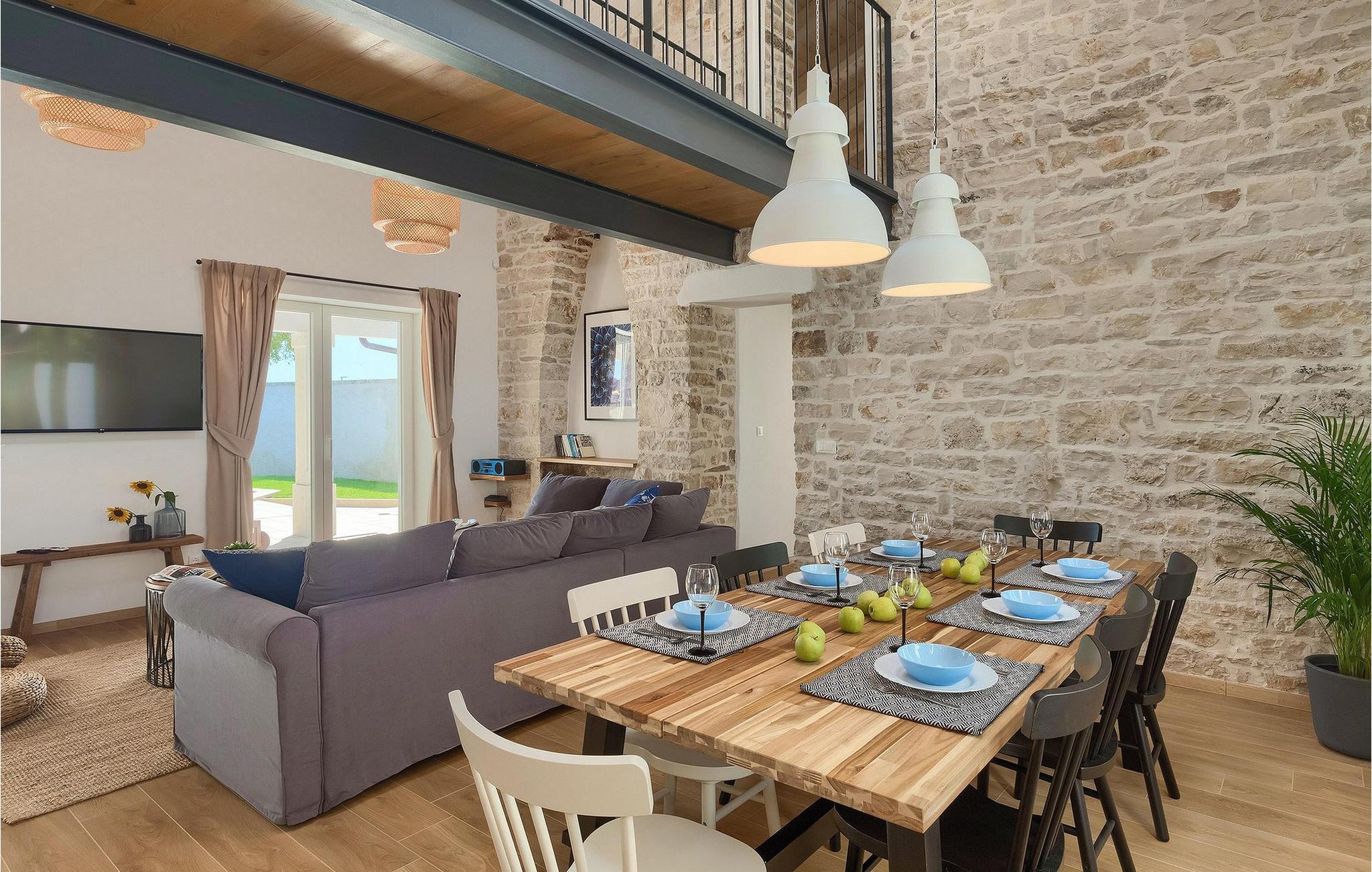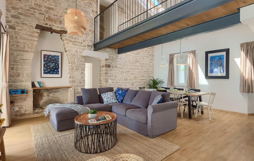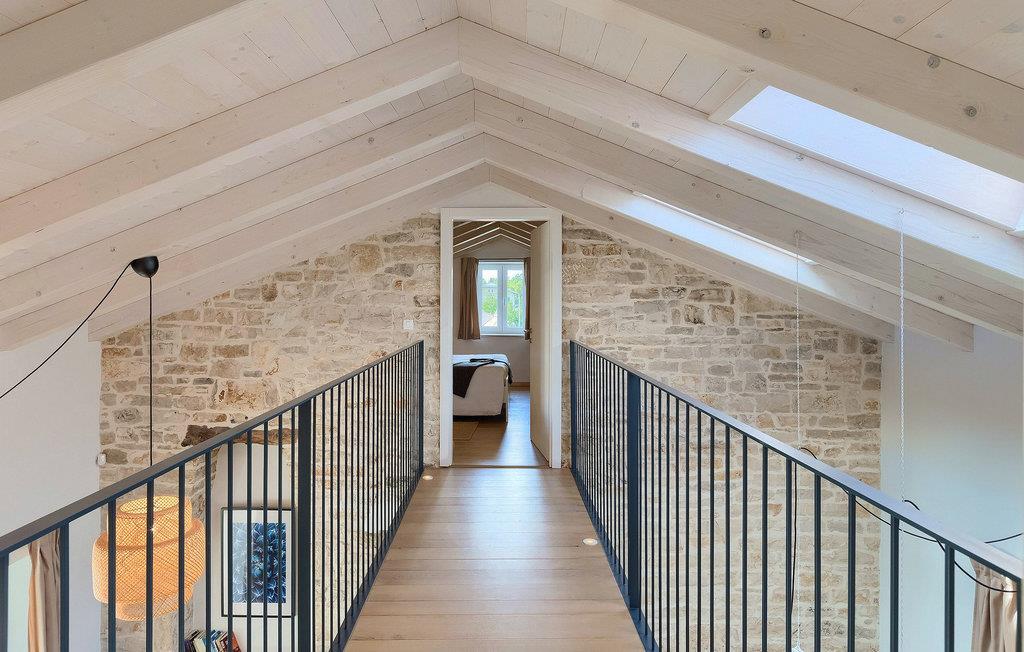 Denne villaen er et vakkert restaurert steinhus fra Istria med alle nødvendige moderne bekvemmeligheter og en fantastisk bevart tradisjonell sjarm. Villaen tilbyr overnatting for maksimalt 8 + 2 gjester i de 4 smakfullt innredede dobbeltrommene. I første etasje ligger to dobbeltrom med eget bad, en kreativ, moderne, åpen stue- og spisestue med direkte utgang til bassenget, et fullt utstyrt kjøkken og et gjestetoalett. Den åpne stuen har stor takhøyde med takvinduer, noe som gjør rommet spesielt lyst og gjennomstrømmet av lys. Trappen fører deg til den sjarmerende hemsen, som består av de resterende 2 soverommene (1 med en ekstra sovesofa for 2 personer) og et felles bad. En bro, som ligger over oppholdsrommet, forbinder de to soverommene i øverste etasje.