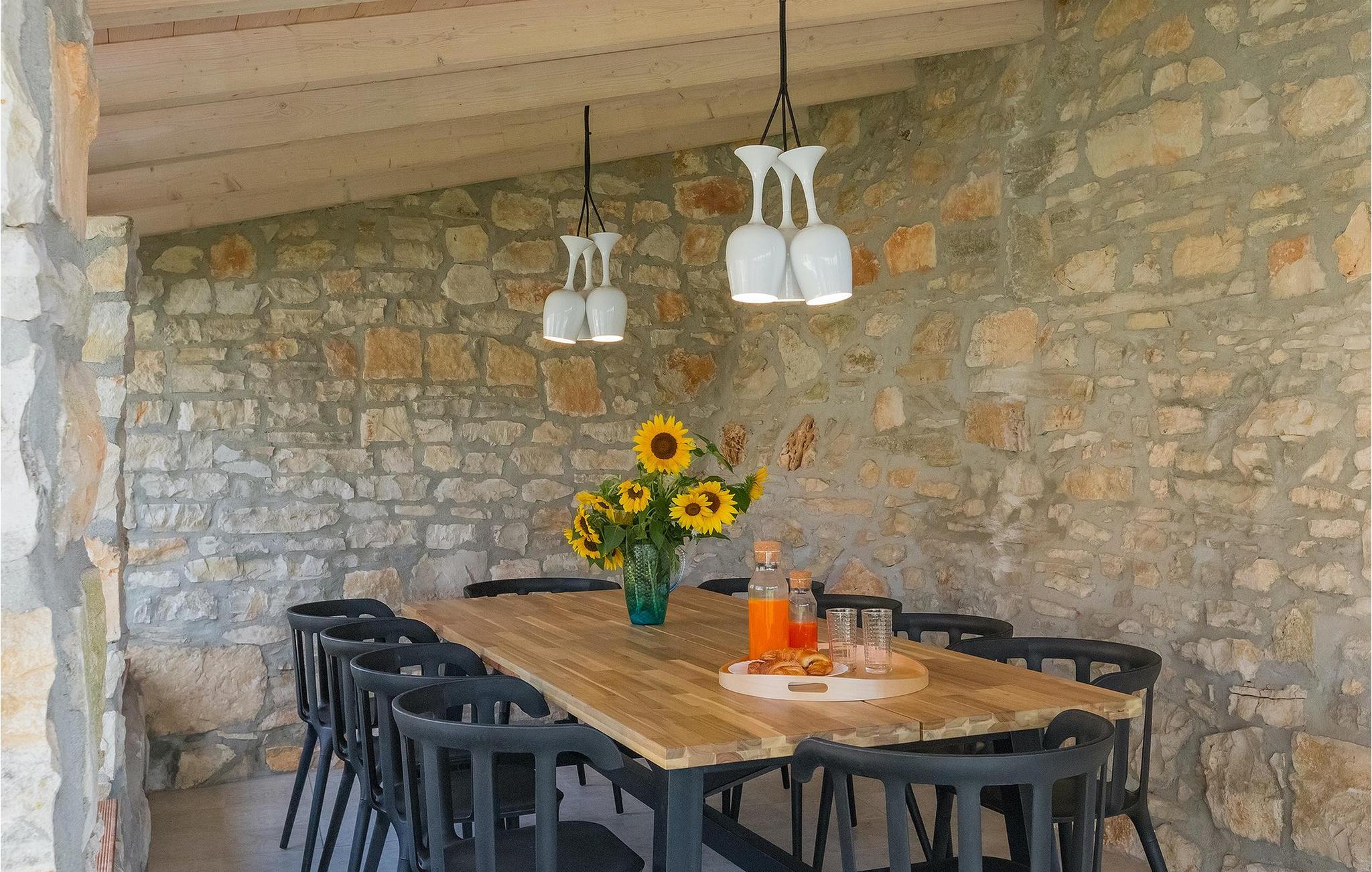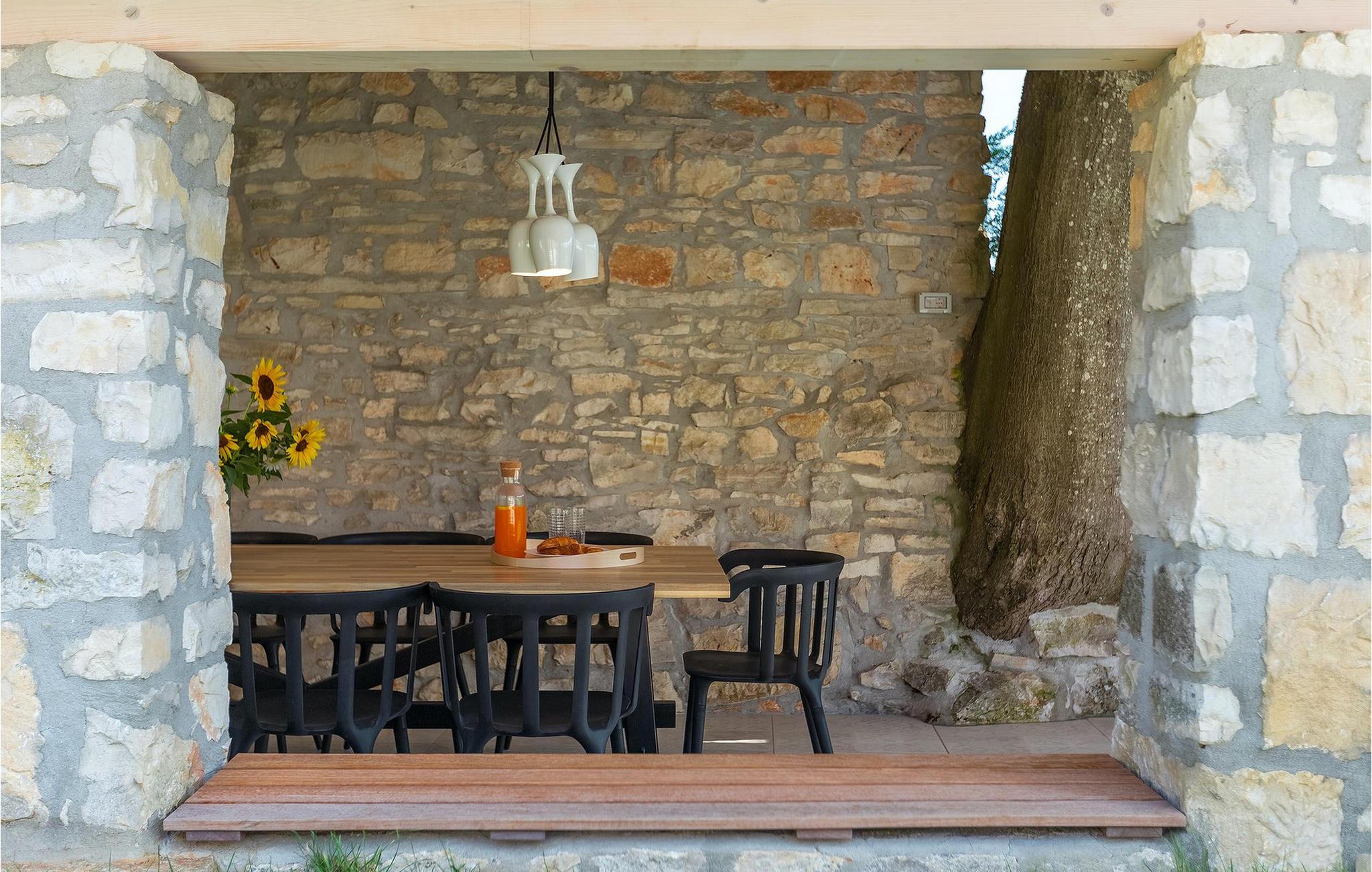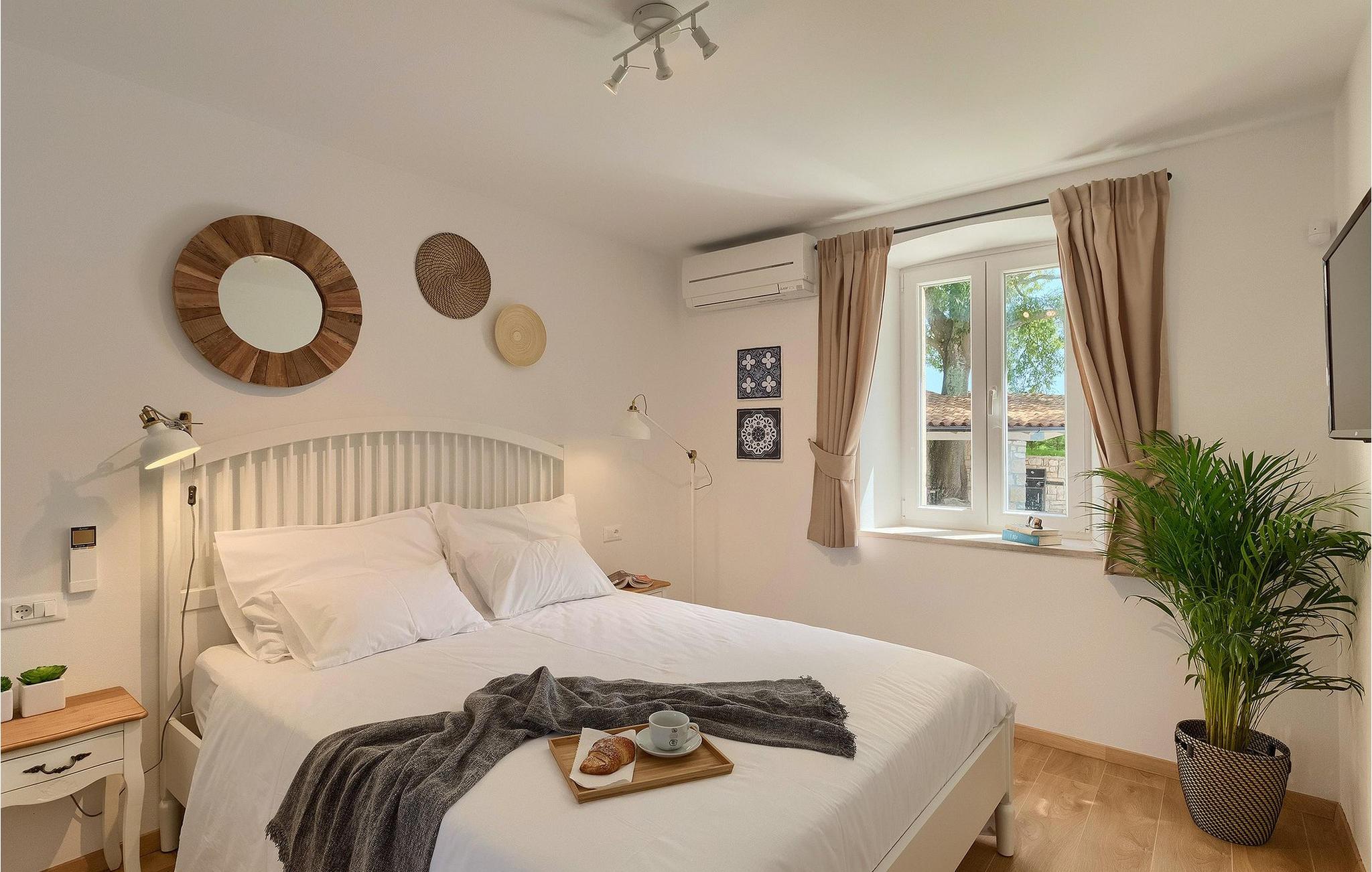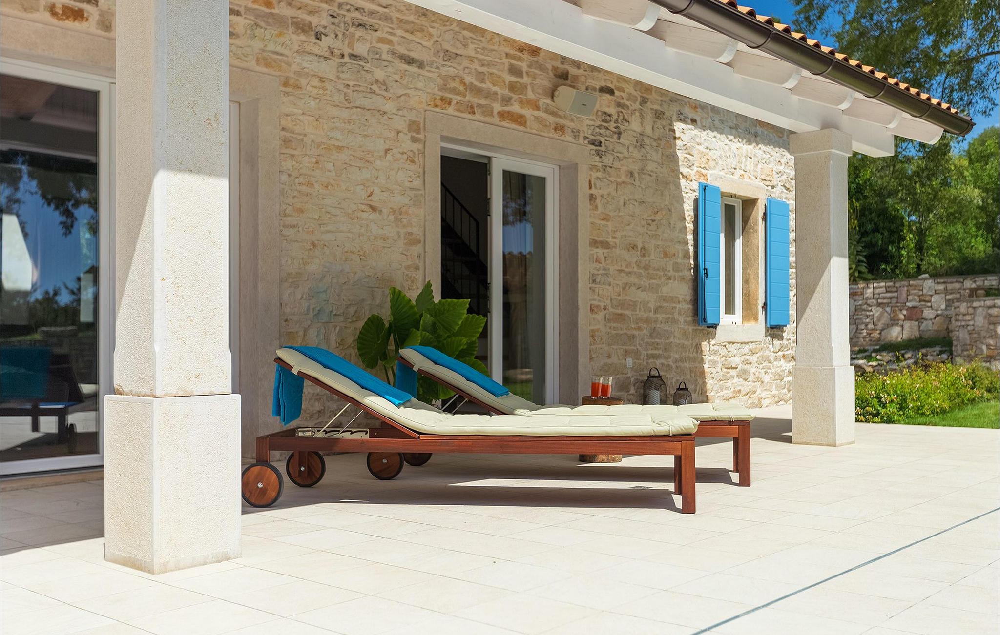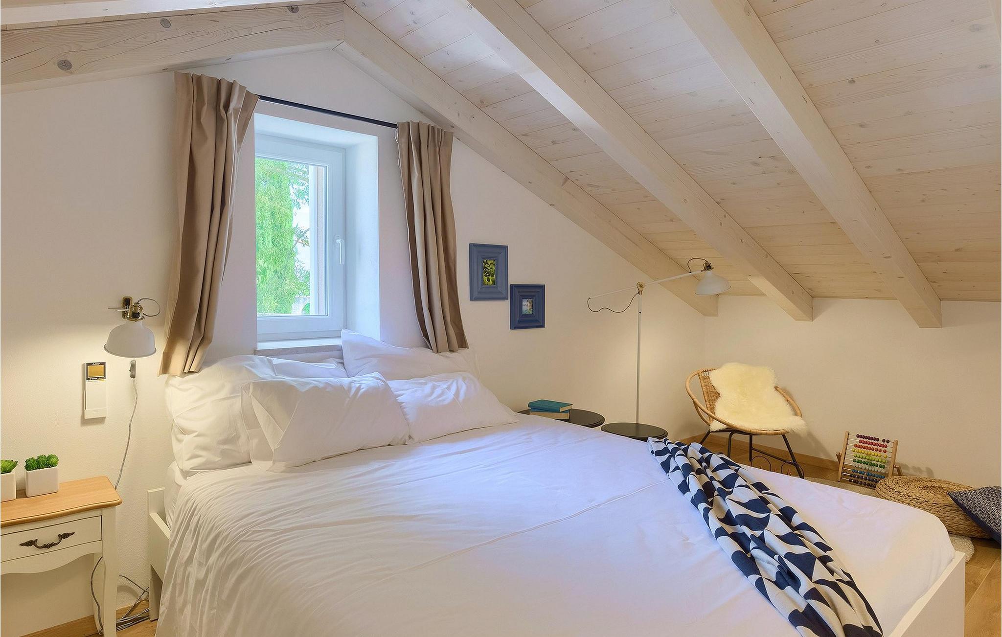 Denne villaen er et vakkert restaurert steinhus fra Istria med alle nødvendige moderne bekvemmeligheter og en fantastisk bevart tradisjonell sjarm. Villaen tilbyr overnatting for maksimalt 8 + 2 gjester i de 4 smakfullt innredede dobbeltrommene. I første etasje ligger to dobbeltrom med eget bad, en kreativ, moderne, åpen stue- og spisestue med direkte utgang til bassenget, et fullt utstyrt kjøkken og et gjestetoalett. Den åpne stuen har stor takhøyde med takvinduer, noe som gjør rommet spesielt lyst og gjennomstrømmet av lys. Trappen fører deg til den sjarmerende hemsen, som består av de resterende 2 soverommene (1 med en ekstra sovesofa for 2 personer) og et felles bad. En bro, som ligger over oppholdsrommet, forbinder de to soverommene i øverste etasje.