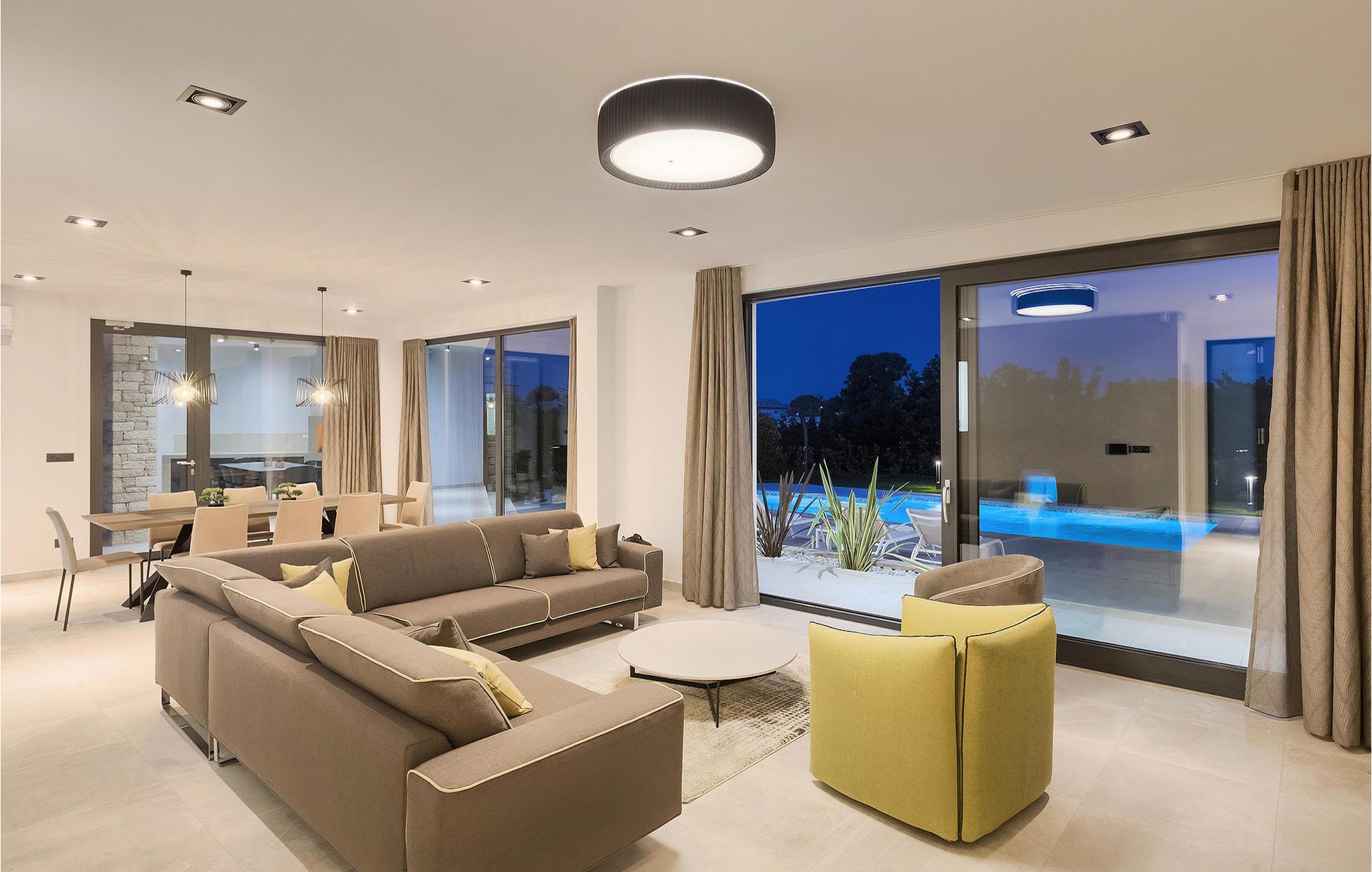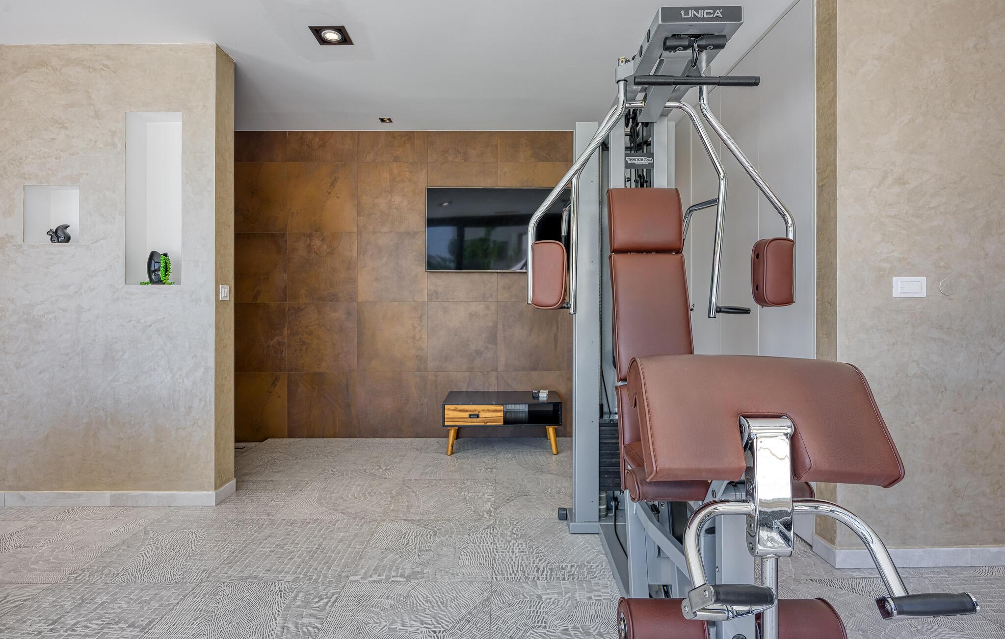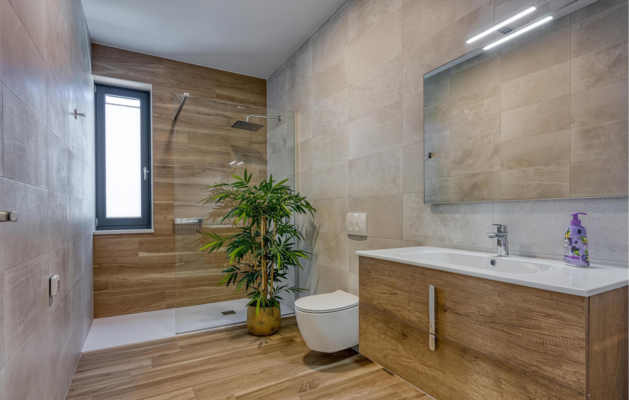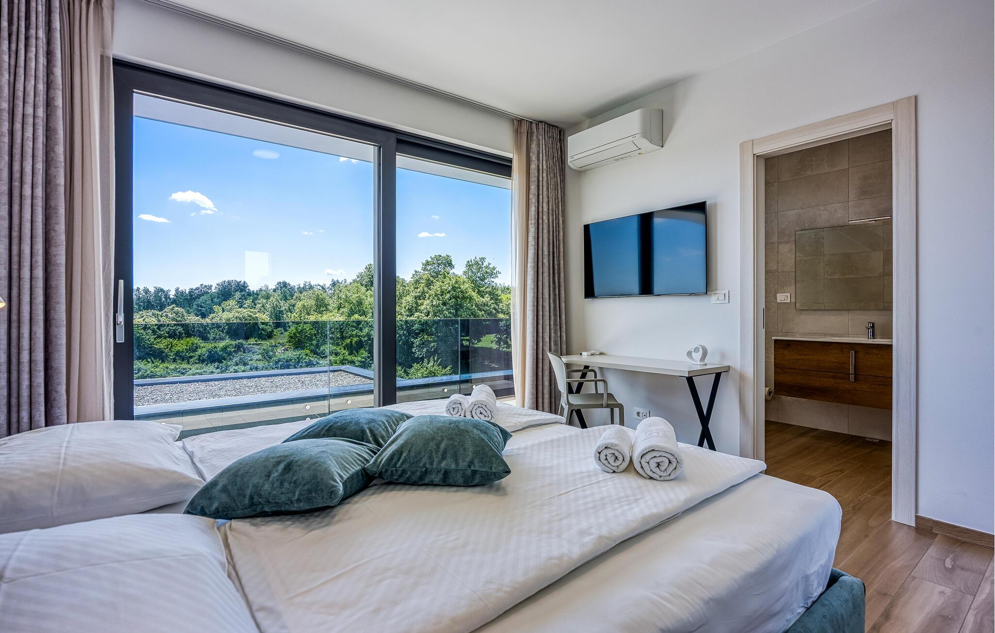Innvendig er villaen ikke mindre imponerende, og vi begynner med velværeavdelingen med innendørs boblebad med utsikt over bassengområdet. I første etasje er det en koselig og romslig stue og et fullt utstyrt kjøkken med spiseplass for hele gruppen. Takket være de store vinduene er alle rommene lyse og gjennomstrømmet av lys. I første etasje finner du også ett av soverommene med king-size-seng og eget bad. De resterende tre soverommene, alle med eget bad, ligger i første etasje. Totalt har villaen plass til opptil 8 personer, noe som gjør den ideell for to familier. Når du befinner deg i toppetasjen, vil utsikten over omgivelsene ta pusten fra deg - å nyte utsikten er virkelig et must!
