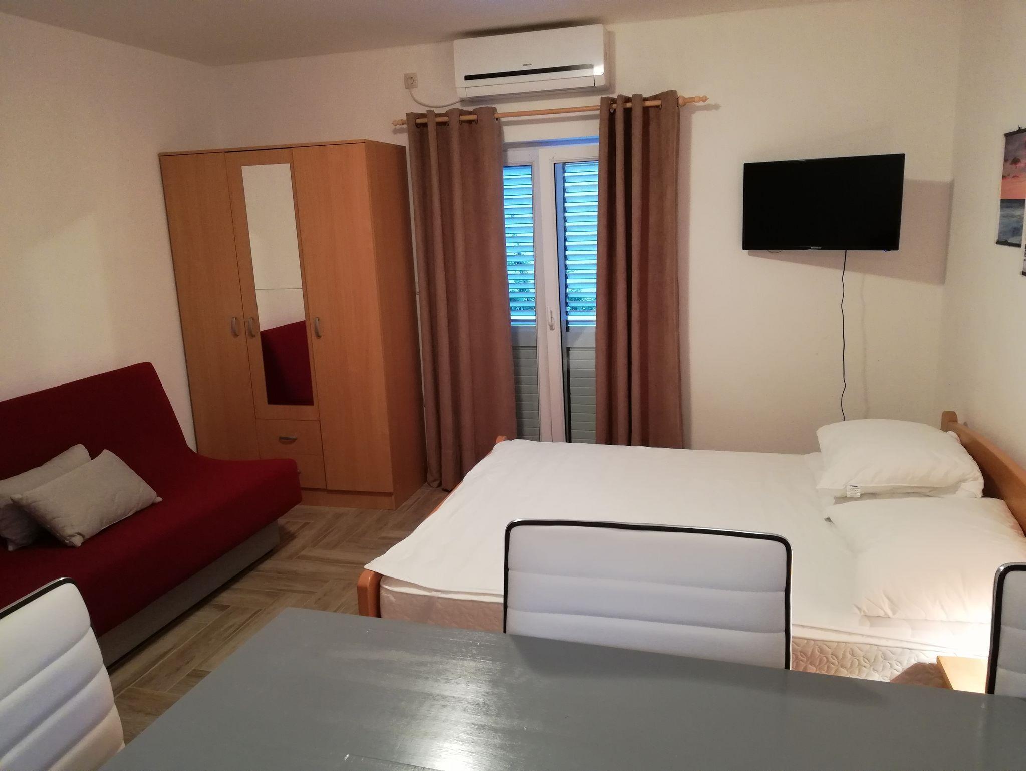 Studio bietet Platz für 3 Gäste. Die Betten sind in Schlafzimmern, die es 1 gibt, innerhalb einer Gesamtfläche von 26m2, angeordnet. Die Gäste haben eine eigene Terrasse zur Verfügung, auf der sie in warmen Sommernächten genießen können. Das Studio-Apartment bietet Meerblick. Es ist erlaubt, Speisen auf dem Gemeinschafts-Grill vorzubereiten. IM PREIS INBEGRIFFEN: Kurtaxe, Endreinigung, Klimatisierung, Parkplatz, Internet, tragbarer Grill. VERBINDLICHE ZUSÄTZLICHE KOSTEN: Aufzahlung für Kurzaufenthalte (prozentualer Zuschlag pro Nächtigungsanzahl: 30% - 1, 20% - 2, 10% - 3). Die Verfügbarkeit zusätzlicher Dienstleistungen in Ihrem reservierten Termin und die Preise derselben (falls nicht aufgeführt) müssen im Voraus überprüft werden. Zusätzliche Dienstleistungen die in der Zahlungsaufforderung nicht aufgeführt sind werden direkt beim Vermieter bezahlt, angenommen der Gast nutzt auch diese. Ermäßigung auf den Grundpreis: Gratistag 14=13 (bei einem Aufenthalt von 14 Tagen oder mehr erhalten Sie einen Gratistag für den Aufenthalt bis 31.12.26).