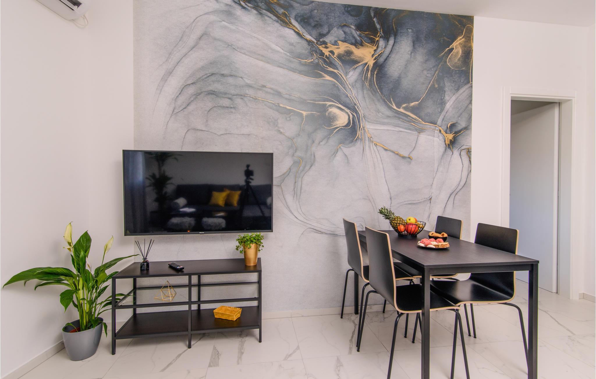 En svært moderne og romslig ferieleilighet i Katel Gomilica, som tilbyr deg en åpen planløsning, slik at boarealet består av en kjøkkenøy og -hjørne, stue og spisestue. Her er det to soverom og et felles bad.