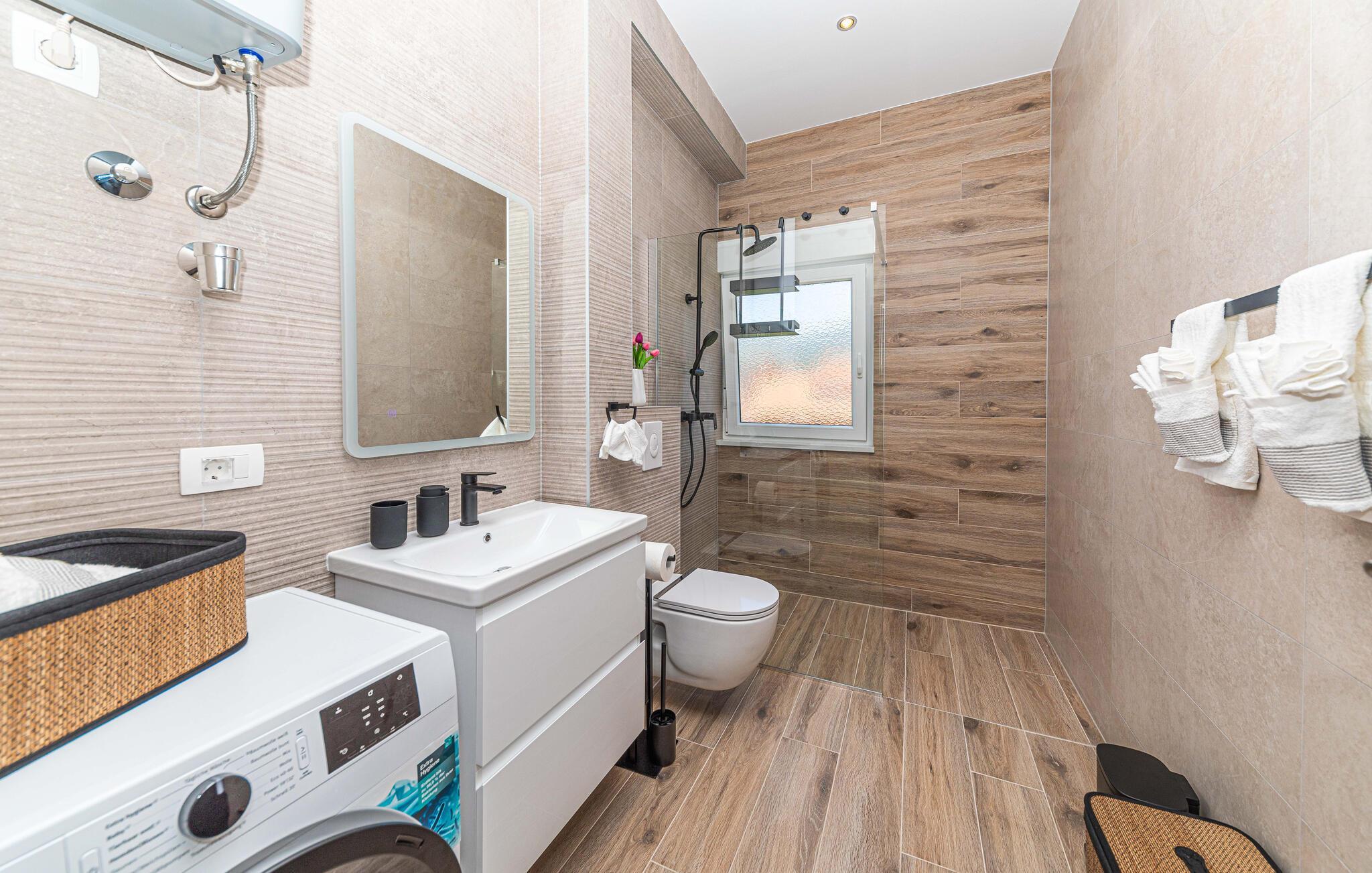 Velkommen til denne vakre ferieleiligheten i Kastel Novi, i nærheten av Trogir. Det smakfullt innredede interiøret gir deg en koselig atmosfære med moderne bekvemmeligheter. Den åpne stue- og spisestuen innbyr til hyggelig samvær, mens det velutstyrte kjøkkenet skaper ideelle forhold for felles måltider.