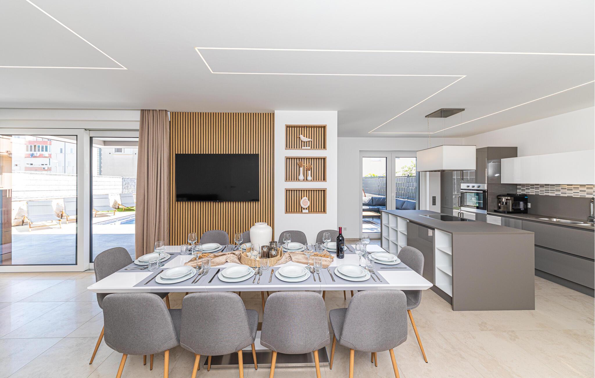 Dette romslige feriehuset i Kastel Stafilic lover en uforglemmelig ferieopplevelse. Det er moderne og stilfullt innredet, og tilbyr alt du kan ønske deg. Den åpne stuen utstråler en innbydende atmosfære, perfekt for avslappende kvelder med familie eller venner. Nyt bassenget med den boblende vannfontenen, og slapp av på terrassen med utsikt over det som skjer i vannet. Barna kan boltre seg på lekeapparatene i hagen, mens grillplassen innbyr til matlaging og samvær. Det er også en annen balkong for rolige stunder.