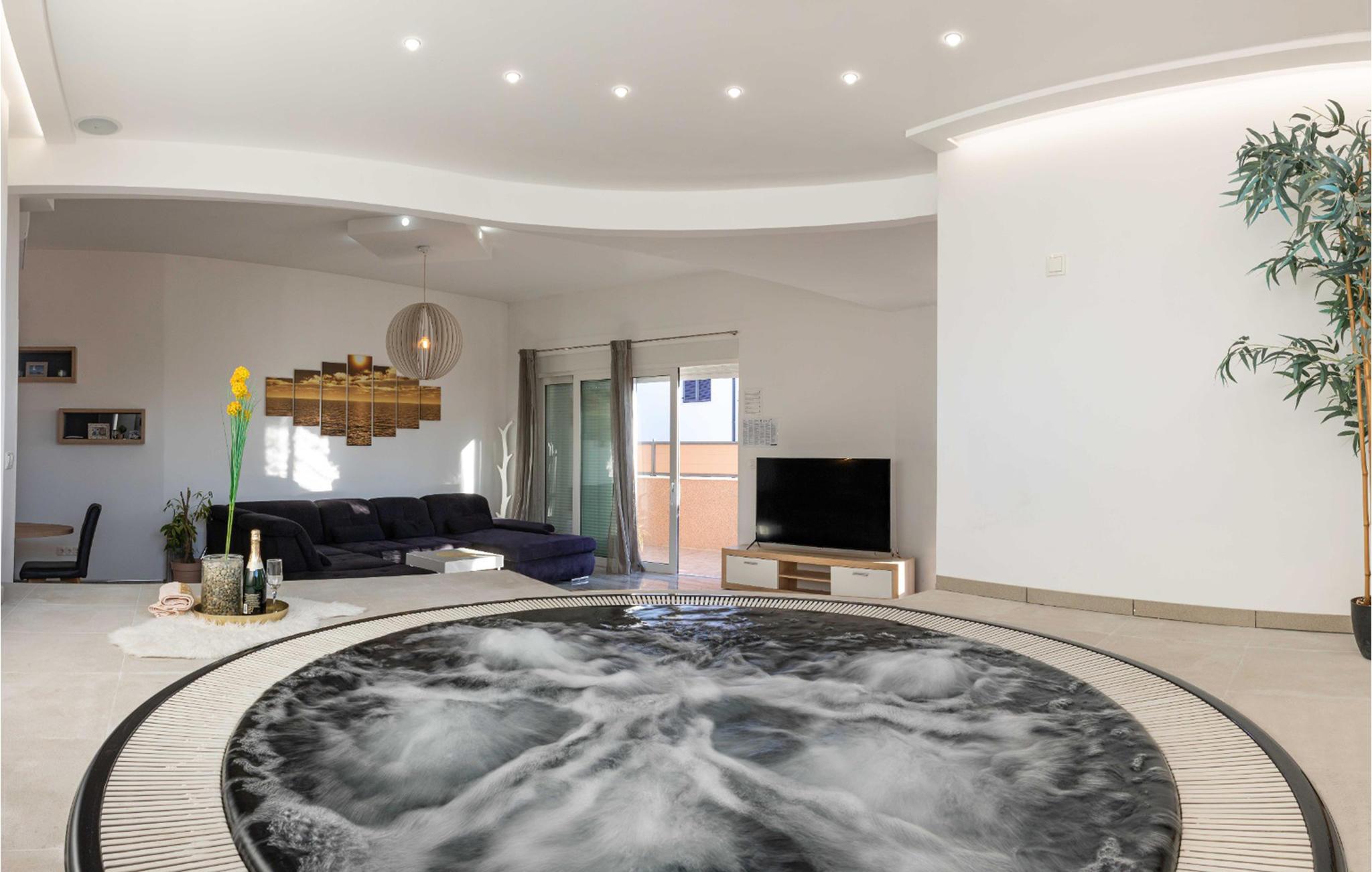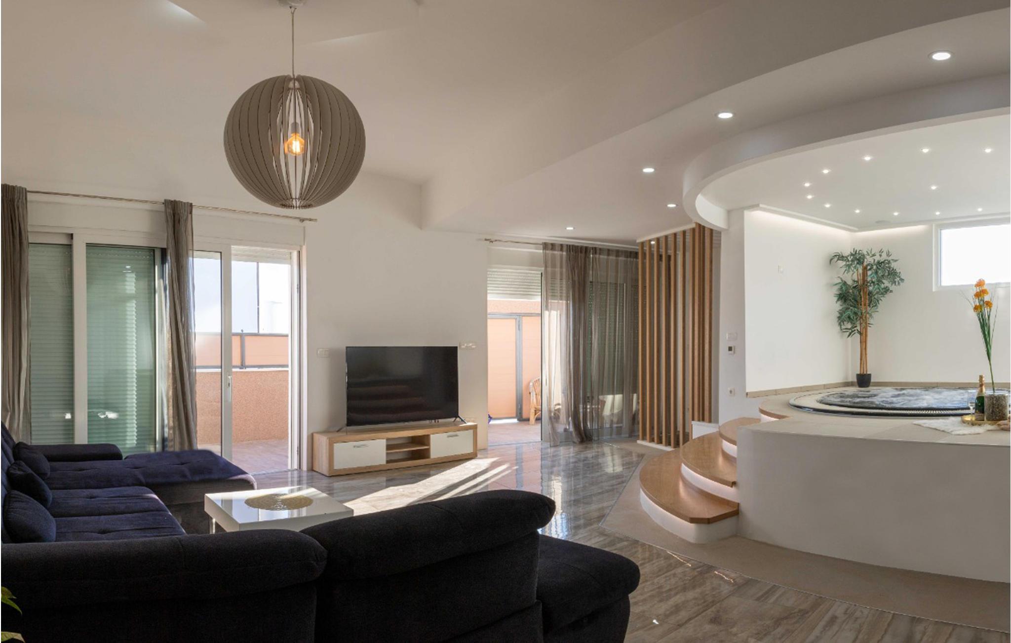 Denne moderne tomannsboligen med terrasse og boblebad ligger i Okrug Gornji, på øya Iovo, og tilbyr de ideelle omgivelsene for en uforglemmelig ferie.