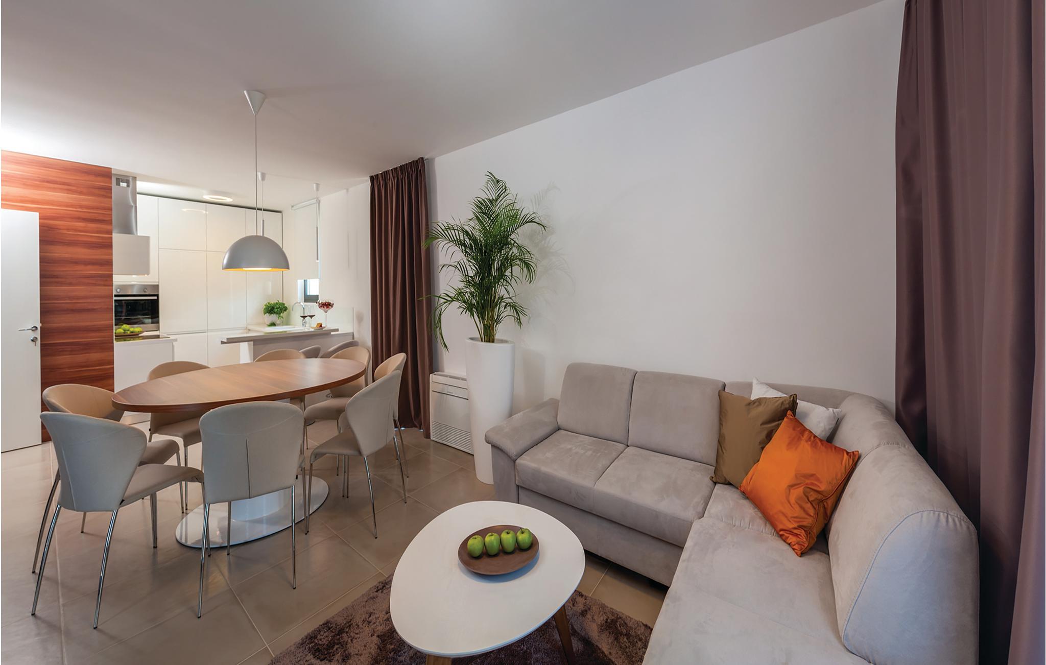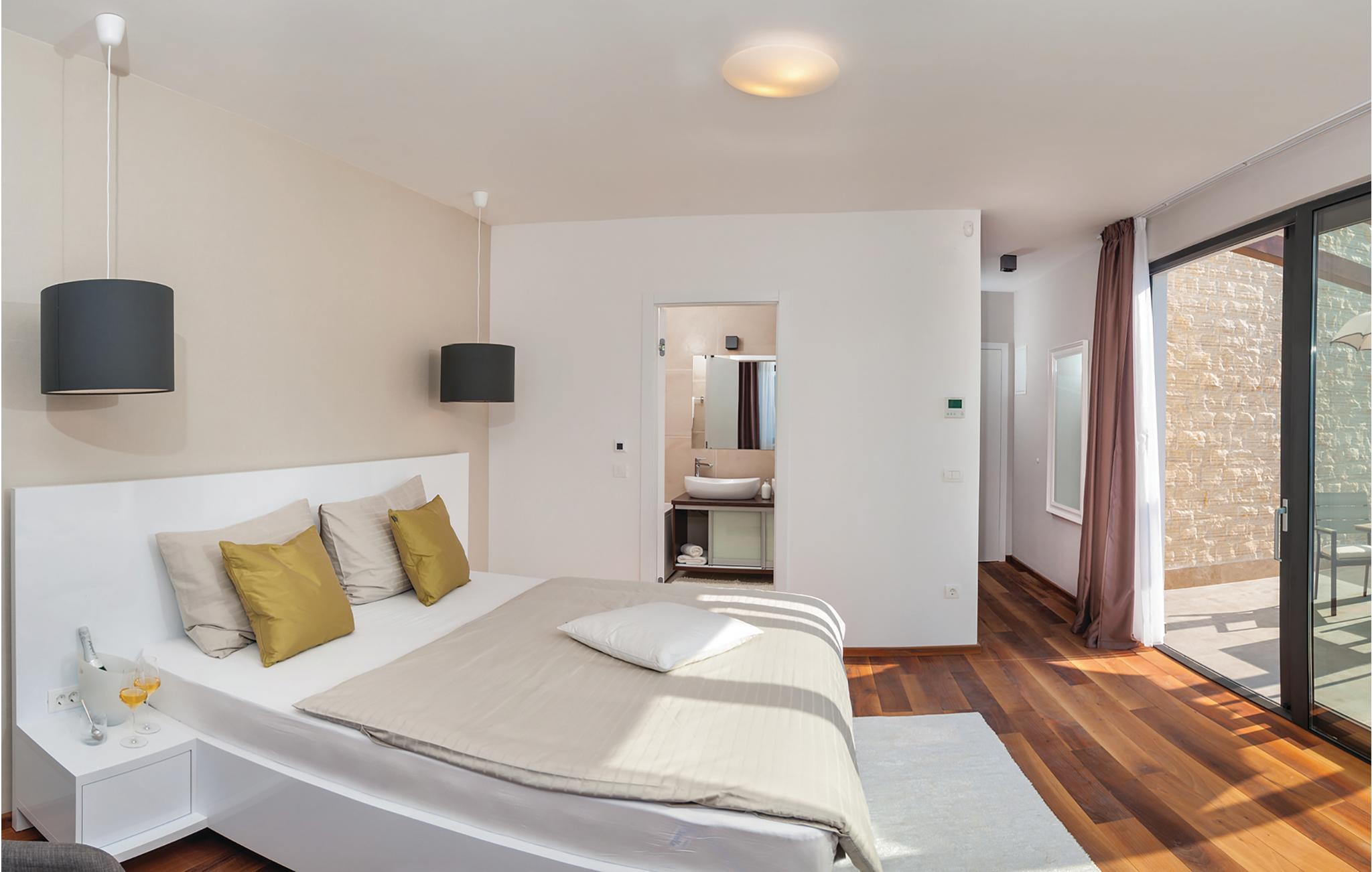 Din eksklusive villa i Okrug Gornji tilbyr deg den ideelle kombinasjonen av eleganse, komfort og avslapning. I første etasje venter et privat velværeområde med innendørsbasseng, badstue og treningsrom. I villaens øverste etasje finner du den smakfullt møblerte stuen. Med sin åpne, lyse arkitektur og moderne designelementer skaper denne innkvarteringen en luksuriøs atmosfære. Kjøkkenet har alt du trenger for kulinariske opplevelser, og spiseplassen innbyr til hyggelige måltider med familie eller venner.