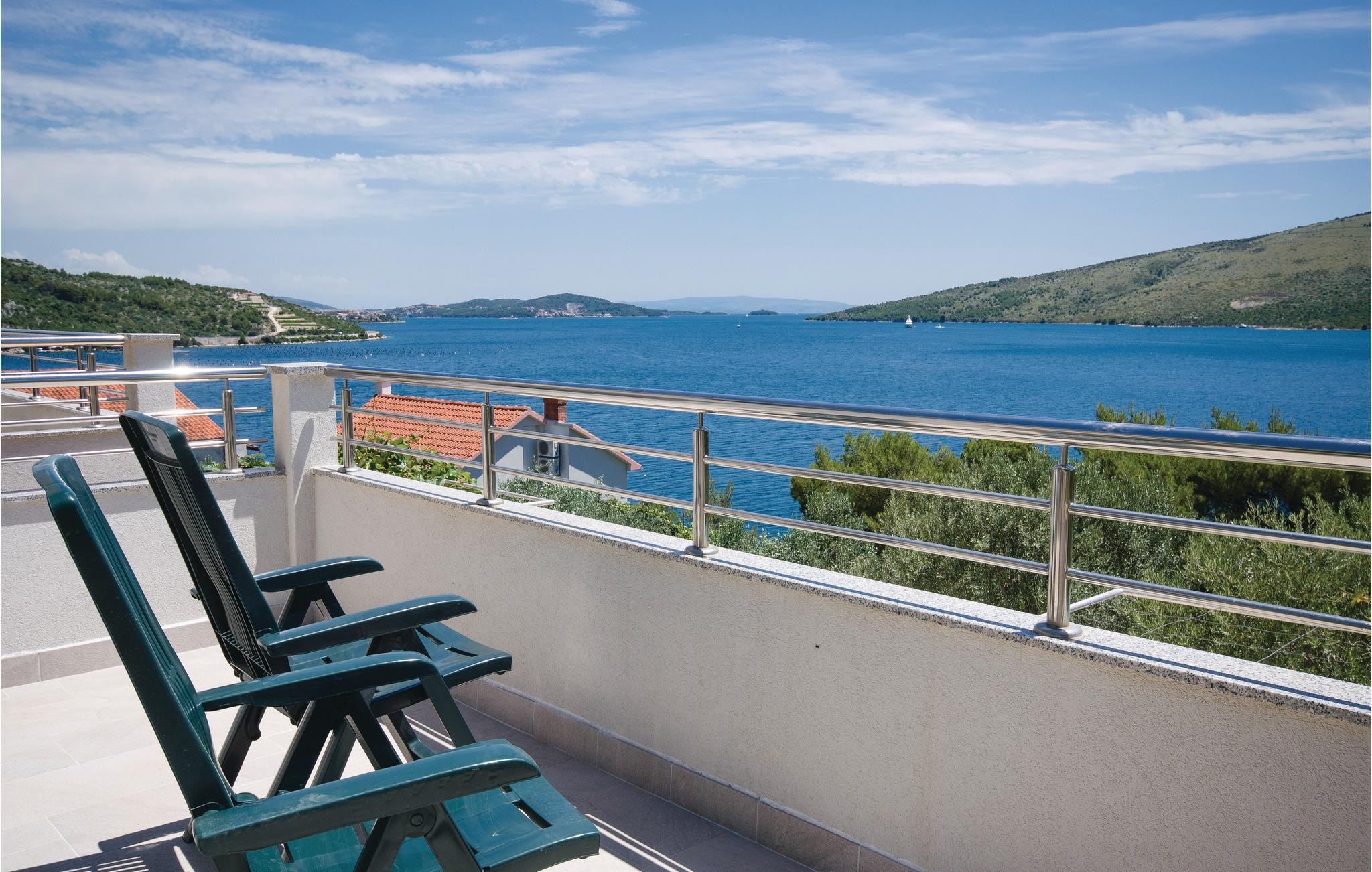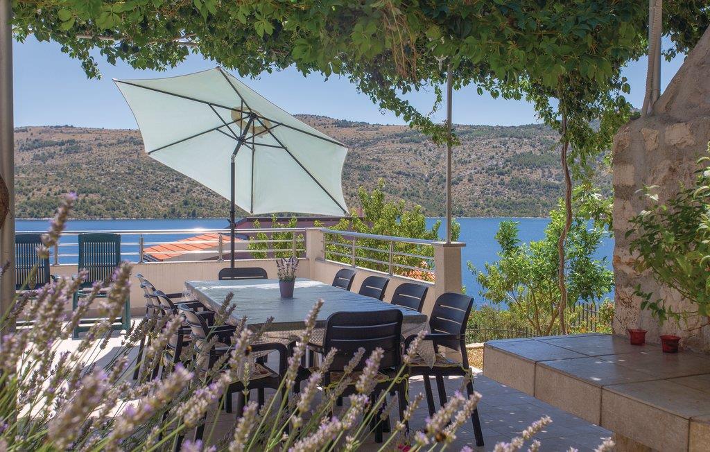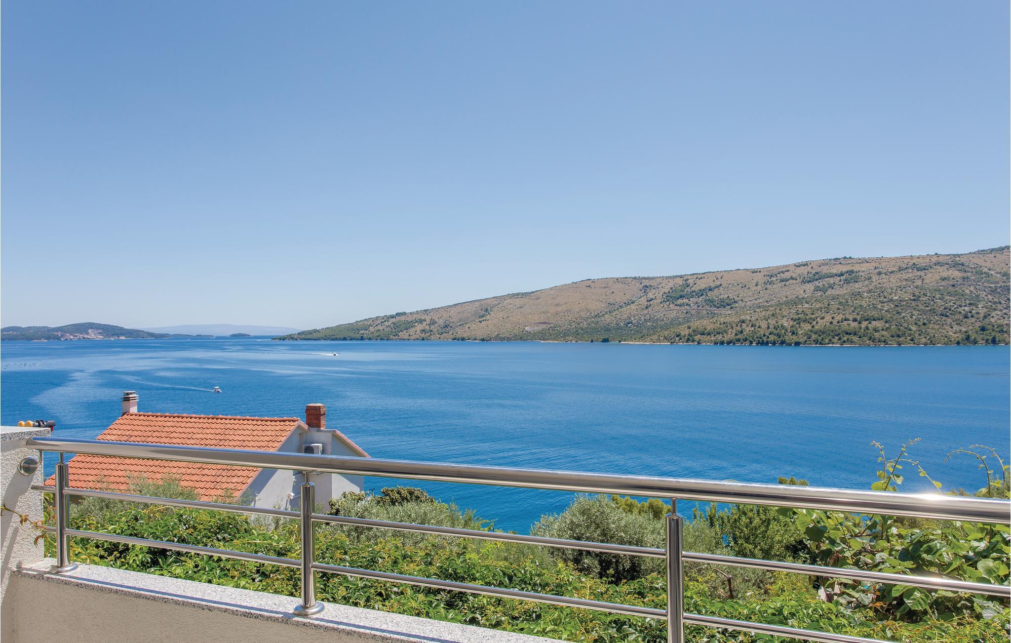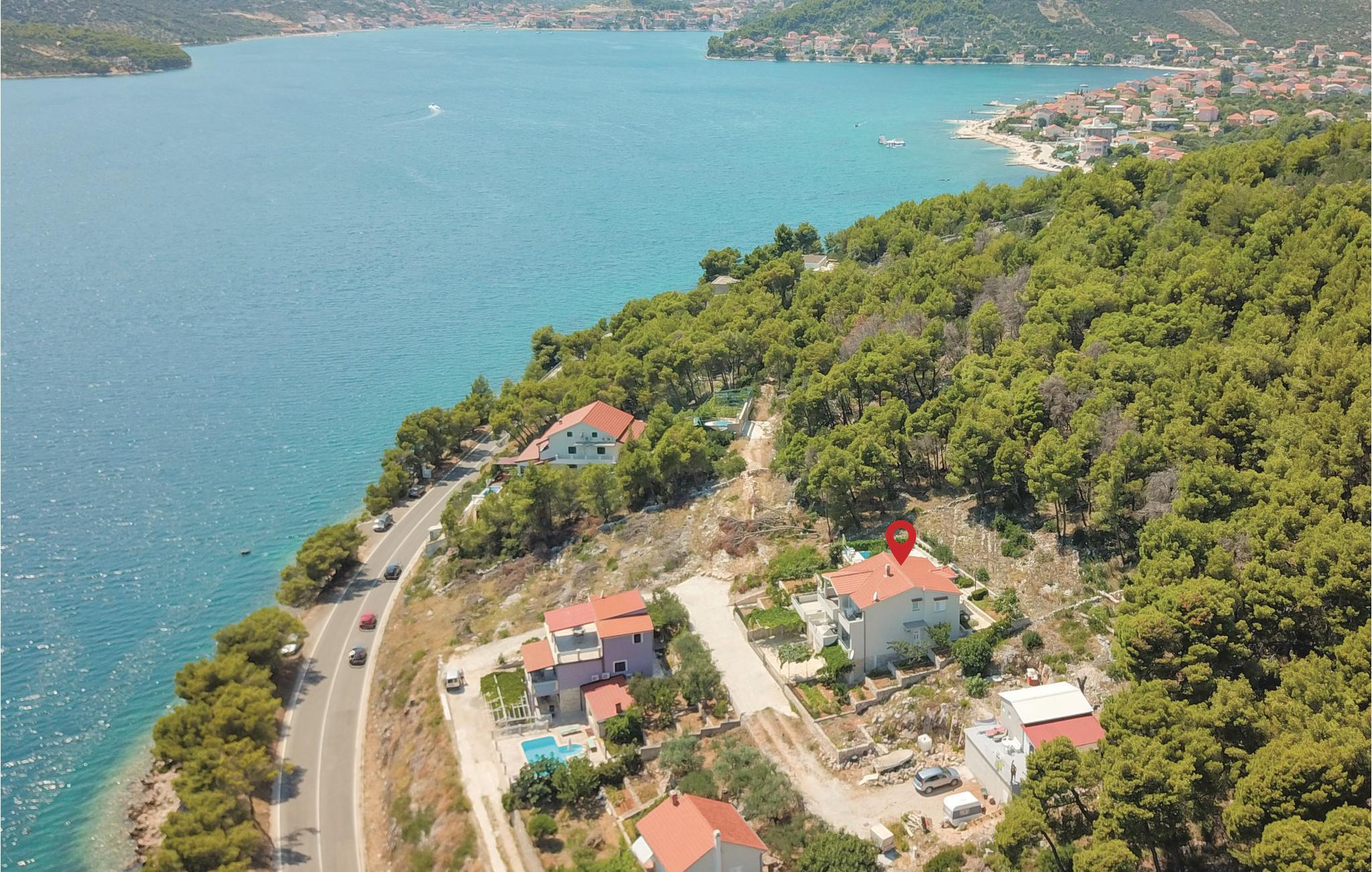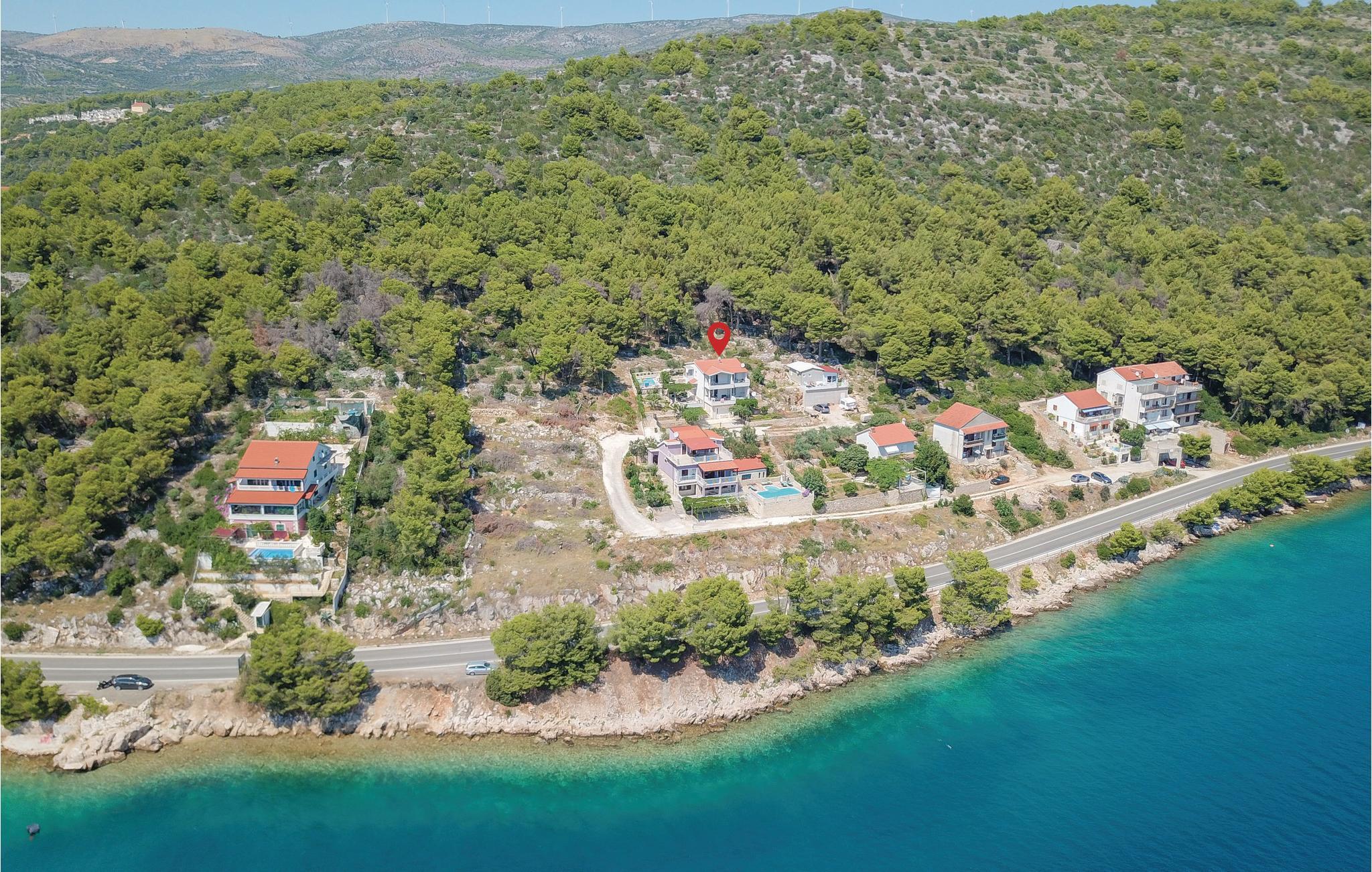 Dette vakkert møblerte feriehuset ligger i en liten og rolig landsby på en høyde. Det er omgitt av natur og bare 80 m skiller deg fra det krystallklare havet. Feriehuset er spredt over to etasjer, som er forbundet med utvendige trapper, noe som gjør det ideelt for flere familier å tilbringe ferien sammen. Forfriskning finner du i bassenget ved siden av huset, hvorfra du har en flott panoramautsikt over havet. Gamlebyen i Trogir, som er på UNESCOs verdensarvliste, ligger bare 8 km unna. De siste 150 m av adkomstveien er ikke asfaltert. I tillegg til en 20 m² garasje er det 3 P-plasser.