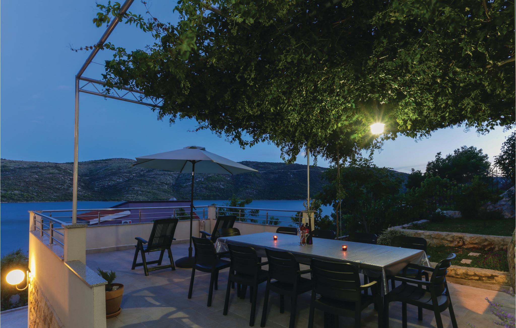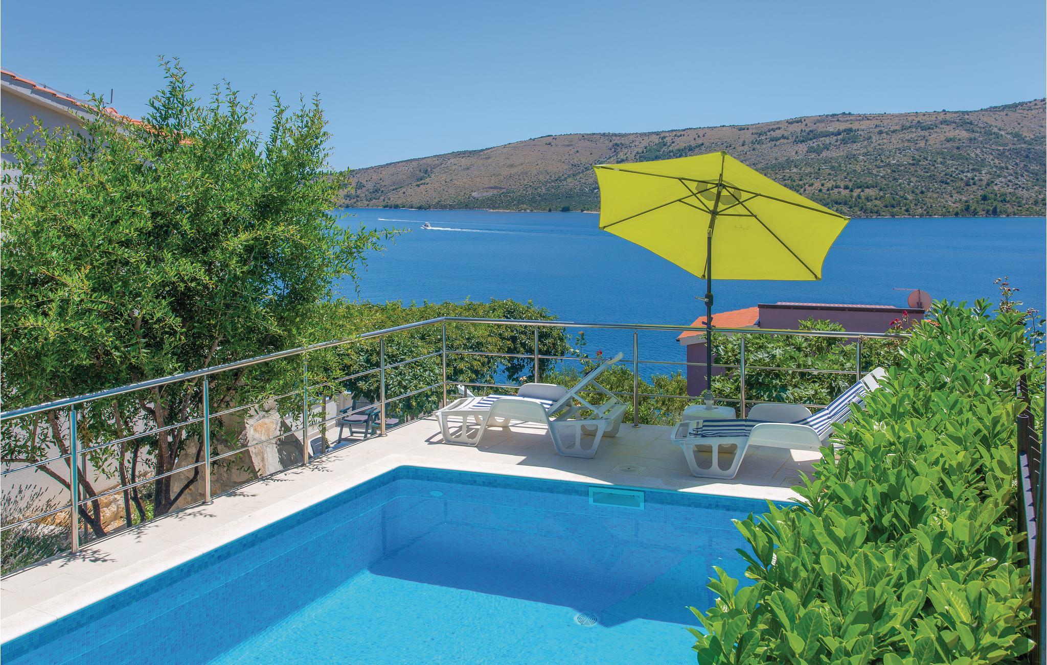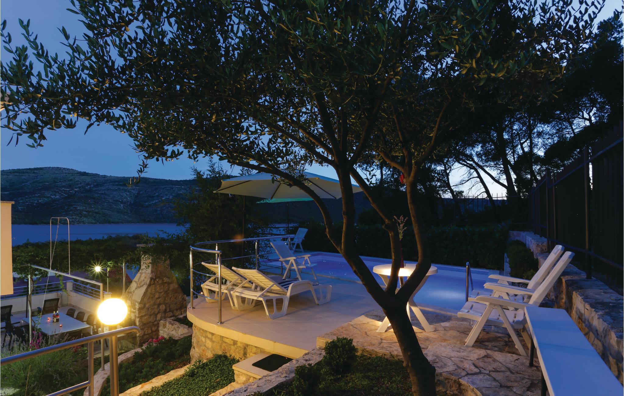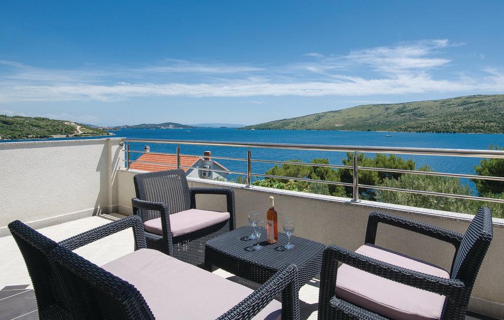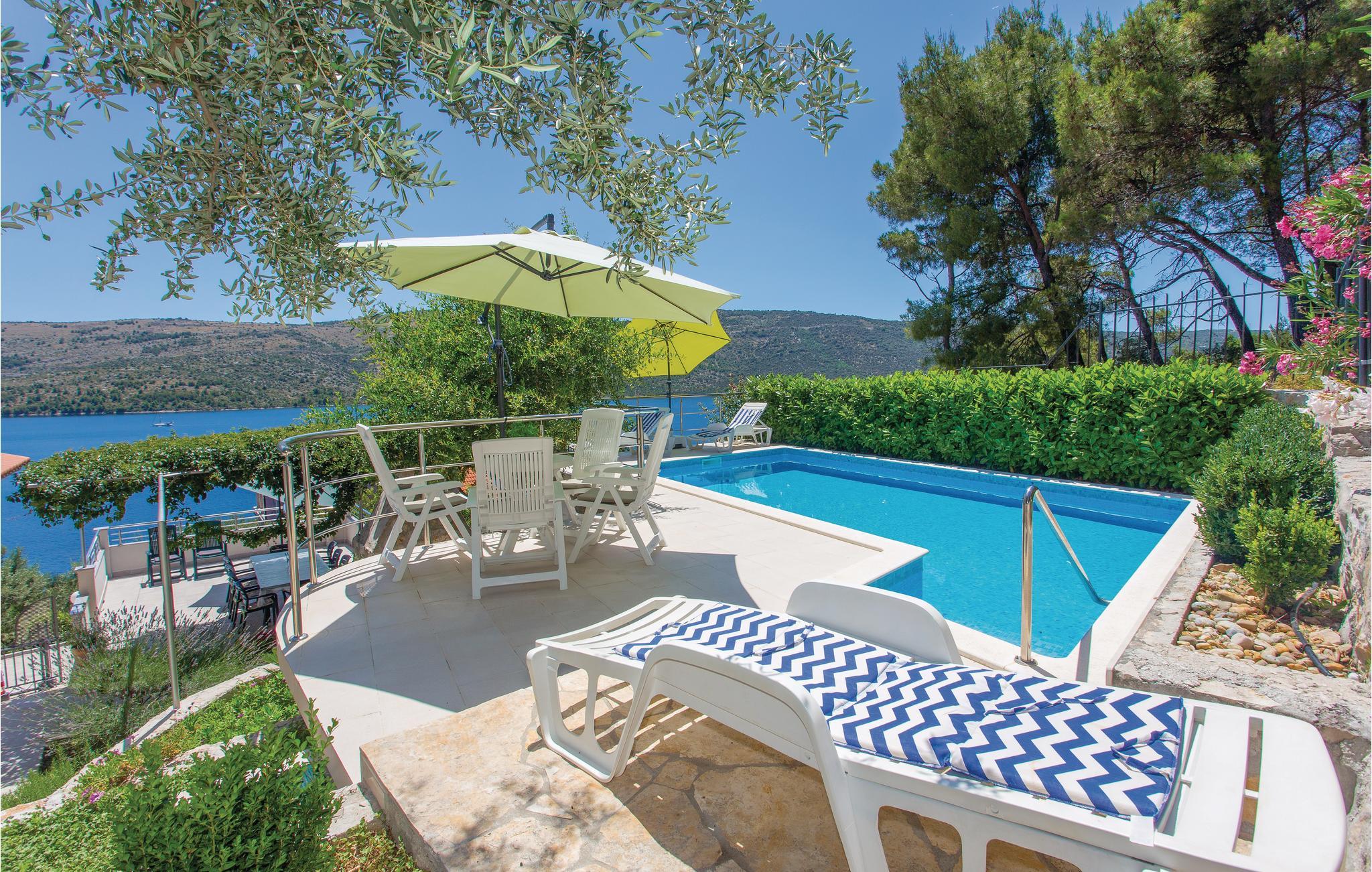 Dette vakkert møblerte feriehuset ligger i en liten og rolig landsby på en høyde. Det er omgitt av natur og bare 80 m skiller deg fra det krystallklare havet. Feriehuset er spredt over to etasjer, som er forbundet med utvendige trapper, noe som gjør det ideelt for flere familier å tilbringe ferien sammen. Forfriskning finner du i bassenget ved siden av huset, hvorfra du har en flott panoramautsikt over havet. Gamlebyen i Trogir, som er på UNESCOs verdensarvliste, ligger bare 8 km unna. De siste 150 m av adkomstveien er ikke asfaltert. I tillegg til en 20 m² garasje er det 3 P-plasser.