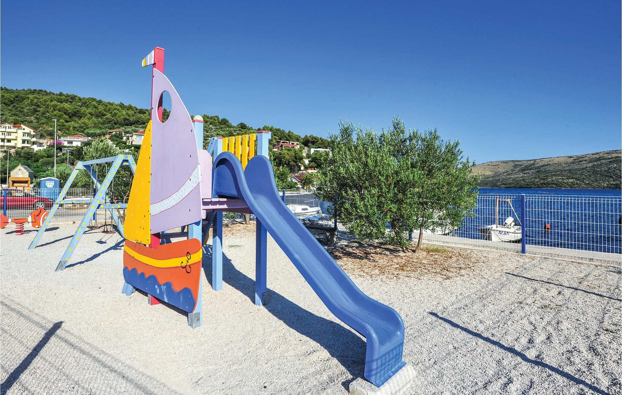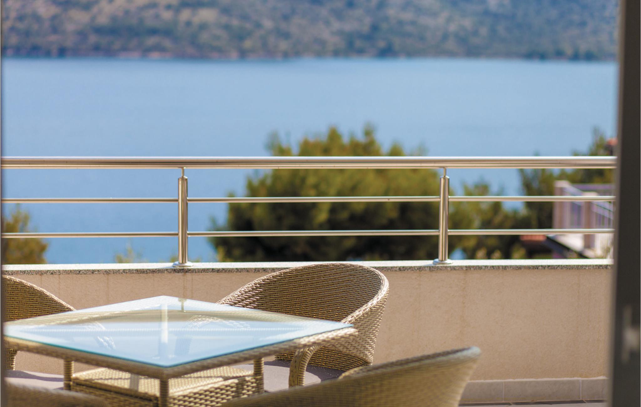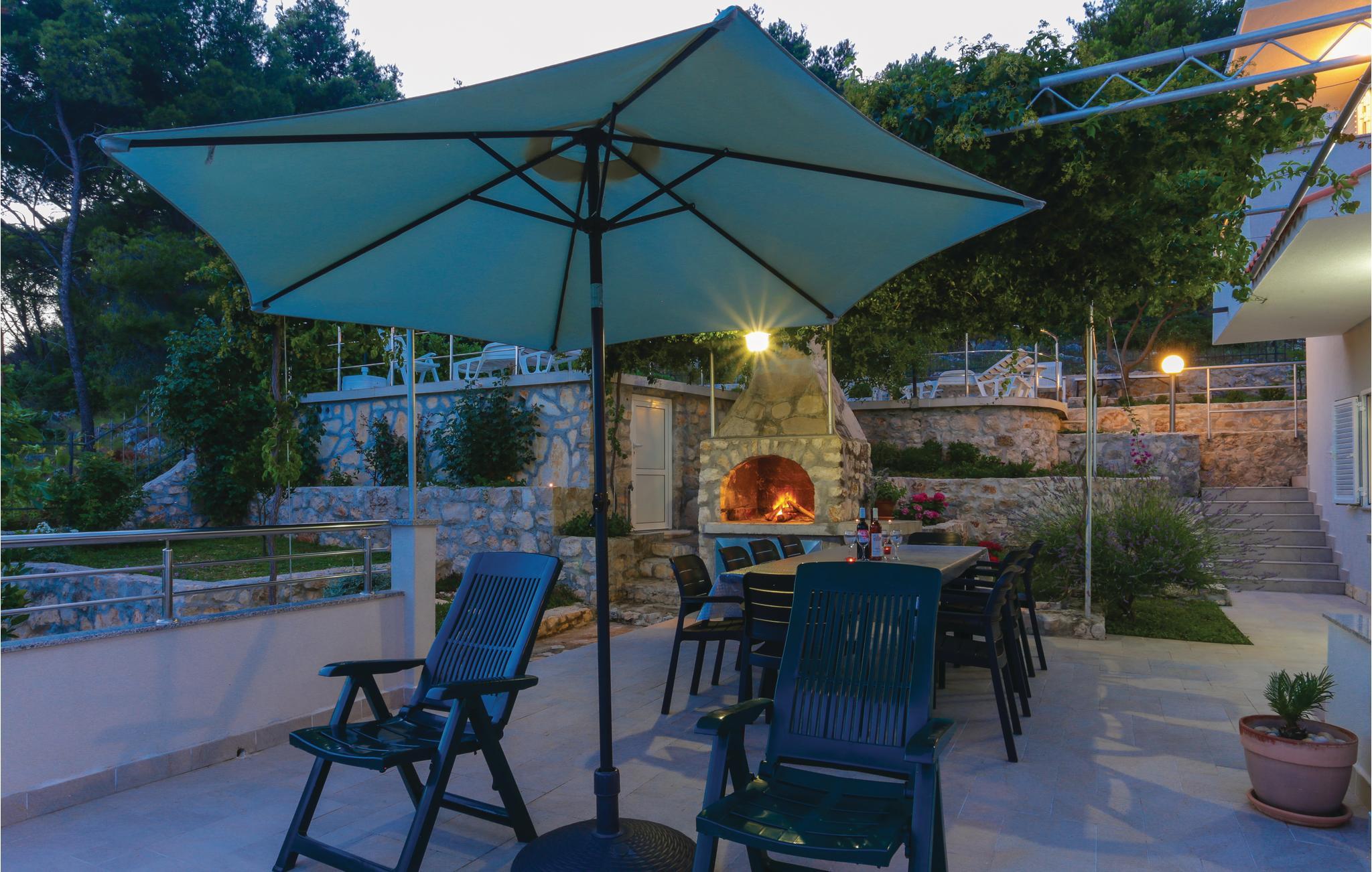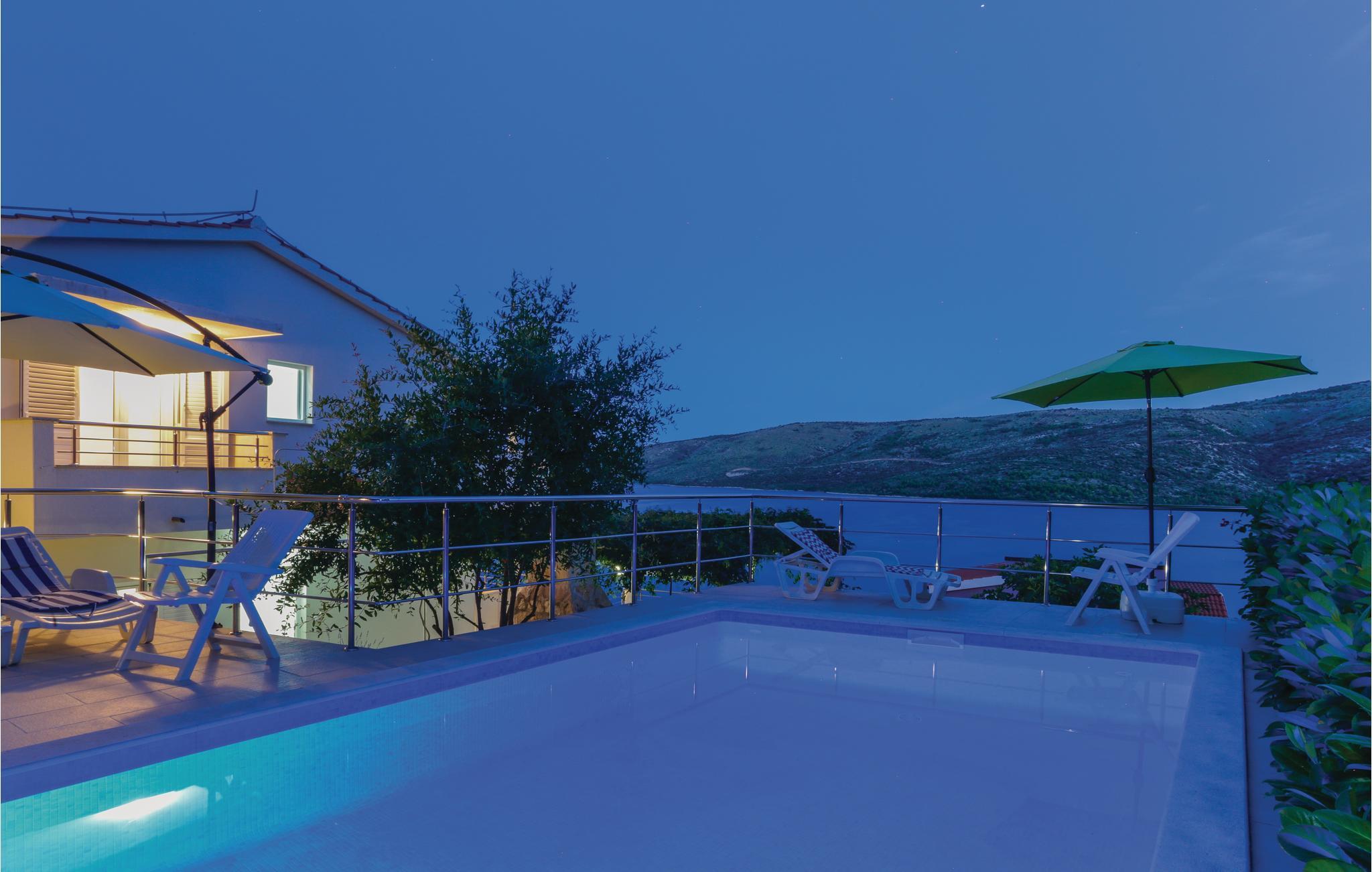 Dette vakkert møblerte feriehuset ligger i en liten og rolig landsby på en høyde. Det er omgitt av natur og bare 80 m skiller deg fra det krystallklare havet. Feriehuset er spredt over to etasjer, som er forbundet med utvendige trapper, noe som gjør det ideelt for flere familier å tilbringe ferien sammen. Forfriskning finner du i bassenget ved siden av huset, hvorfra du har en flott panoramautsikt over havet. Gamlebyen i Trogir, som er på UNESCOs verdensarvliste, ligger bare 8 km unna. De siste 150 m av adkomstveien er ikke asfaltert. I tillegg til en 20 m² garasje er det 3 P-plasser.