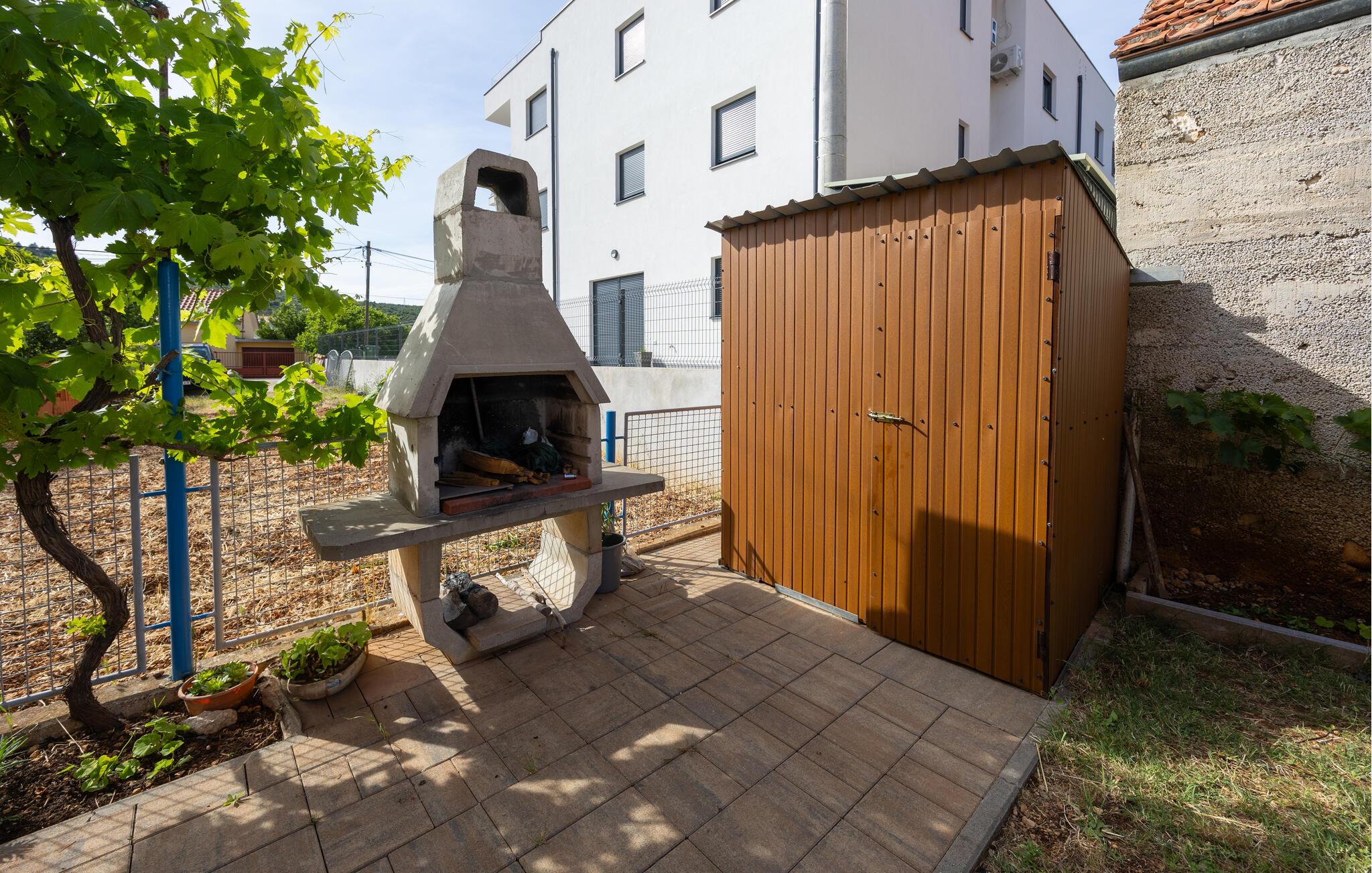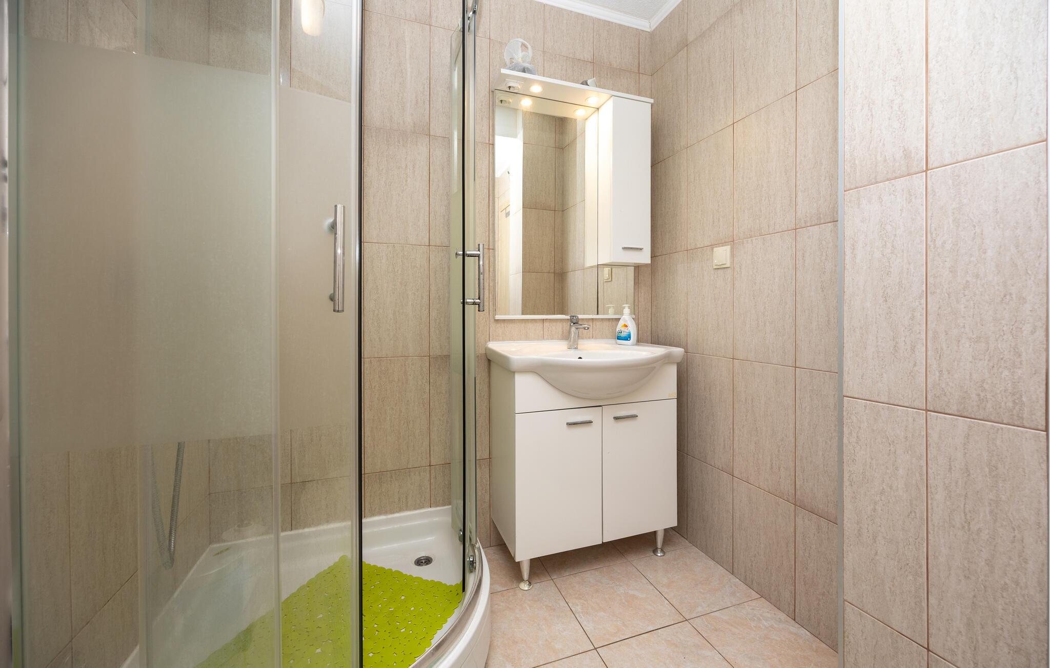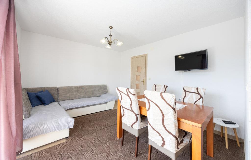 Ferieleiligheten ligger i første etasje i en vakker boligbygning rett ved siden av stranden. Herfra kan du nyte den pittoreske utsikten over havet og de grønne åsene i Dalmatia, slappe av med en god kopp kaffe eller lage mat sammen med dine nærmeste på det praktisk utstyrte kjøkkenet.