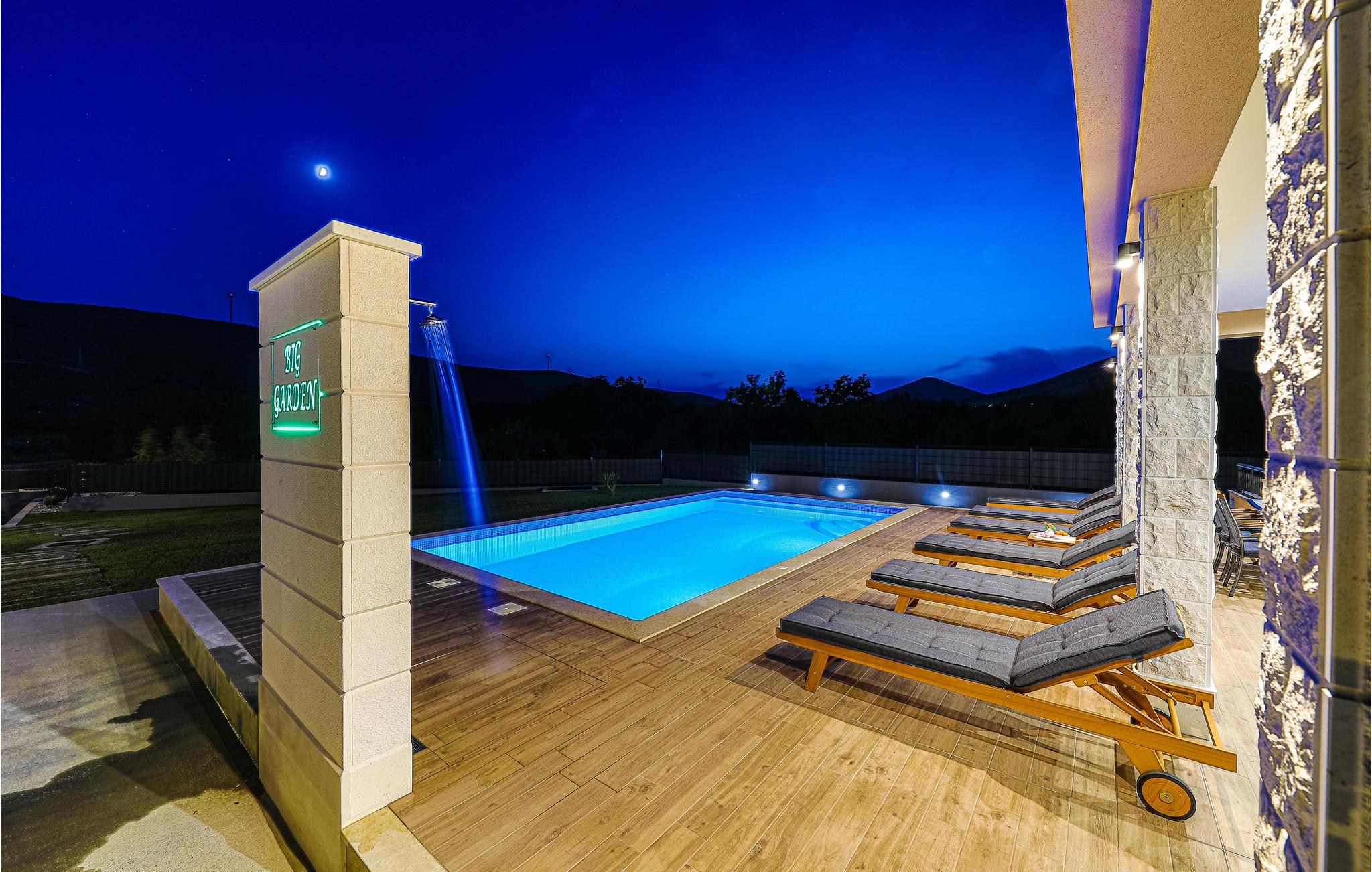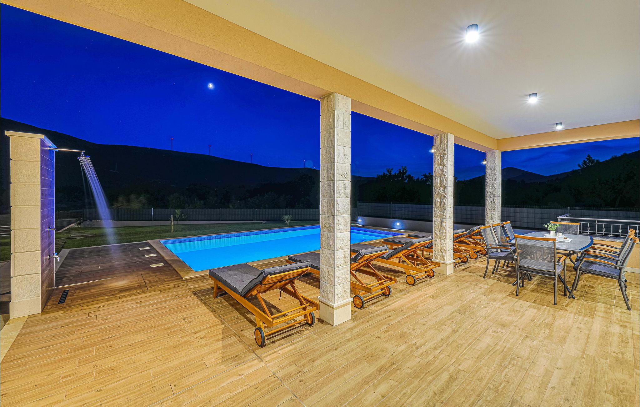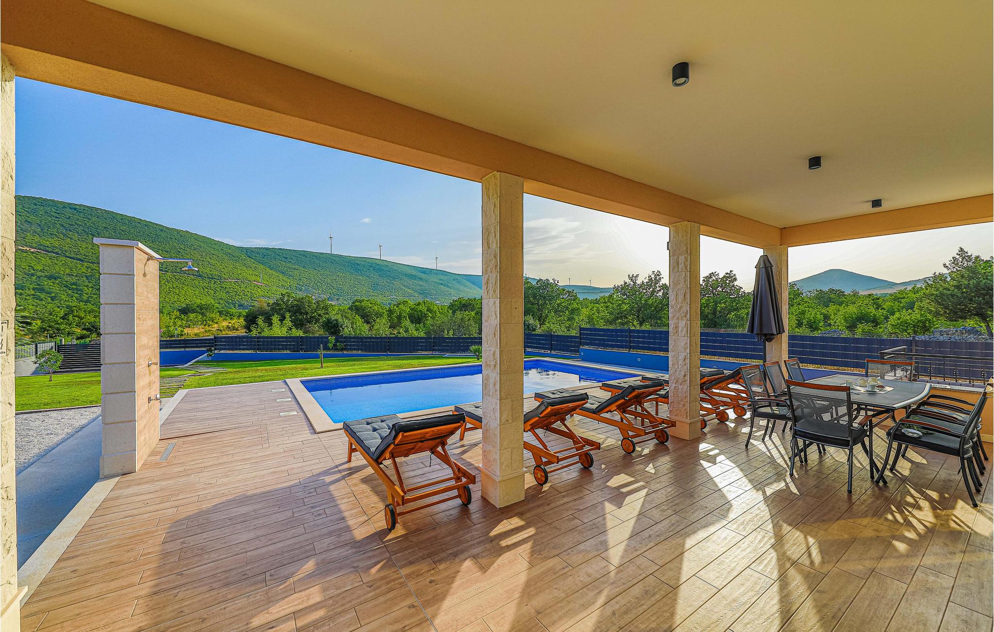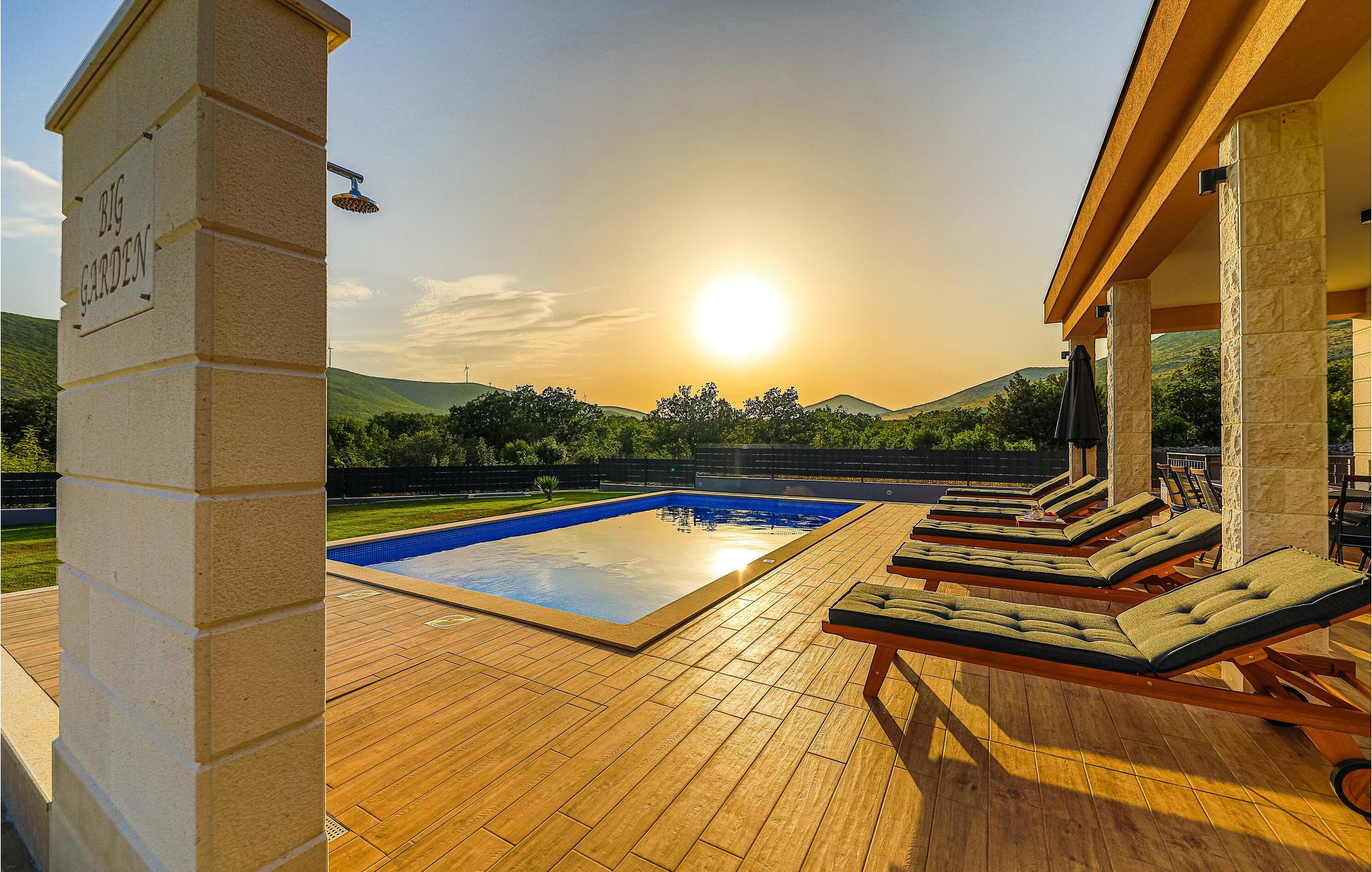 Det attraktive uteområdet til huset tilbyr mange muligheter for å tilbringe litt kvalitetstid utendørs. Nyt solen på fritiden på forskjellige terrasser og forfrisk deg i det private bassenget med utsikt over fjellene. Tilbered deilige retter på grillen og avslutt dagen i det fri.
